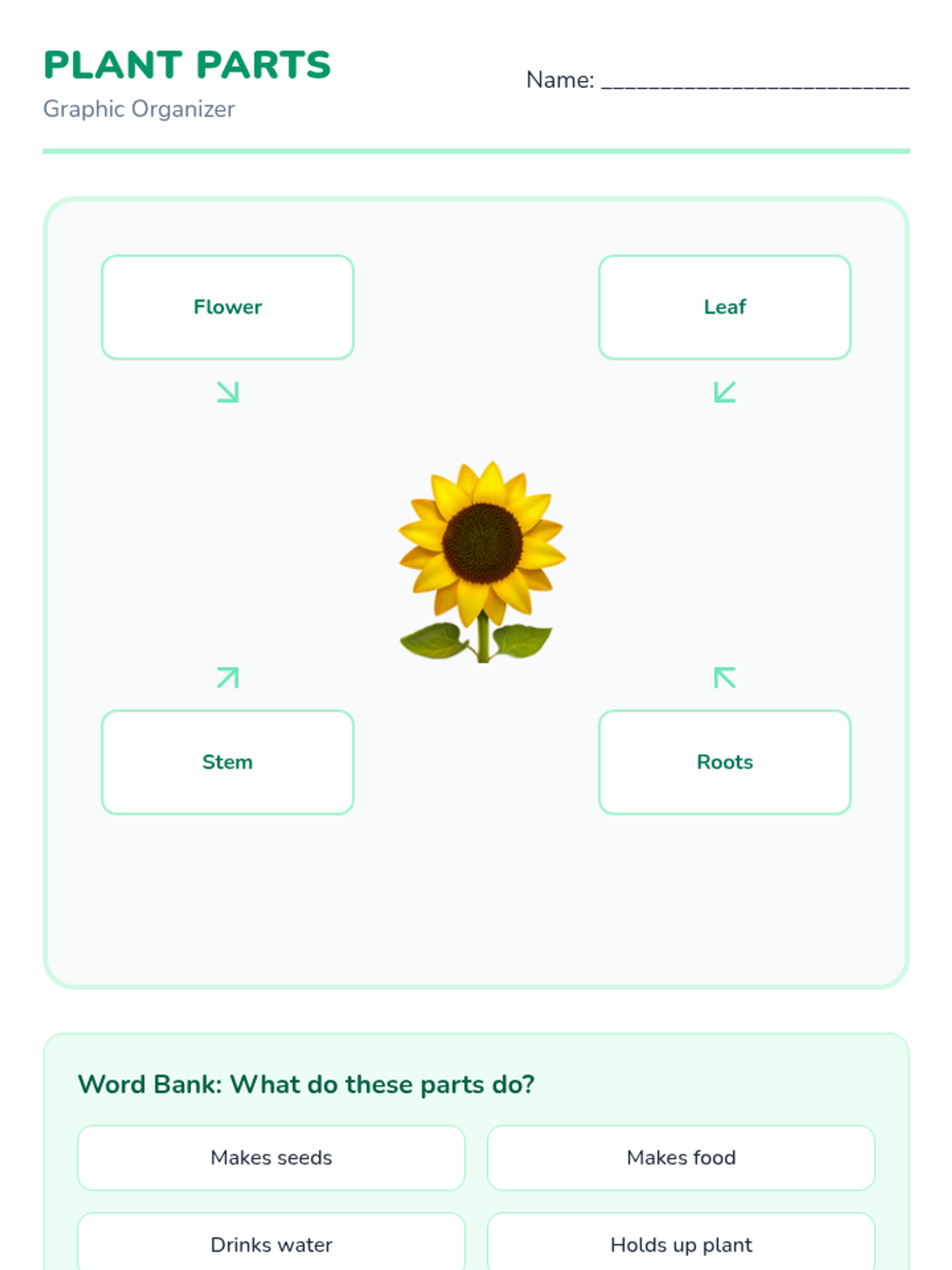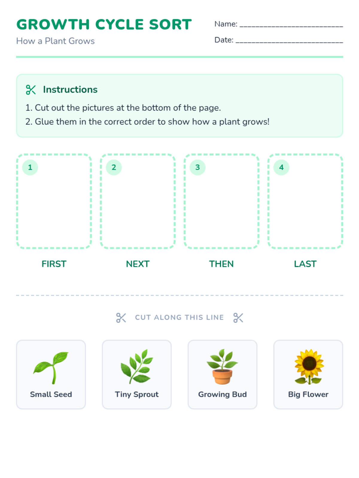 Students explore how a plant grows from a seed to a flower through visual sorting, tracing, and structured graphic organizers.