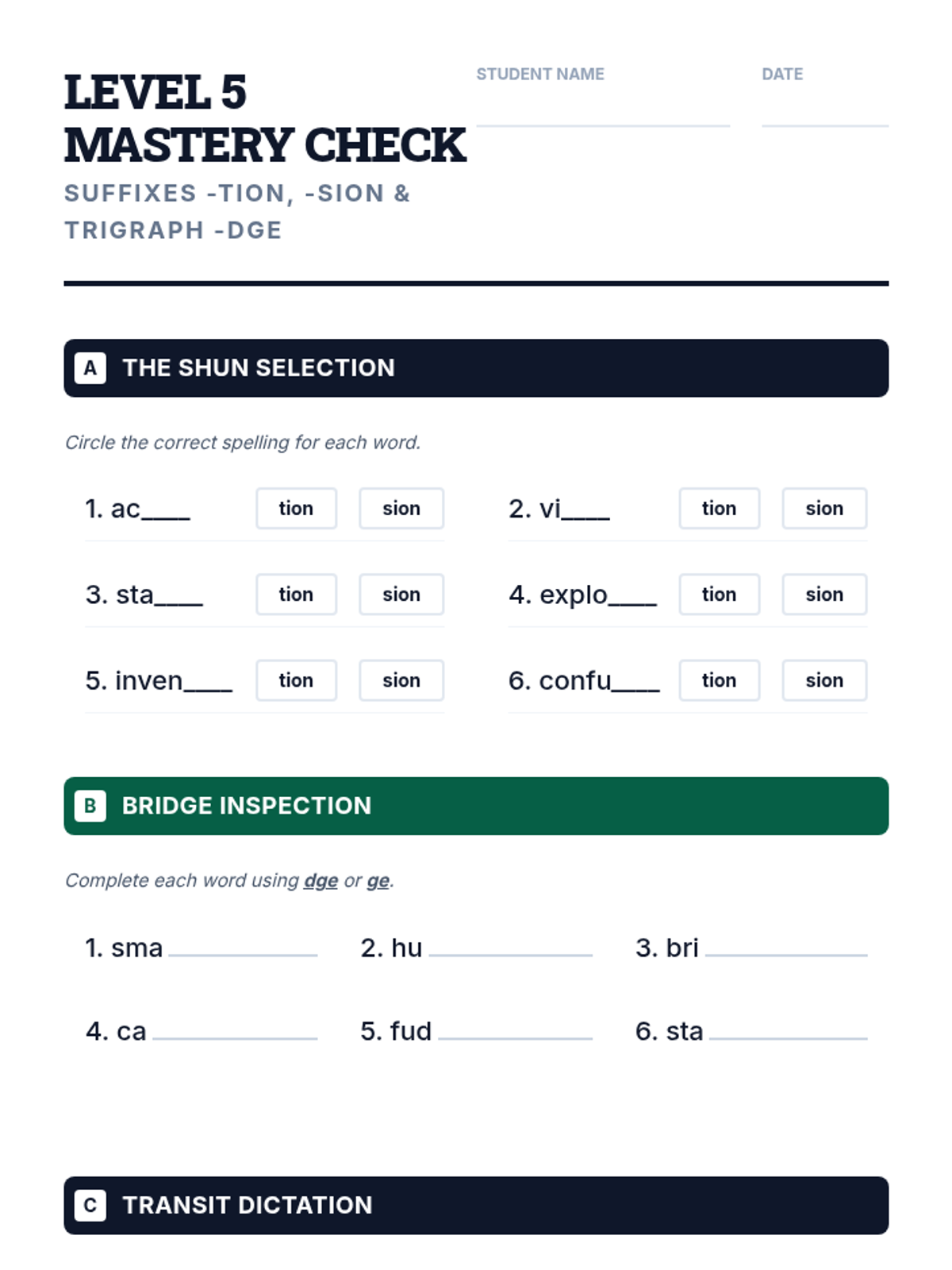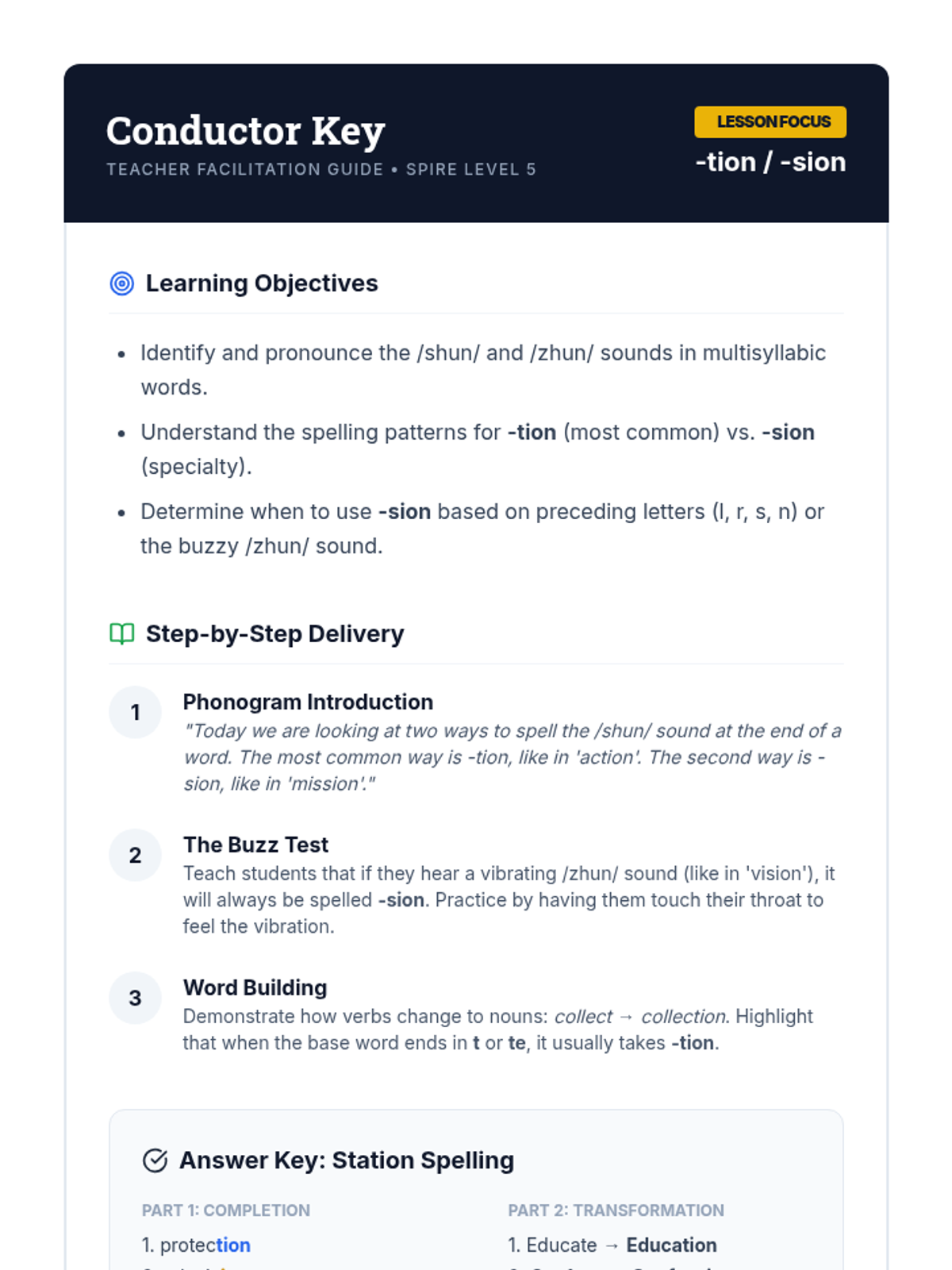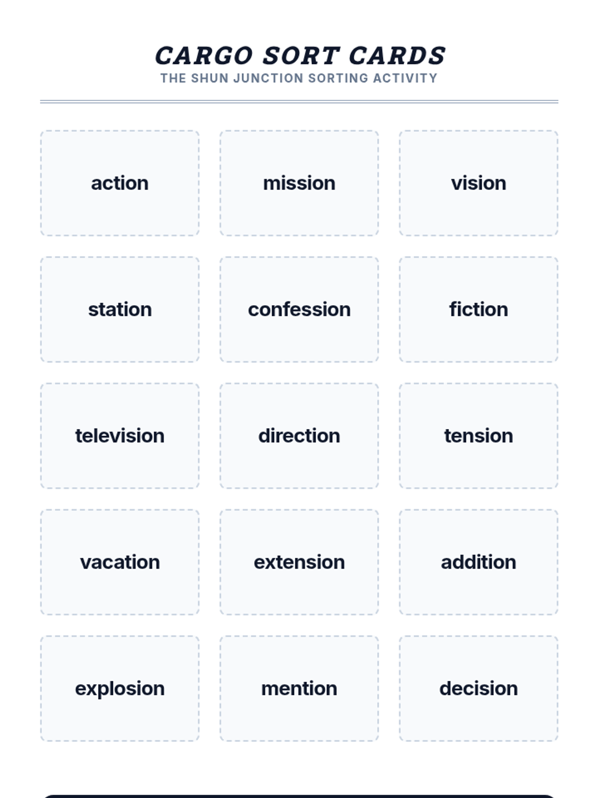 An in-depth look at the 'shun' sound spelled -tion and -sion. Students learn to distinguish between these suffixes based on base words and phonetic cues.