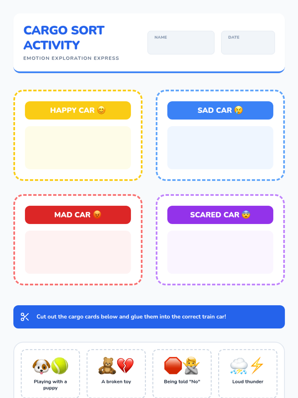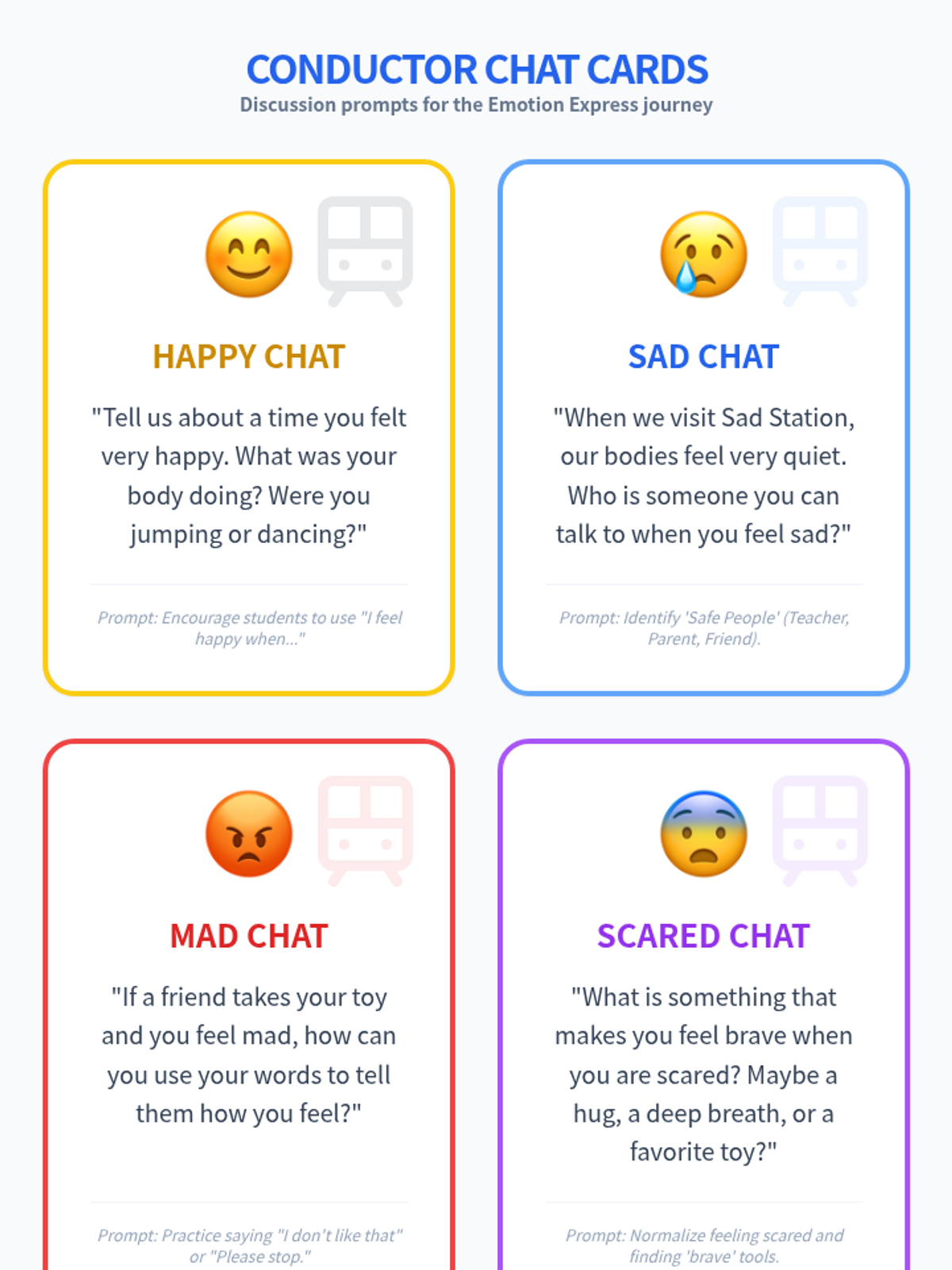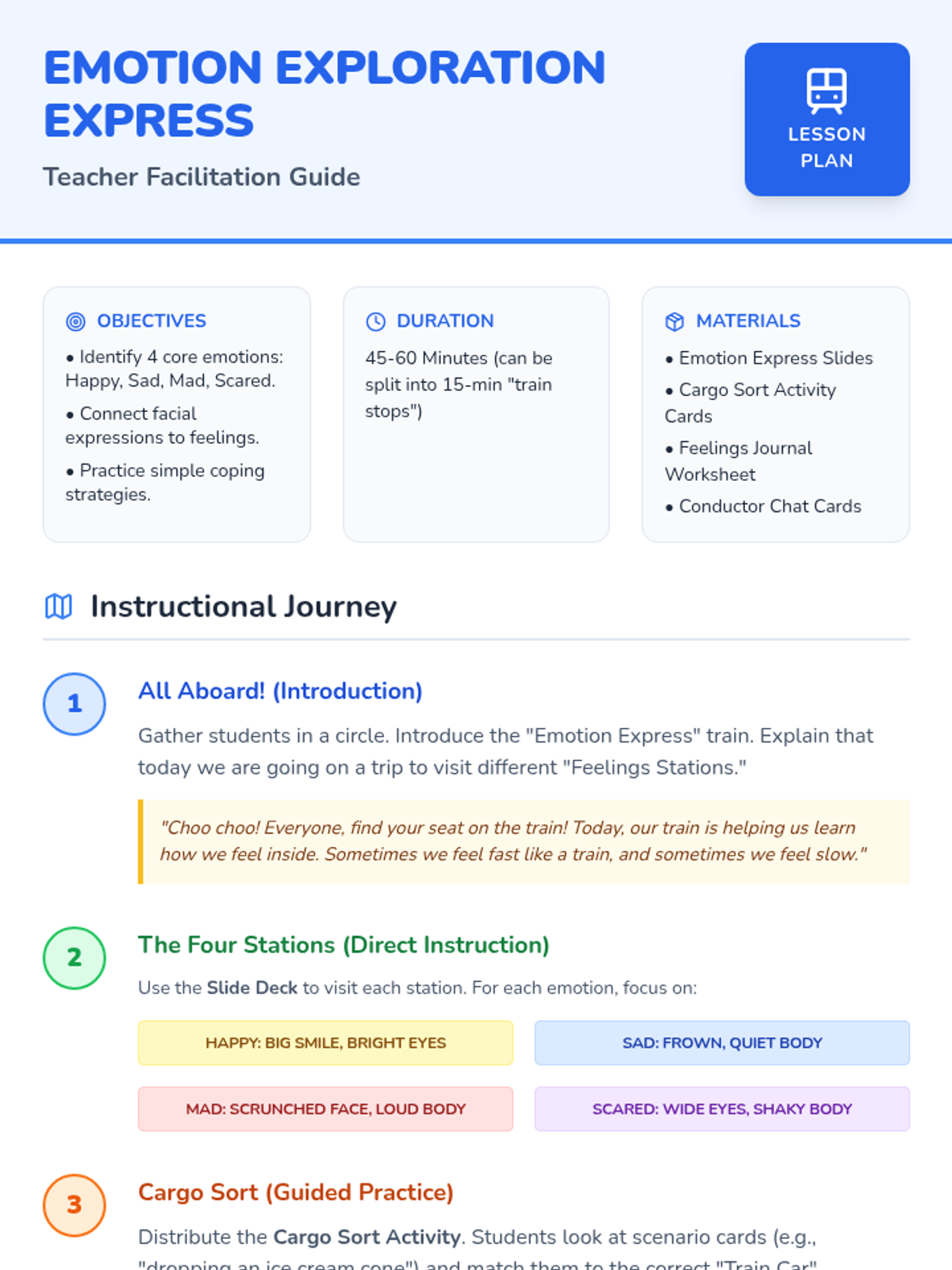 A foundational emotional literacy lesson for K-2 students with special needs, using a train-themed journey to identify and express core emotions through visual aids and interactive scenarios.