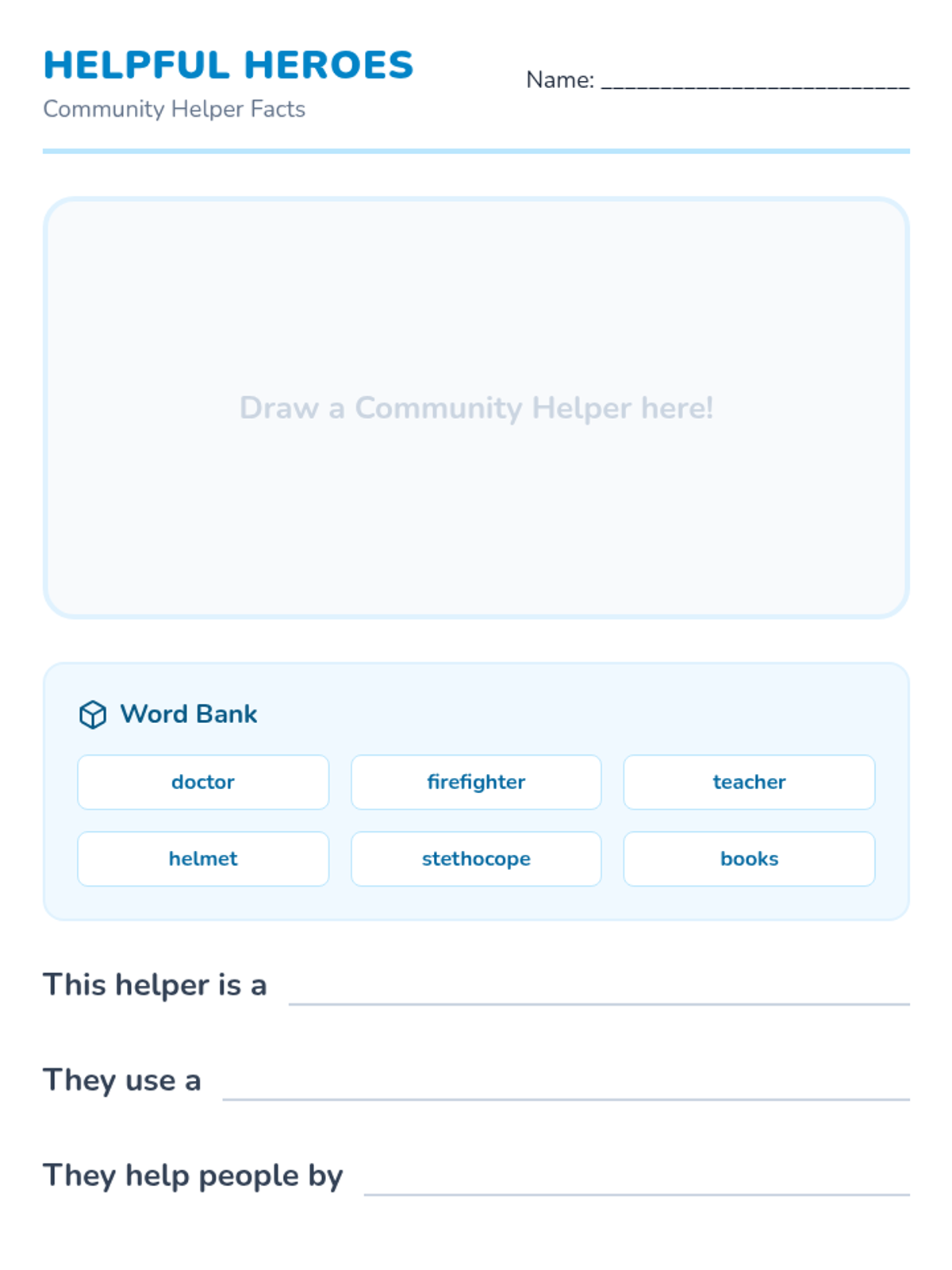 Students identify various community helpers and their roles using sentence starters and matching activities.