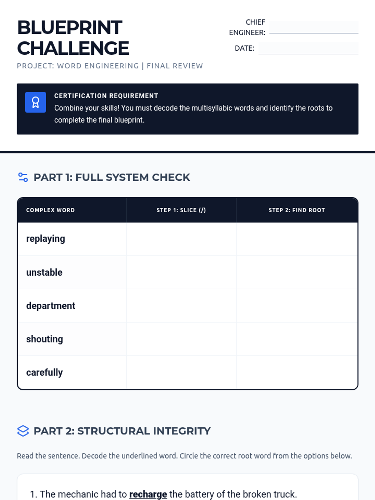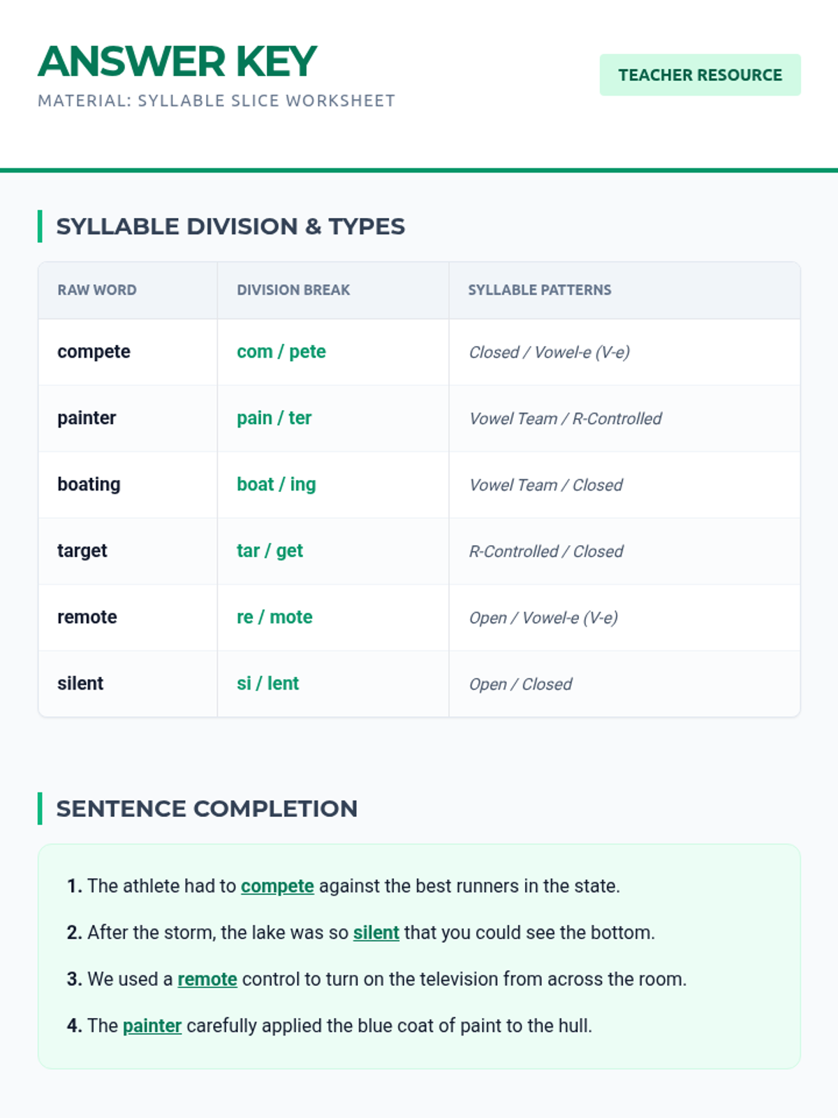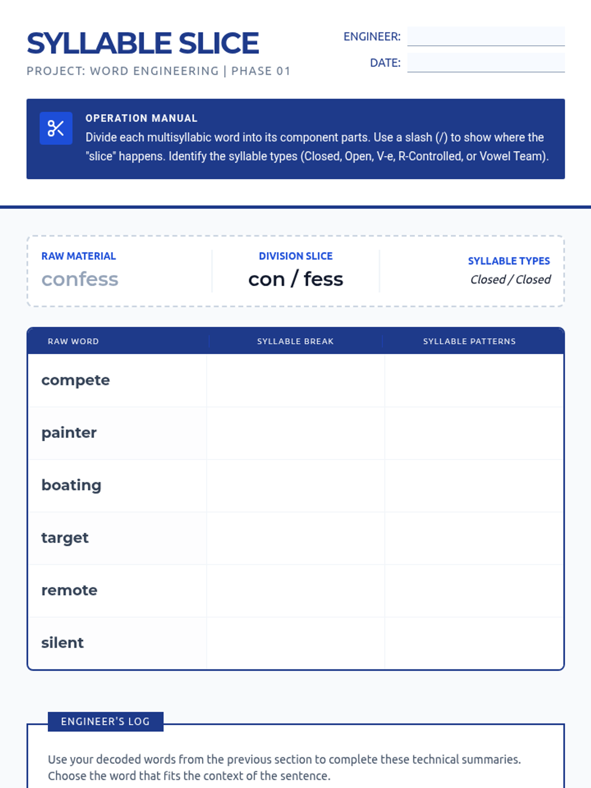 Focuses on the mechanics of dividing multisyllabic words using SPIRE Level 3 patterns like VCCV and VCV. Students learn to 'slice' words into manageable chunks for decoding.