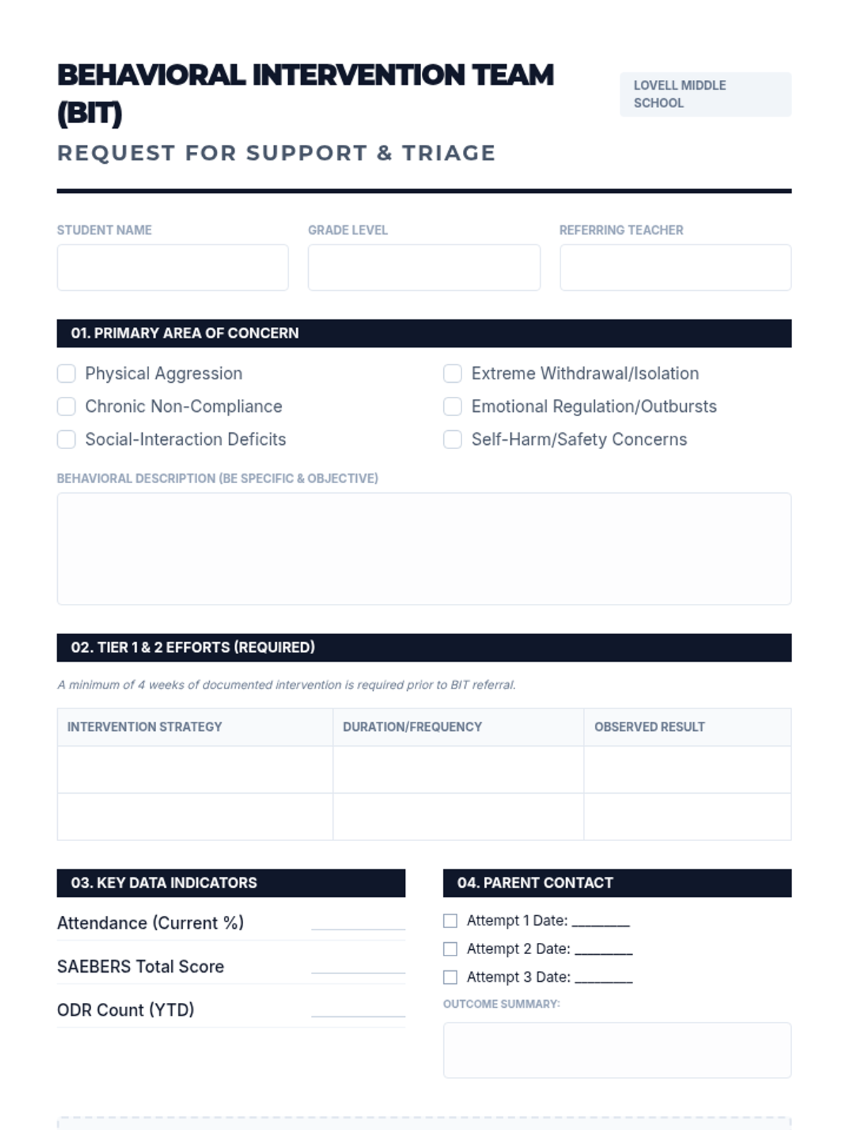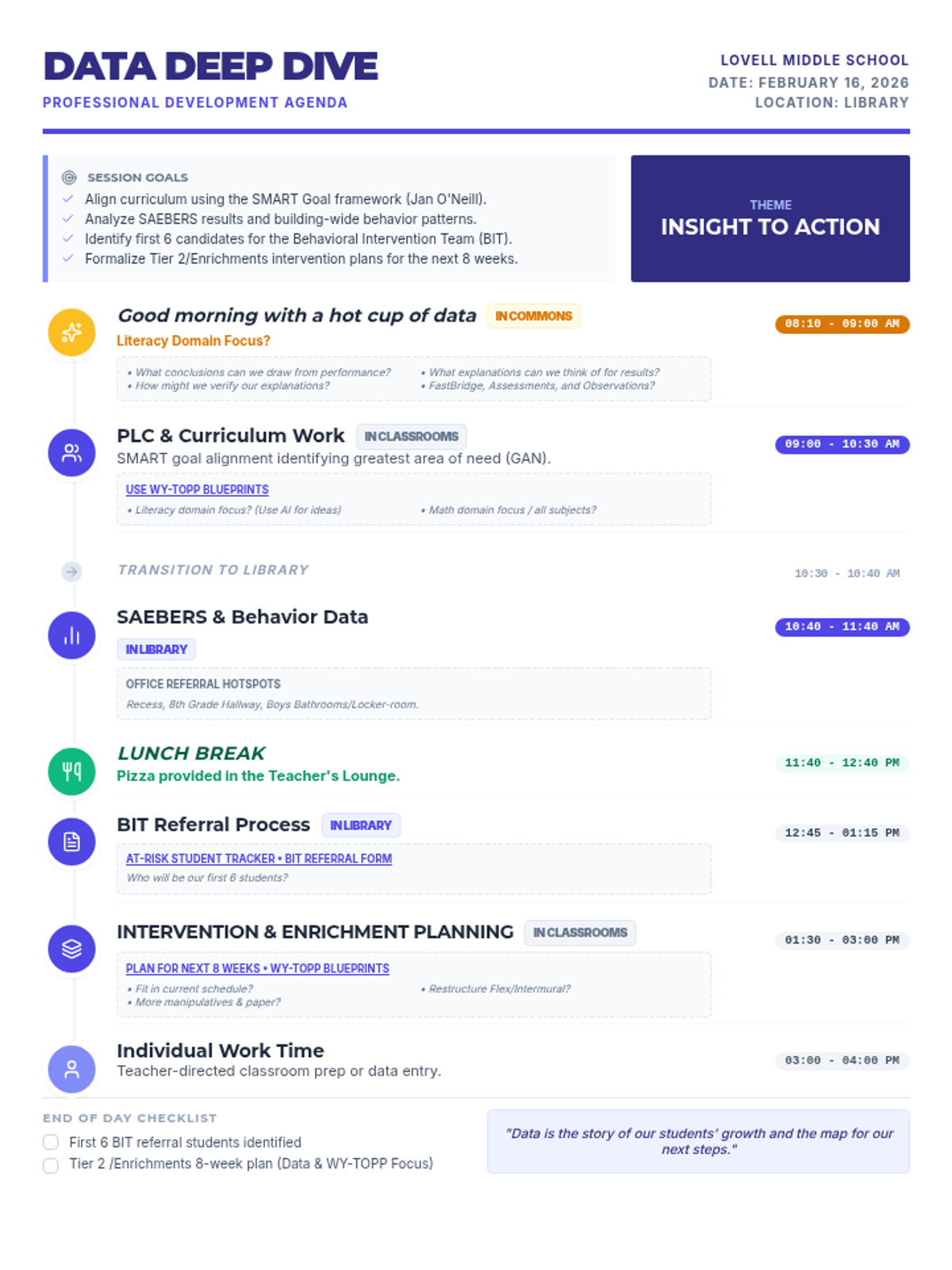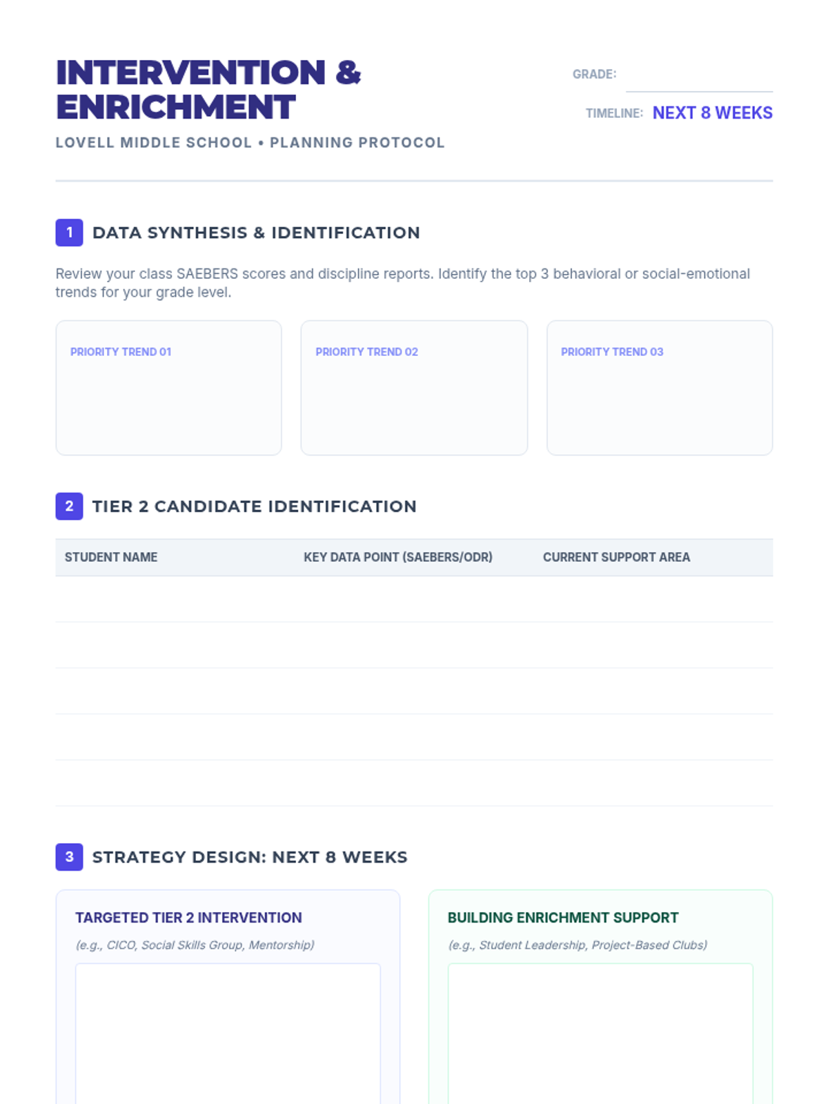 A professional development session focused on analyzing behavior data, social-emotional screening results, and developing intervention plans. Teachers will collaborate in PLCs and grade-level teams to create data-driven enrichment and support strategies.