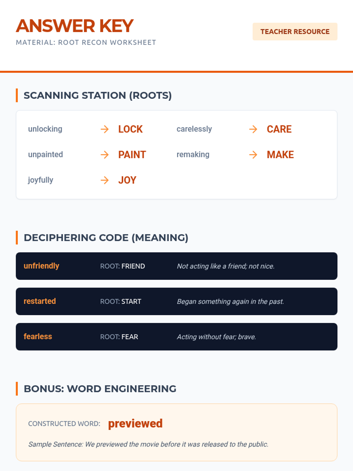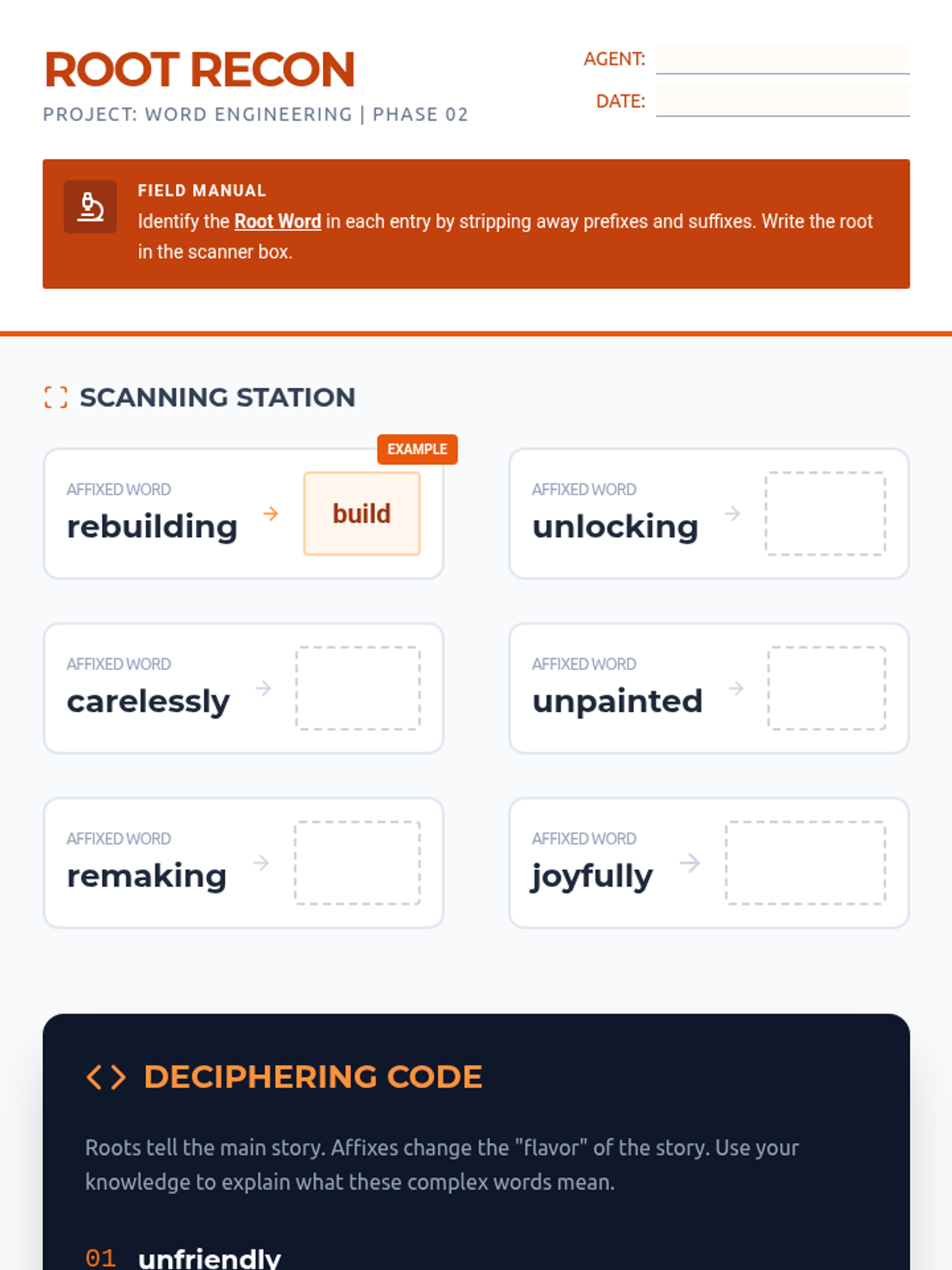 Explores how prefixes and suffixes are added to base words. Students practice stripping away affixes to reveal the root word and its meaning.