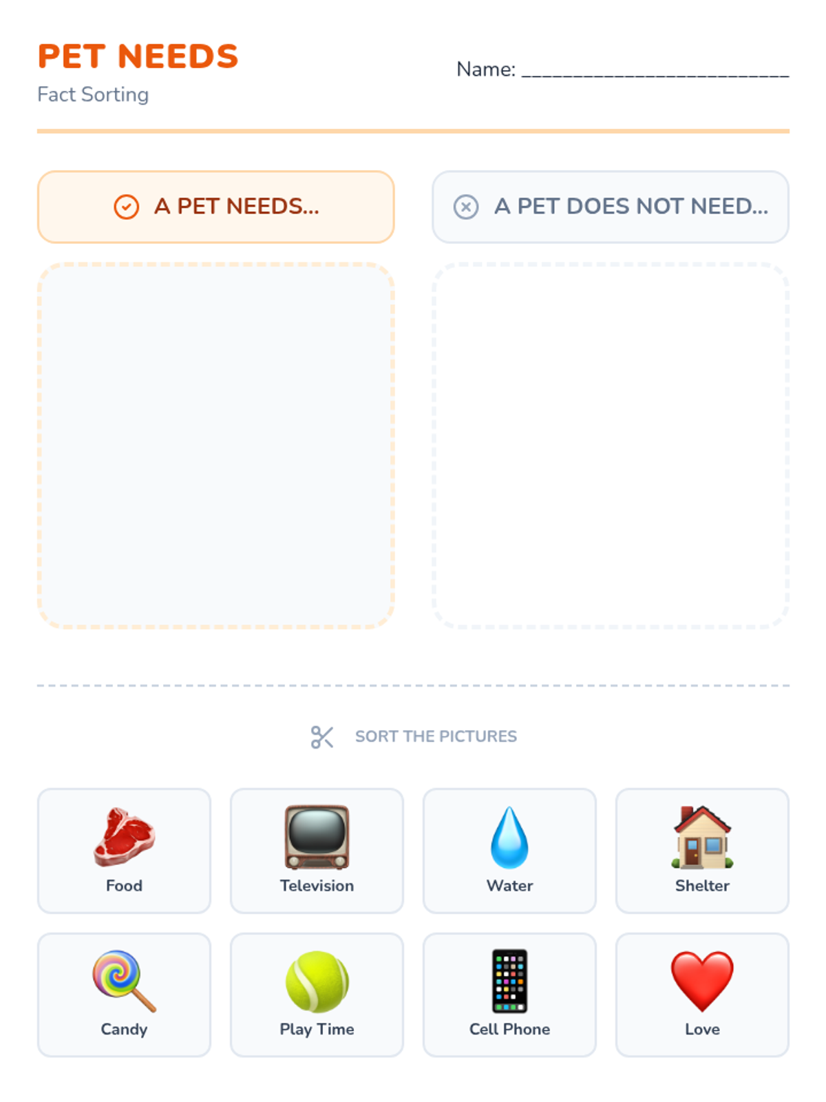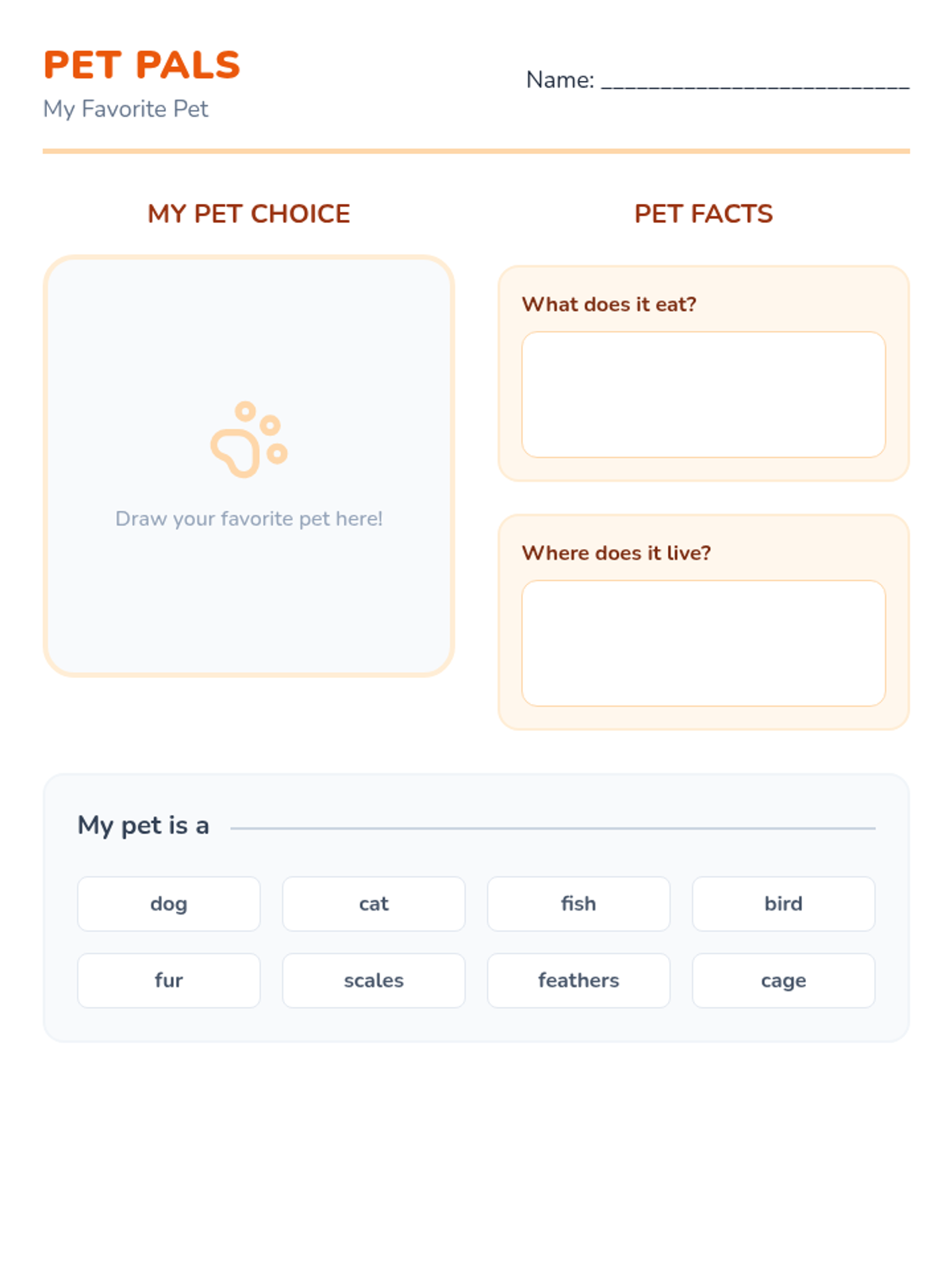 Students describe their favorite pets and pet care needs through drawing prompts and fact-based organizers.