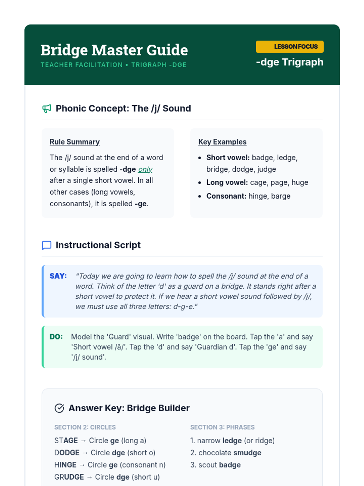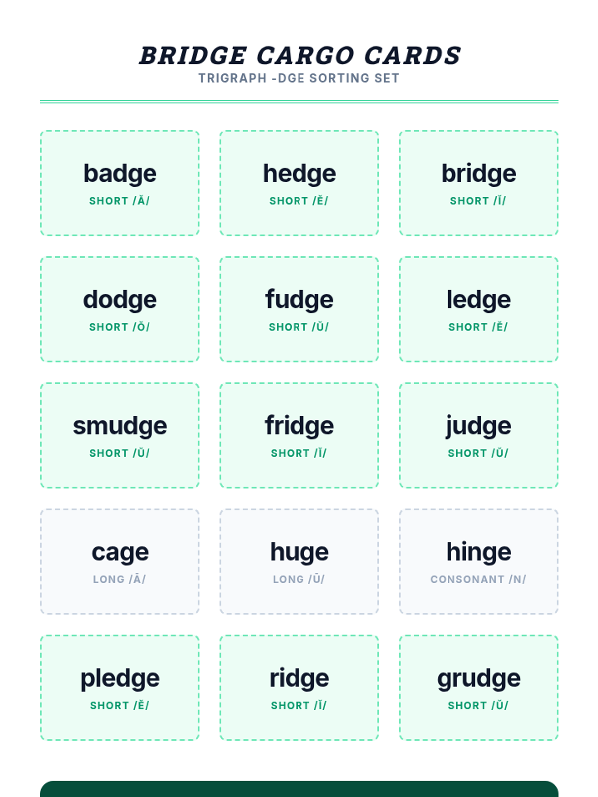 A lesson focusing on the trigraph -dge. Students learn the spelling rule that -dge is used to spell the /j/ sound immediately following a short vowel at the end of a word or syllable.