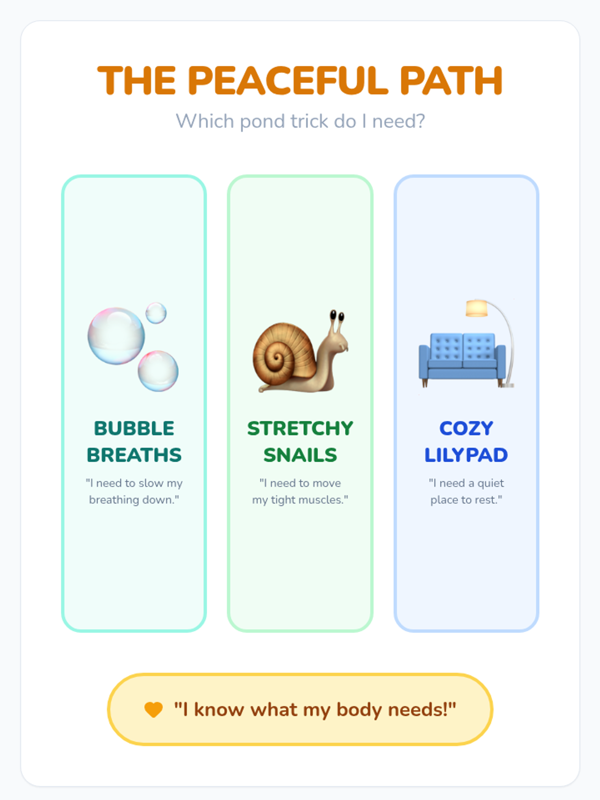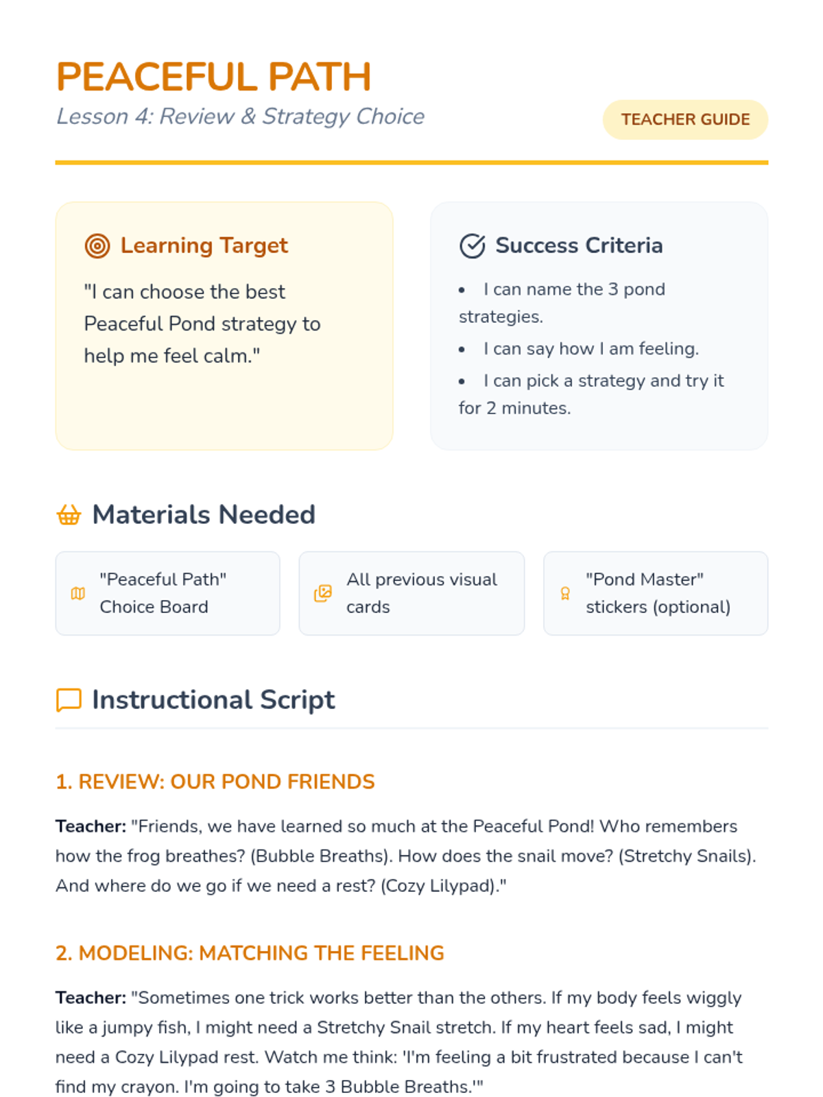 A capstone lesson where students learn to identify their feelings and select the best 'Peaceful Pond' strategy for their current needs.