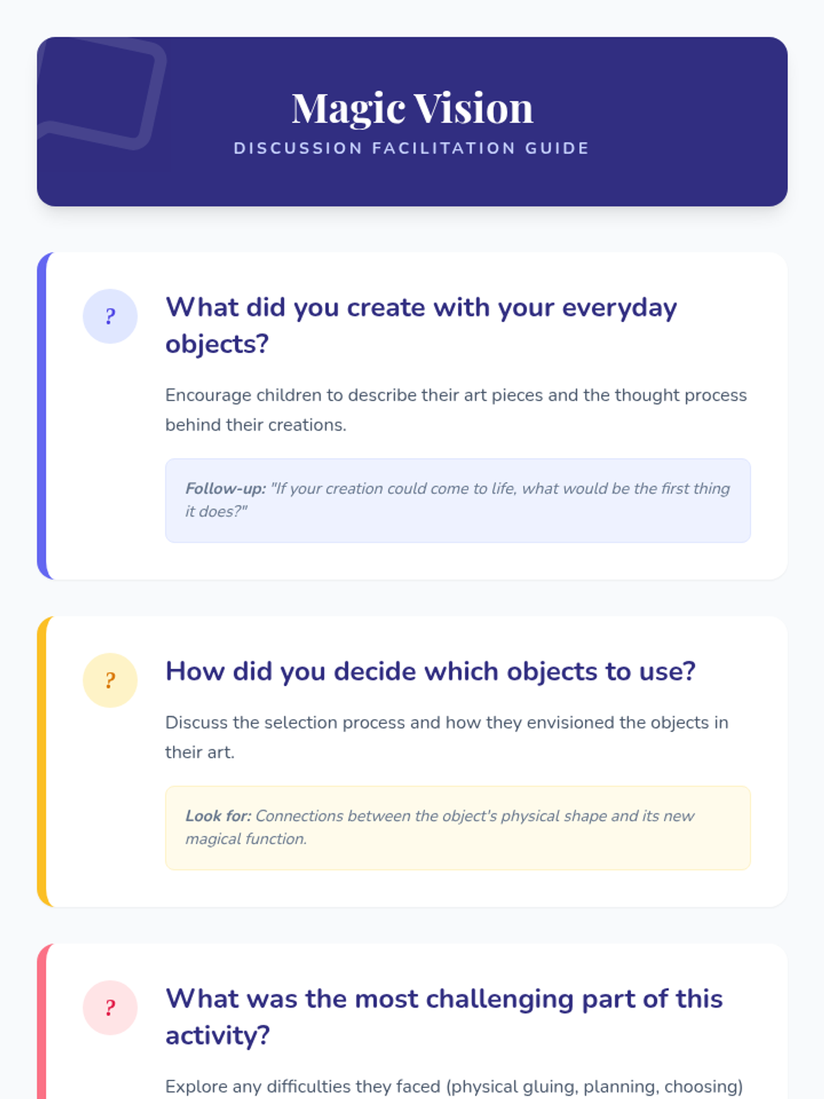 A whimsical lesson where children aged 7-8 transform ordinary, everyday objects like bottle caps and sticks into 'magical' art pieces, fostering creativity and a new perspective on the world around them.