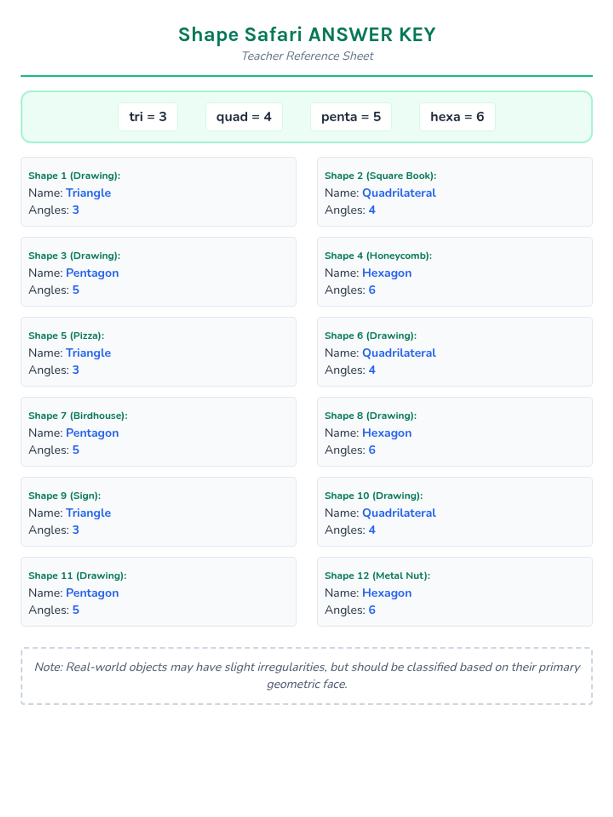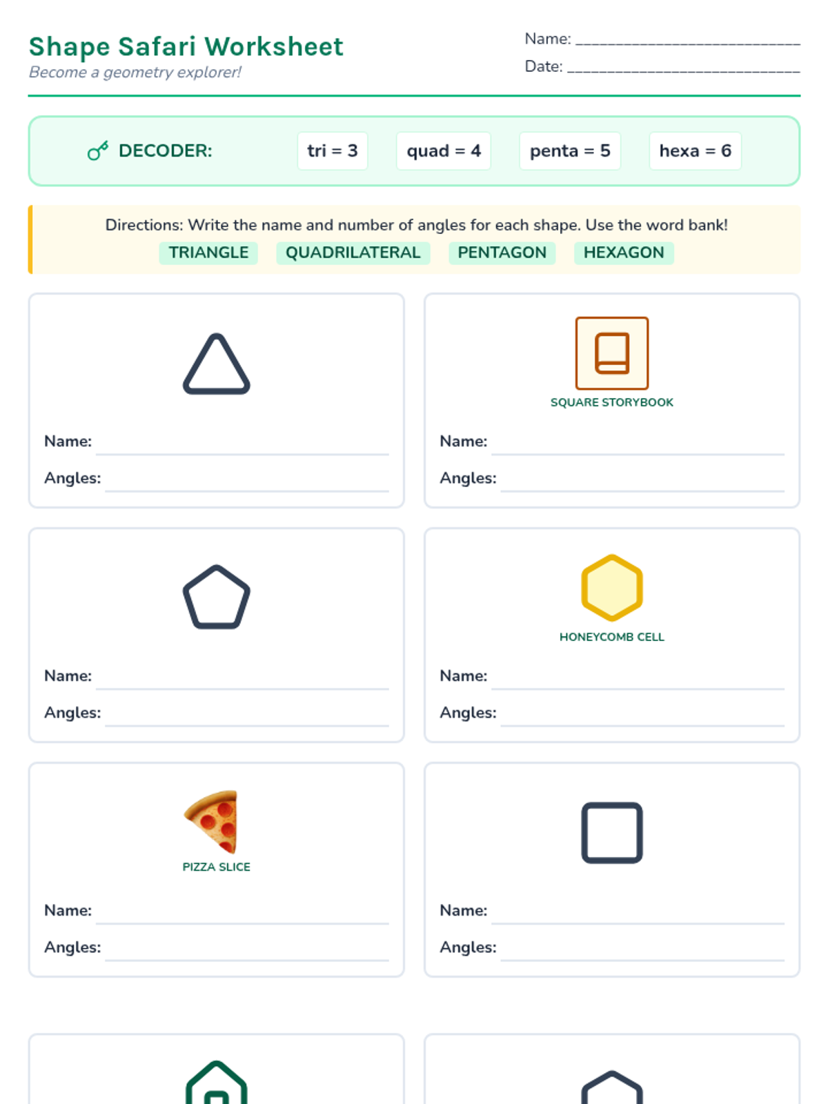 A foundational geometry lesson for 2nd graders focused on identifying and classifying triangles, quadrilaterals, pentagons, and hexagons based on their names and number of angles.