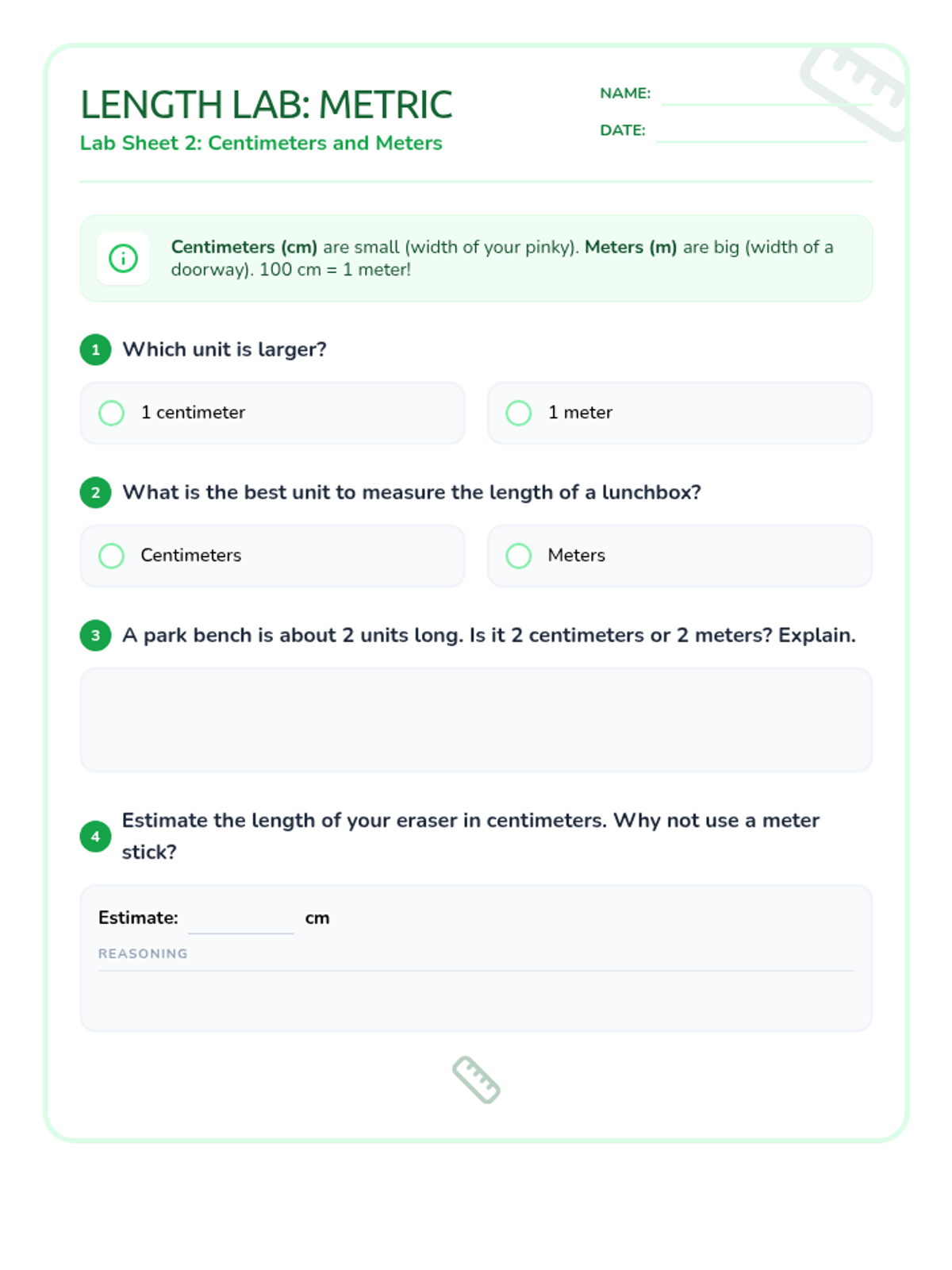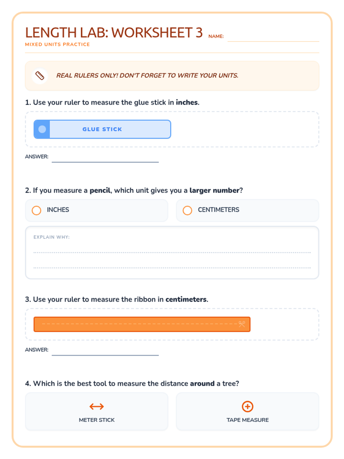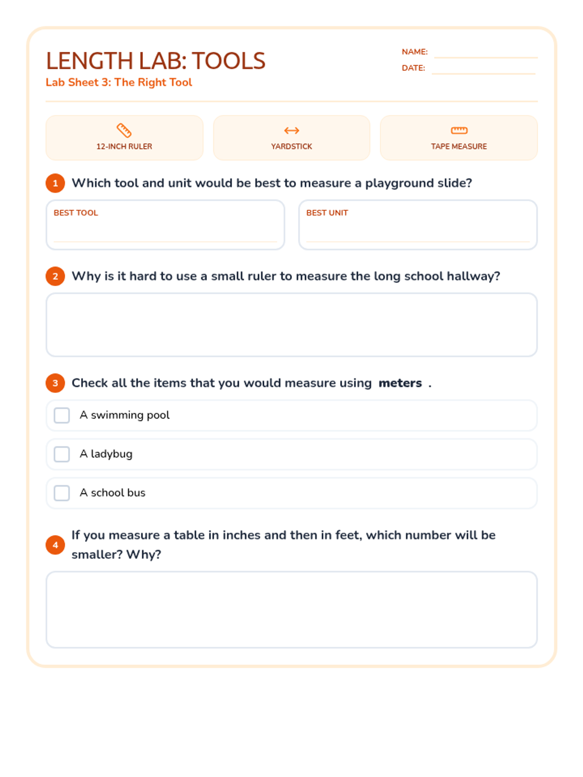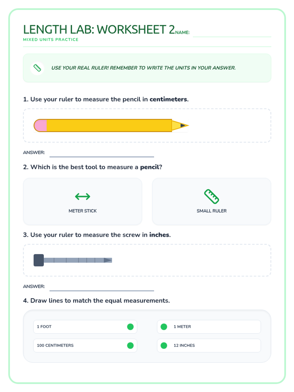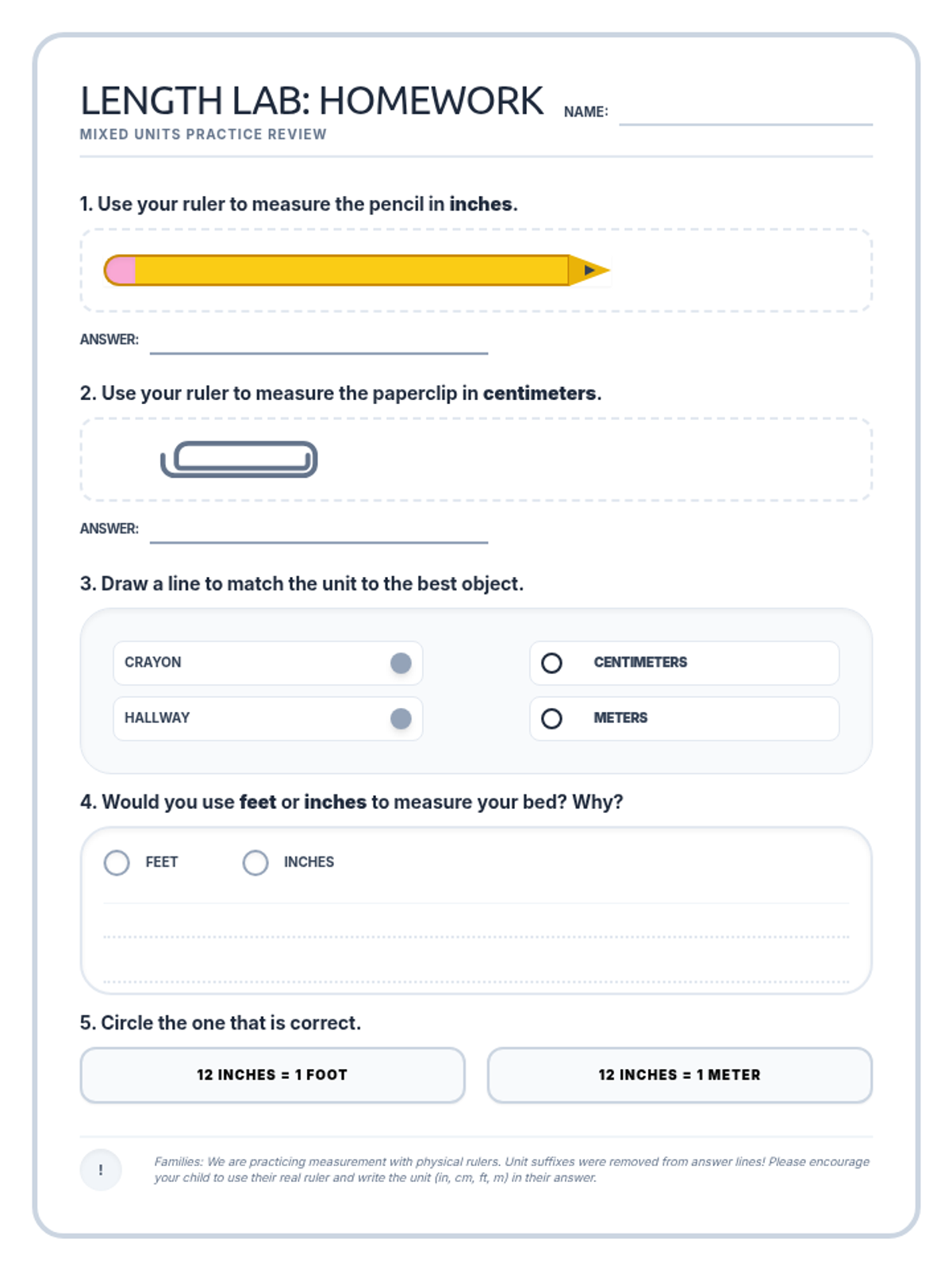 A lesson focused on differentiating between inches, feet, centimeters, and meters, including hands-on estimation and unit selection.