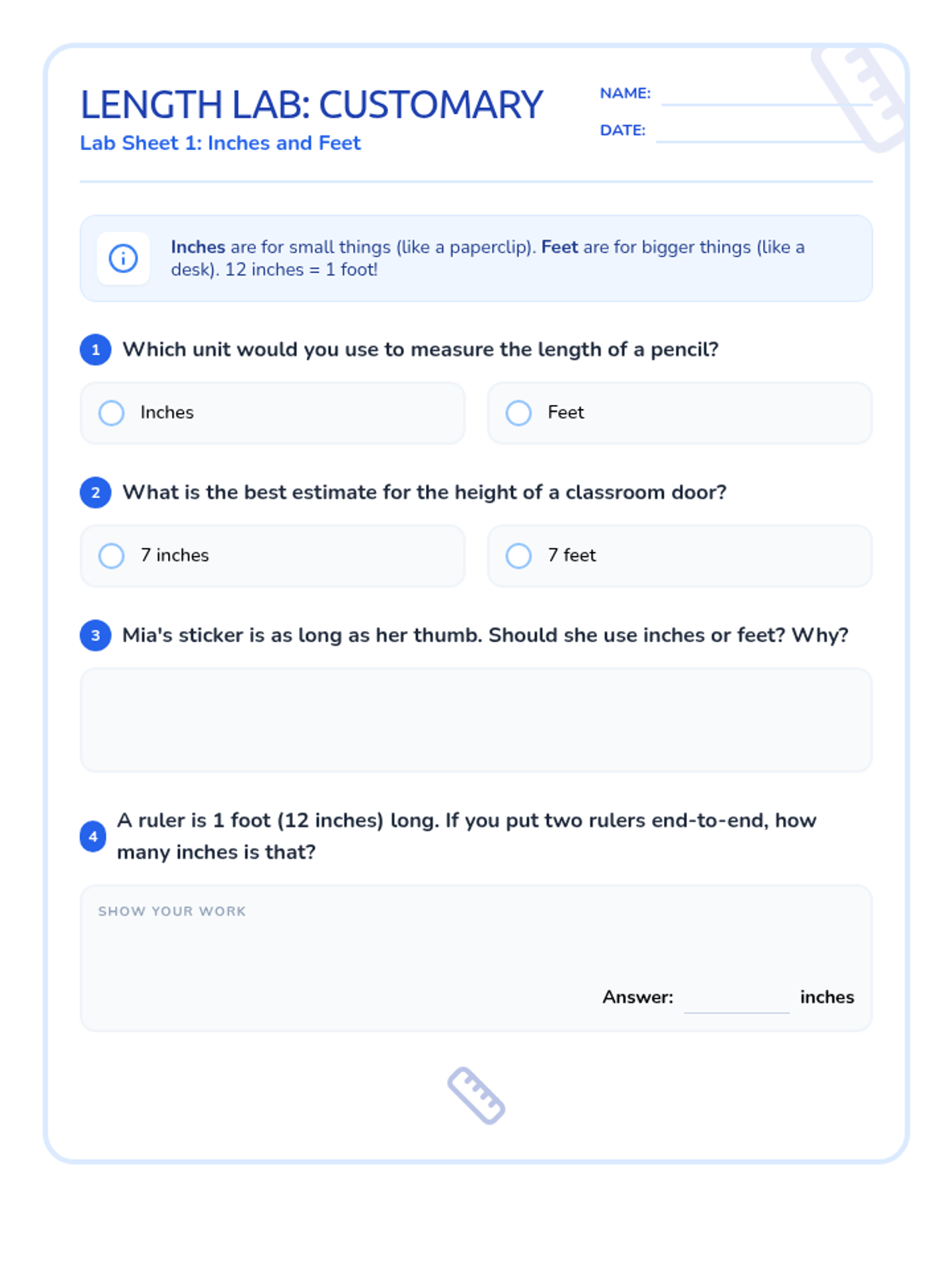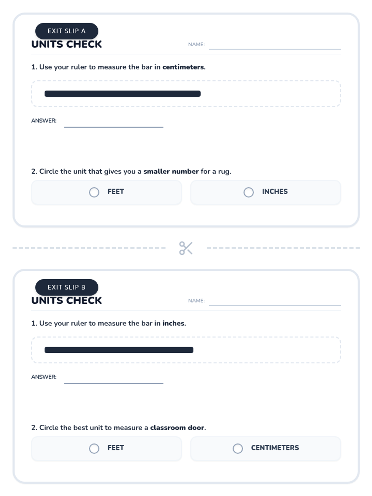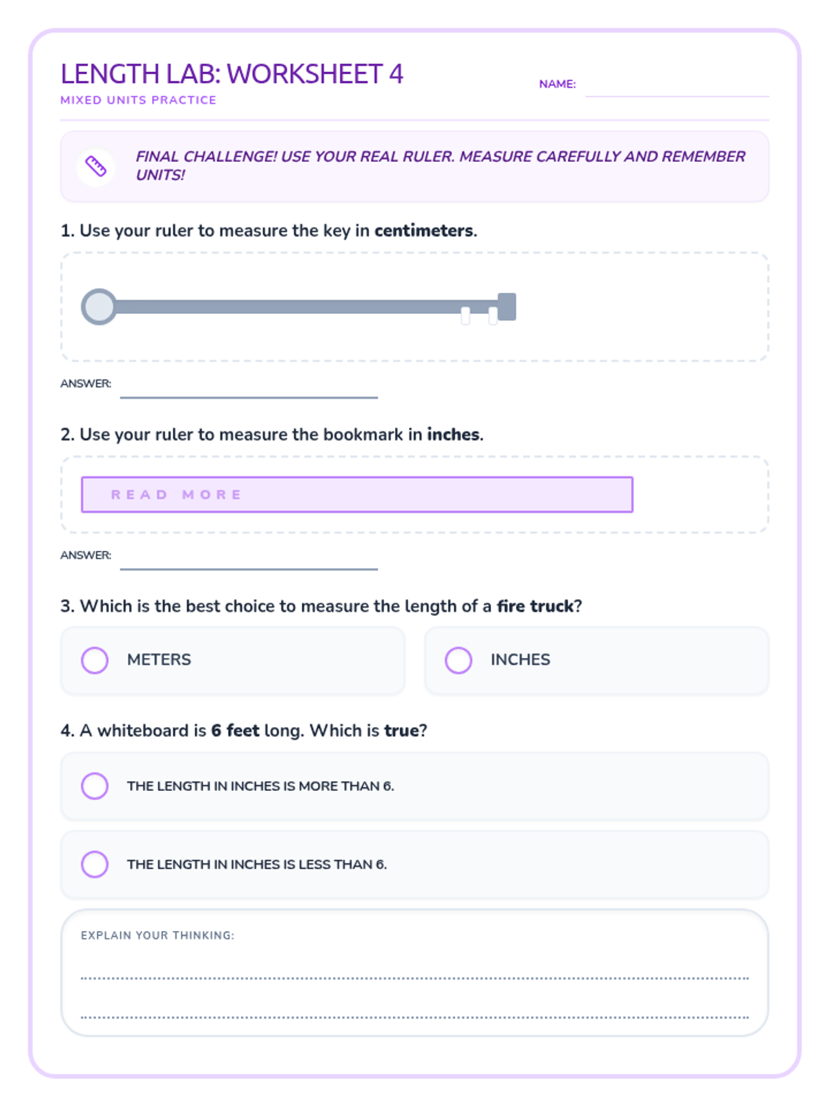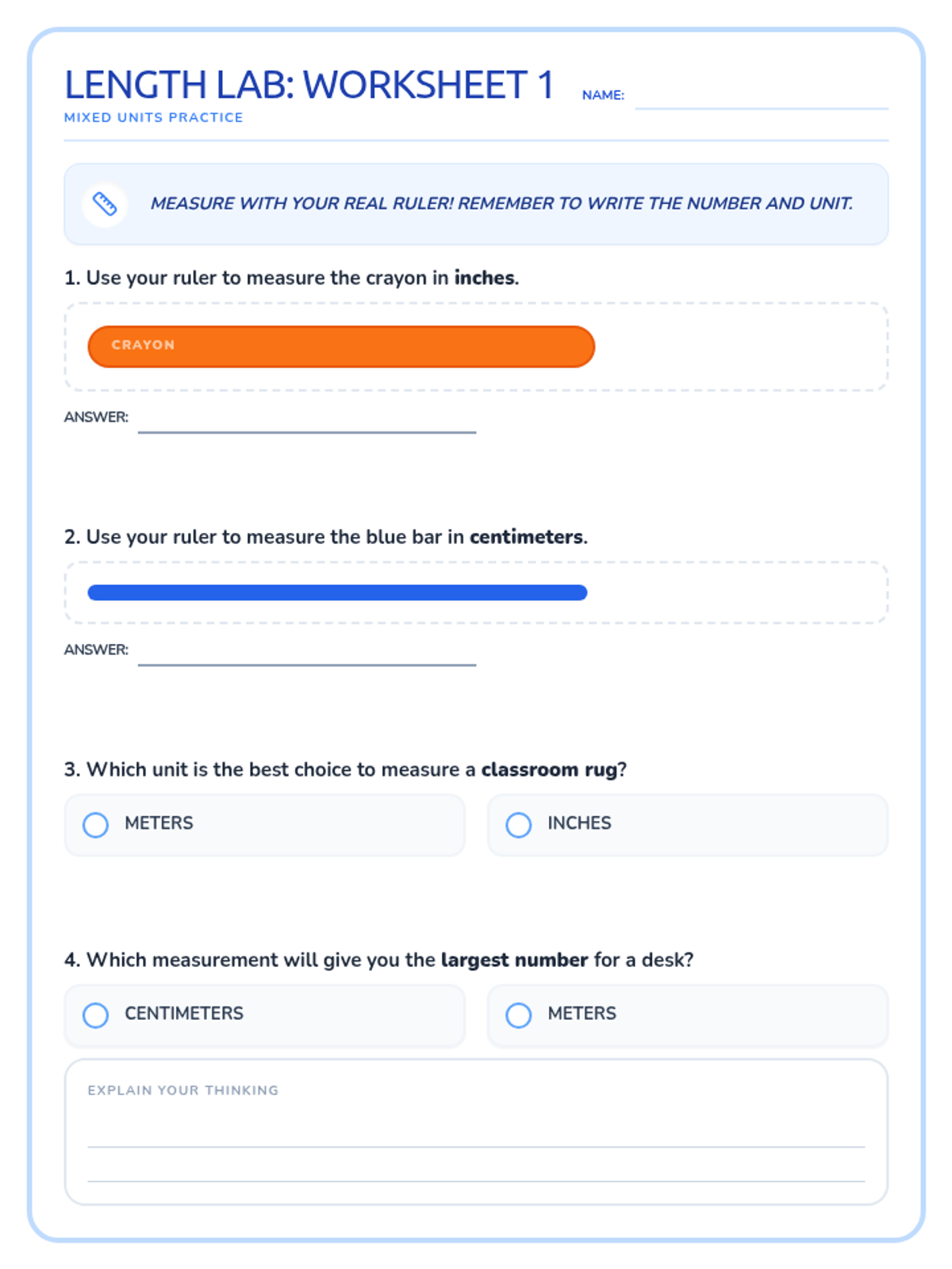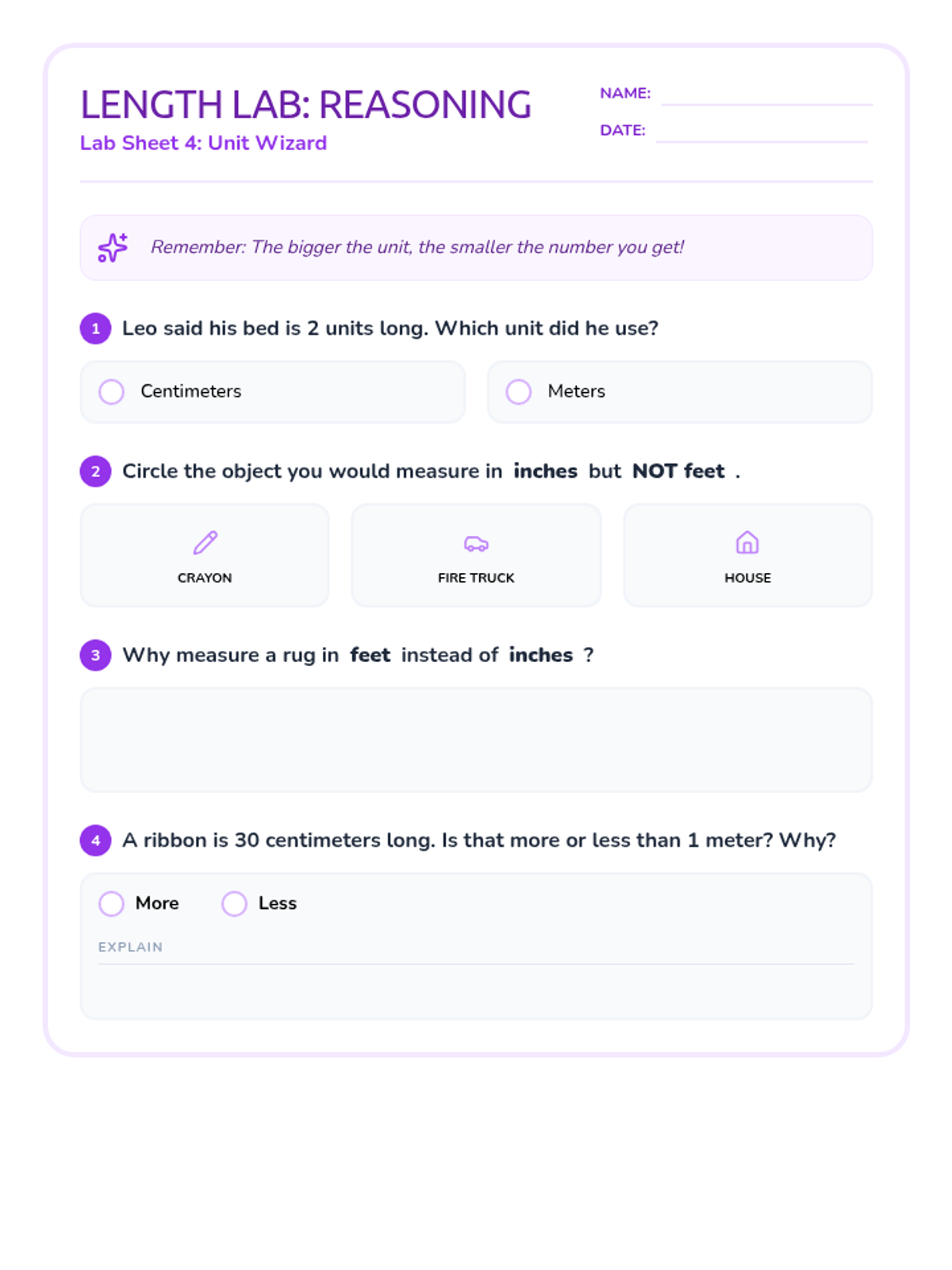 A lesson focused on differentiating between inches, feet, centimeters, and meters, including hands-on estimation and unit selection.