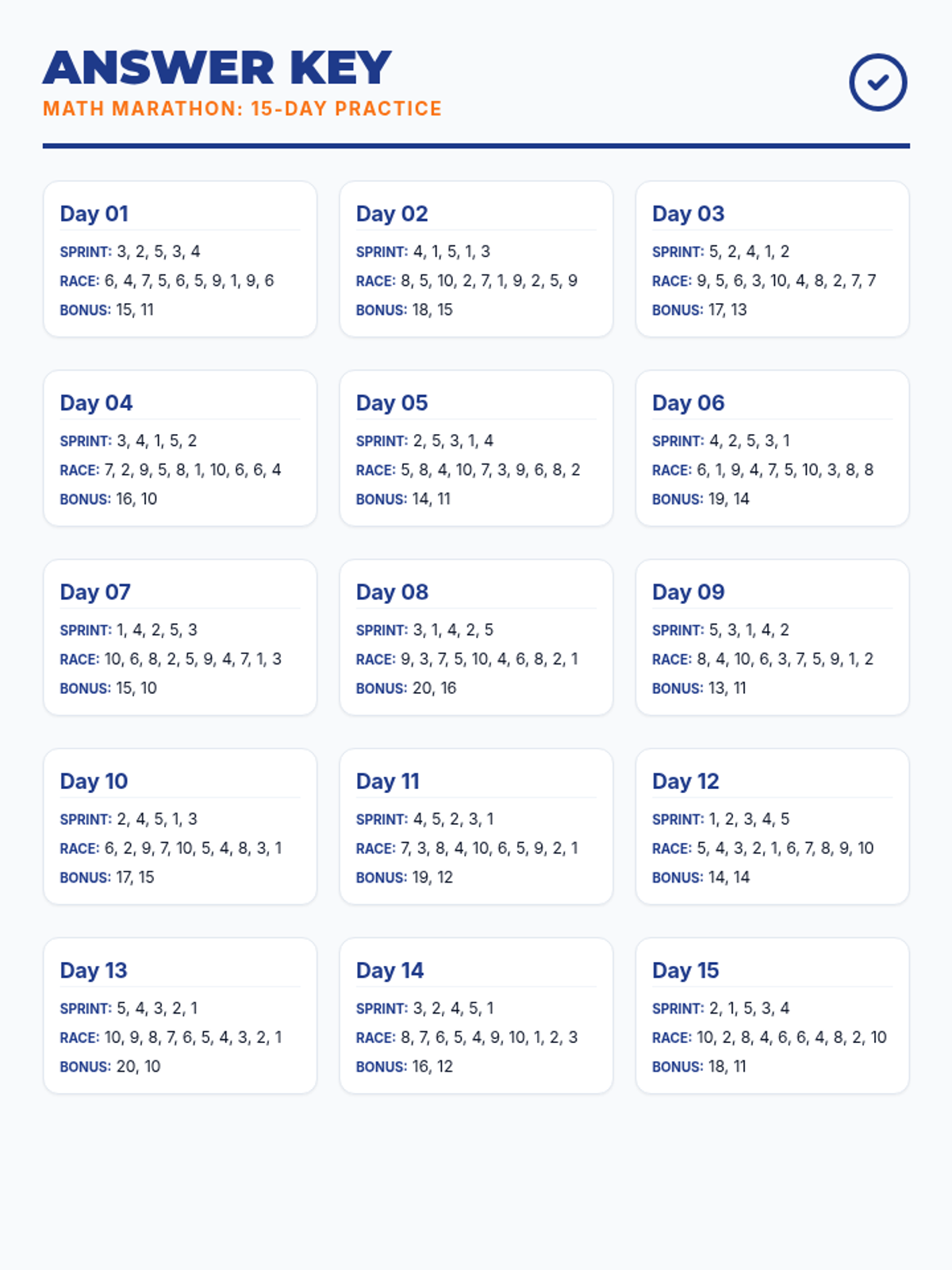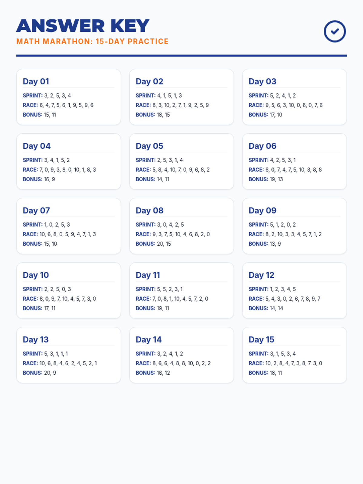 A 15-day progressive fact practice program focusing on addition and subtraction fluency within 5, 10, and 20. Students build confidence through daily "Math Marathons" with varying levels of visual support.