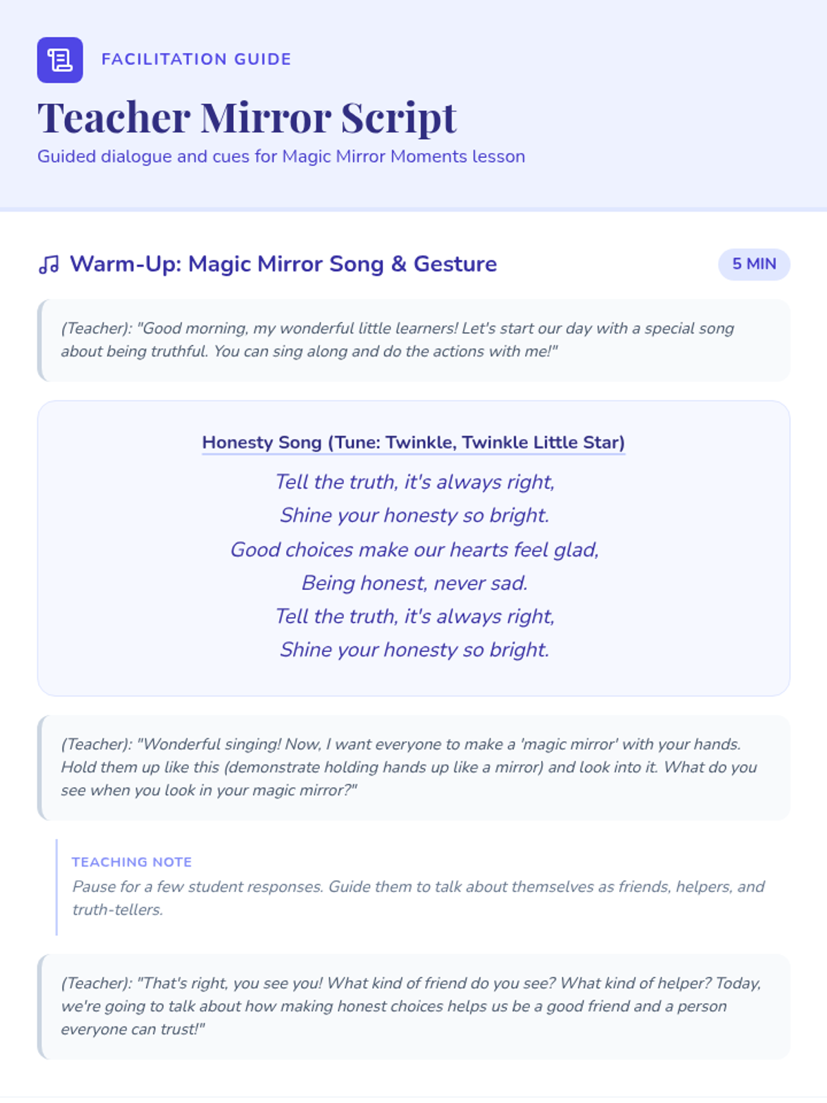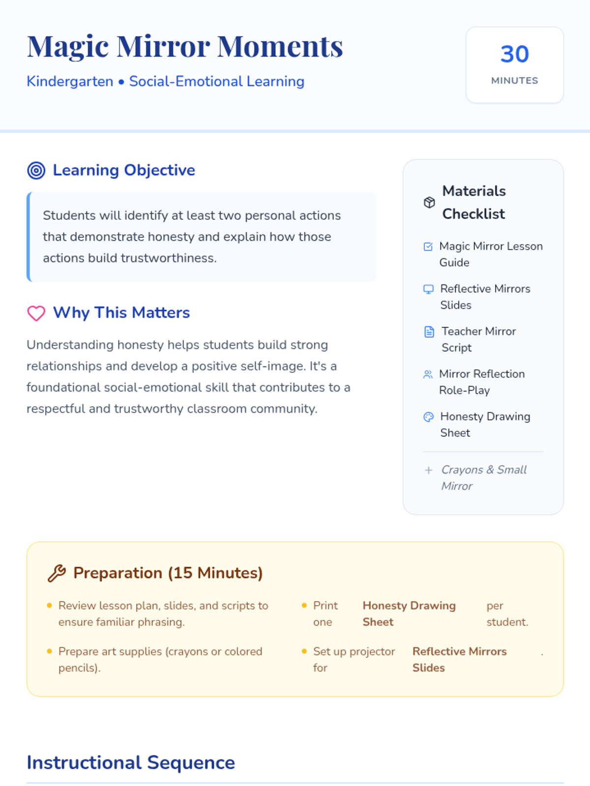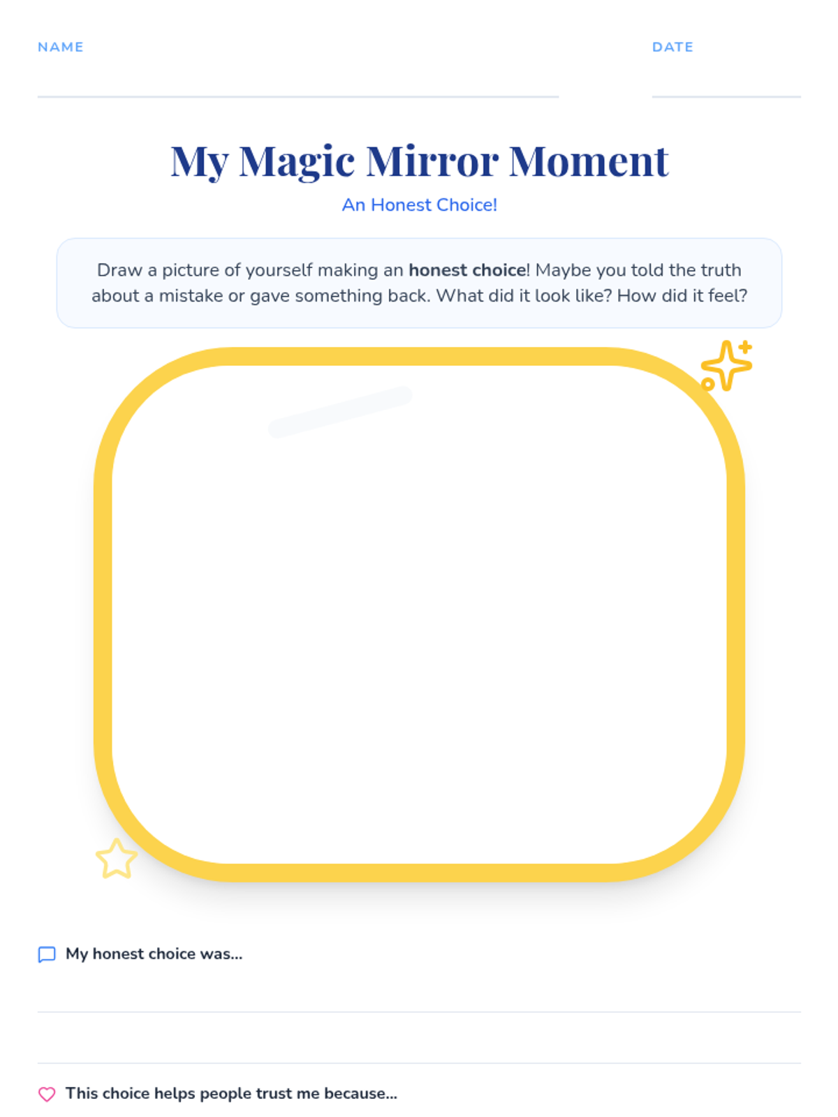 A 30-minute Kindergarten lesson exploring honesty and trustworthiness through songs, role-play, and reflective drawing. Students learn to recognize how their personal choices impact the trust others have in them.