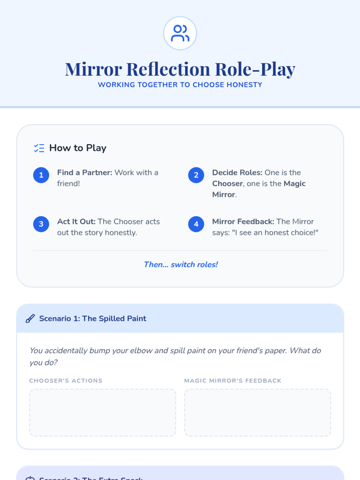 An interactive session where students learn to distinguish between honest and dishonest choices through a board game, scenario sorting, and role-play.