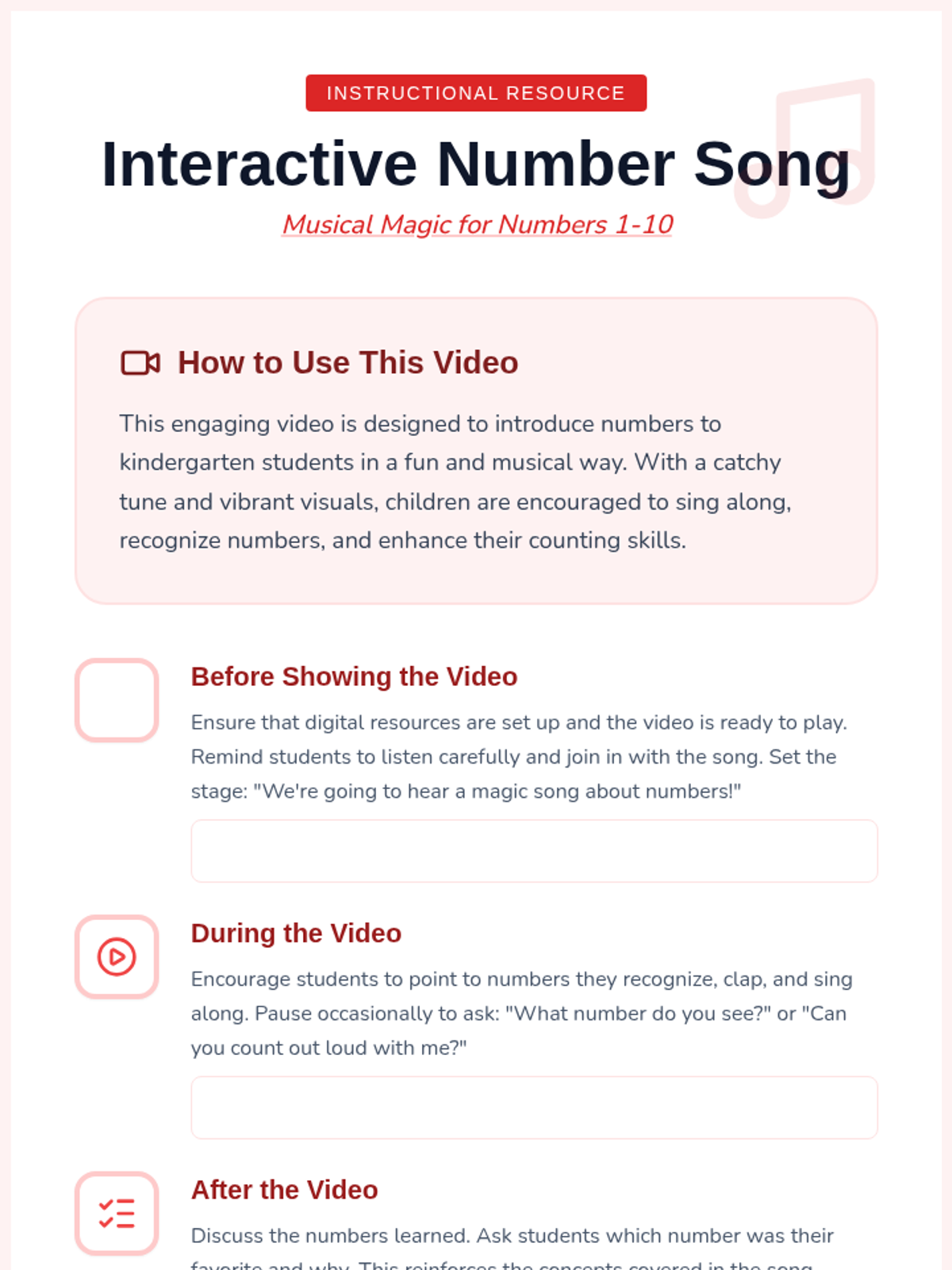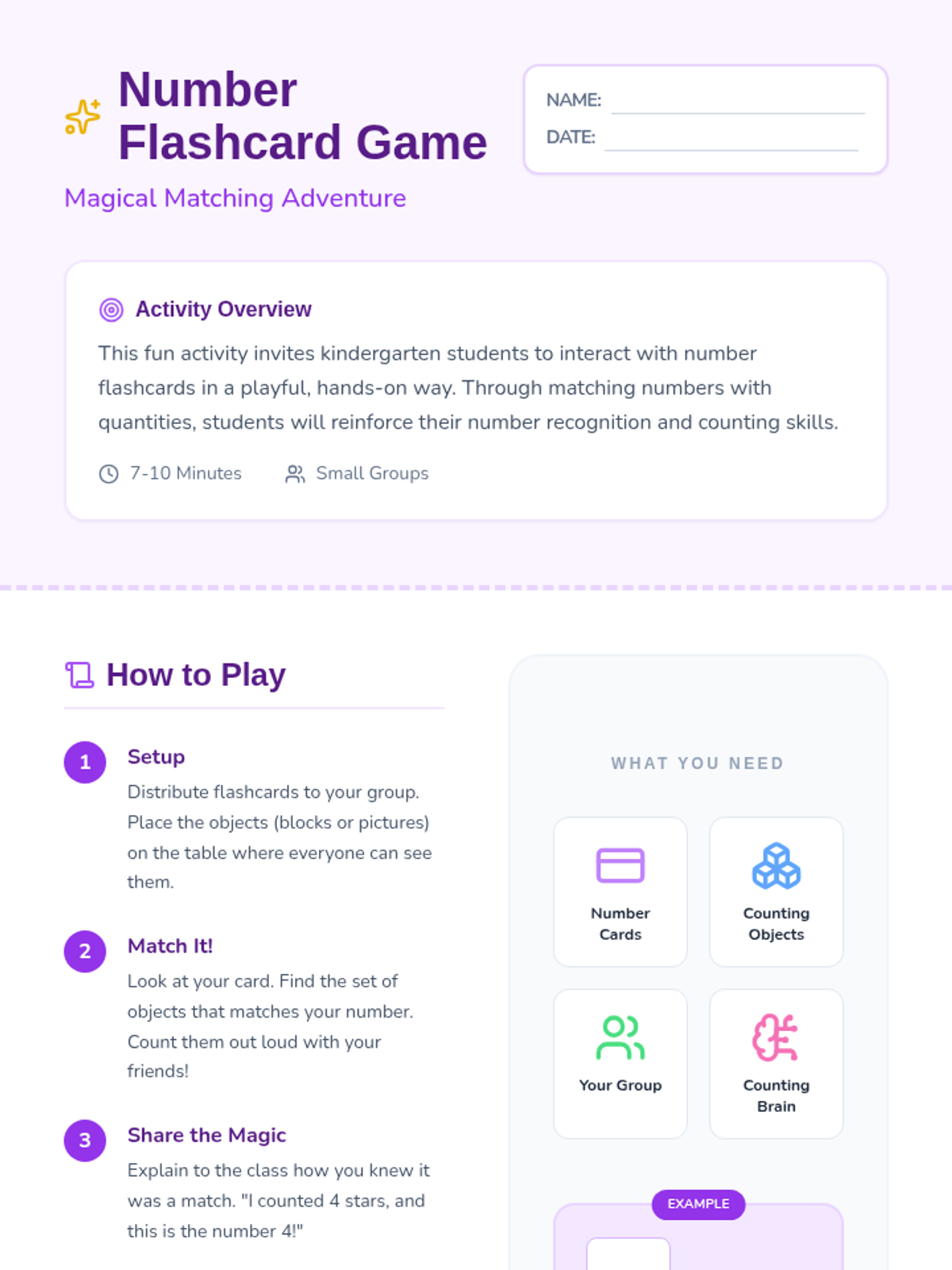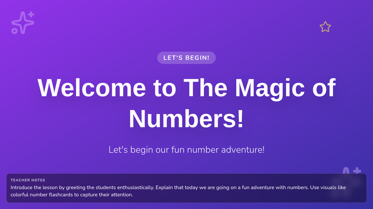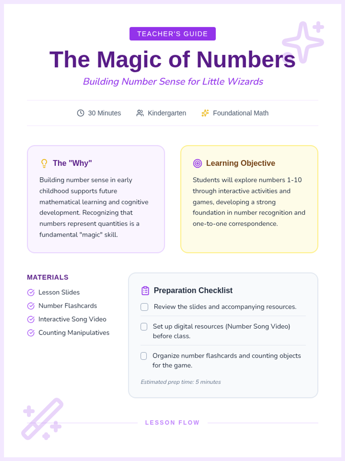 A fun, 30-minute introductory lesson for kindergarteners to explore numbers 1-10 through music, movement, and a matching game. Students will build foundational number sense and recognition in a playful, magical-themed environment.