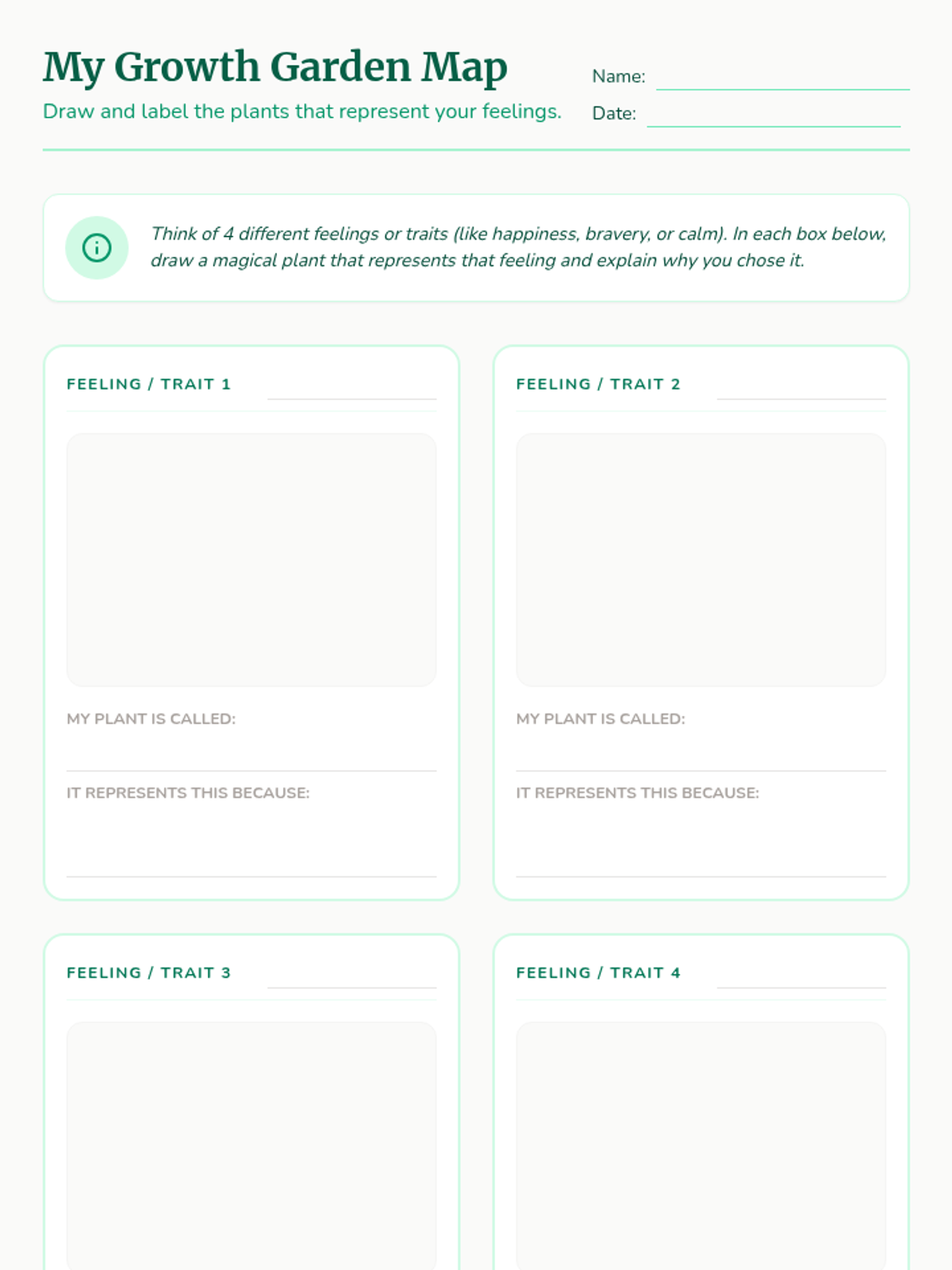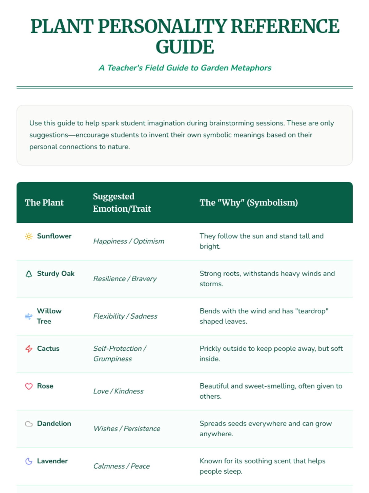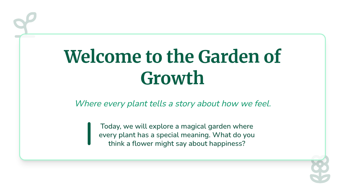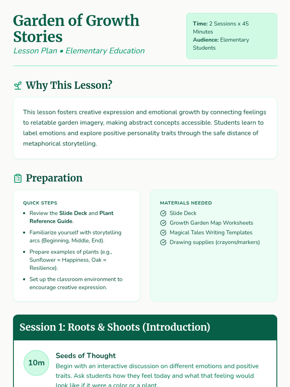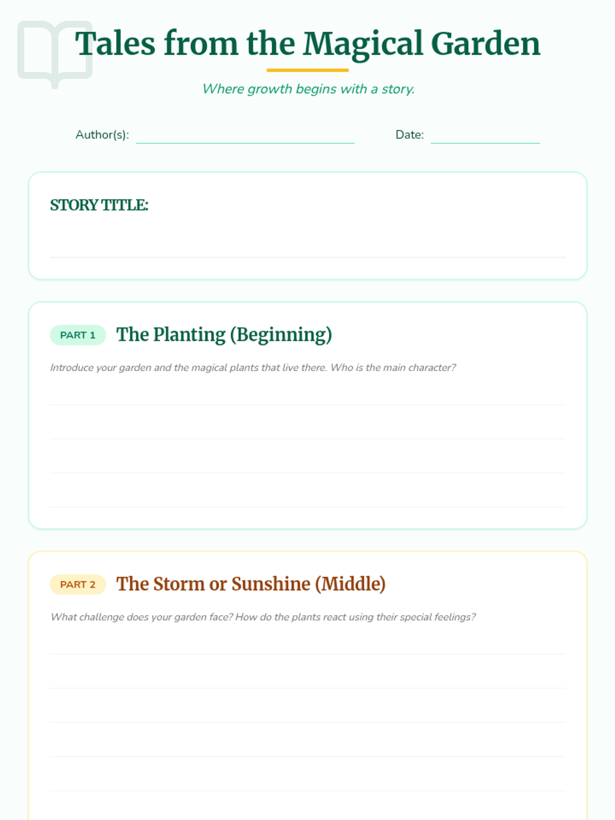 Students create and share stories about a magical garden where plants symbolize positive traits, enhancing narrative skills and emotional awareness.