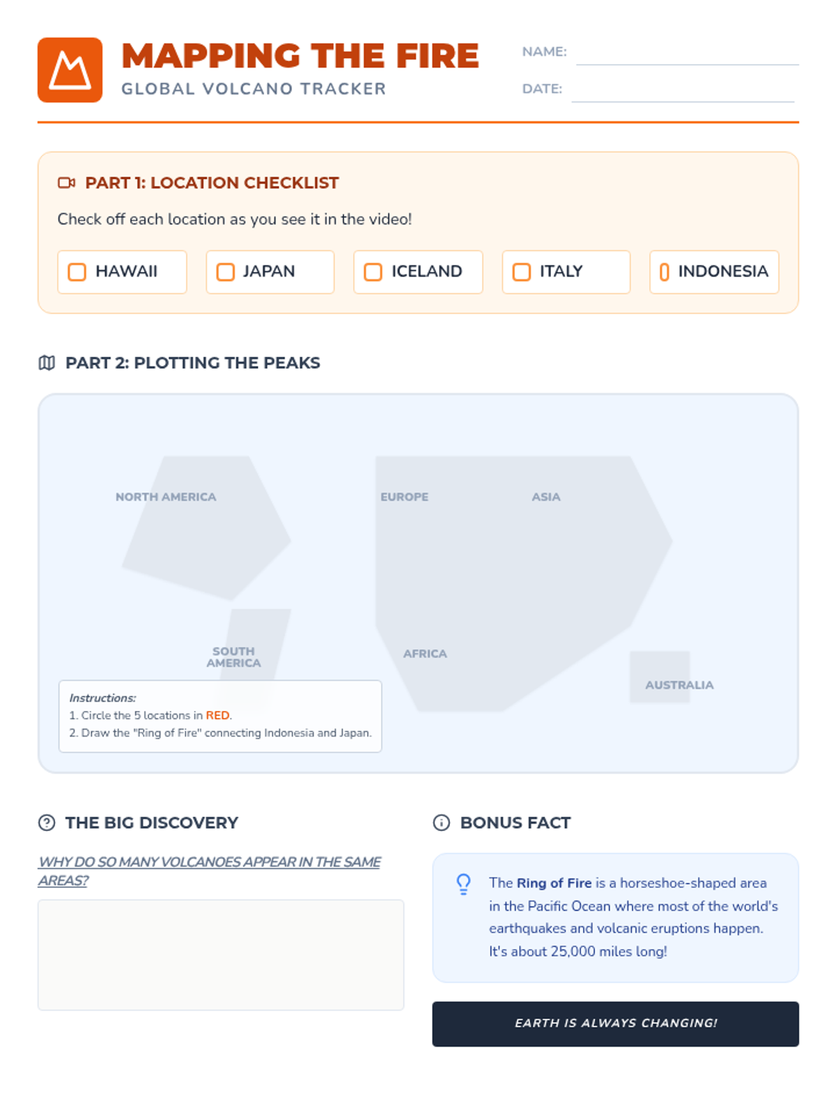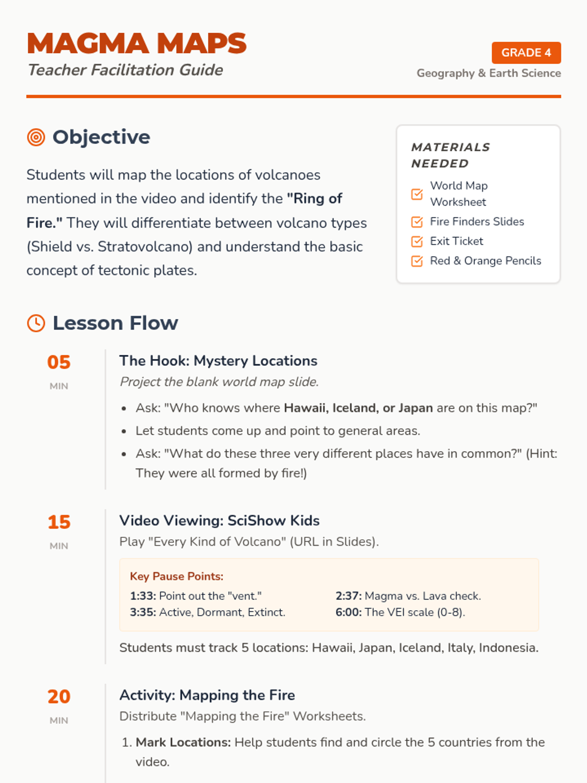 Students will explore the types and locations of volcanoes around the globe, focusing on the 'Ring of Fire.' By mapping specific locations mentioned in a SciShow Kids video, they will discover patterns in tectonic activity and learn simple geological concepts like magma vs. lava and the Volcanic Explosivity Index (VEI).