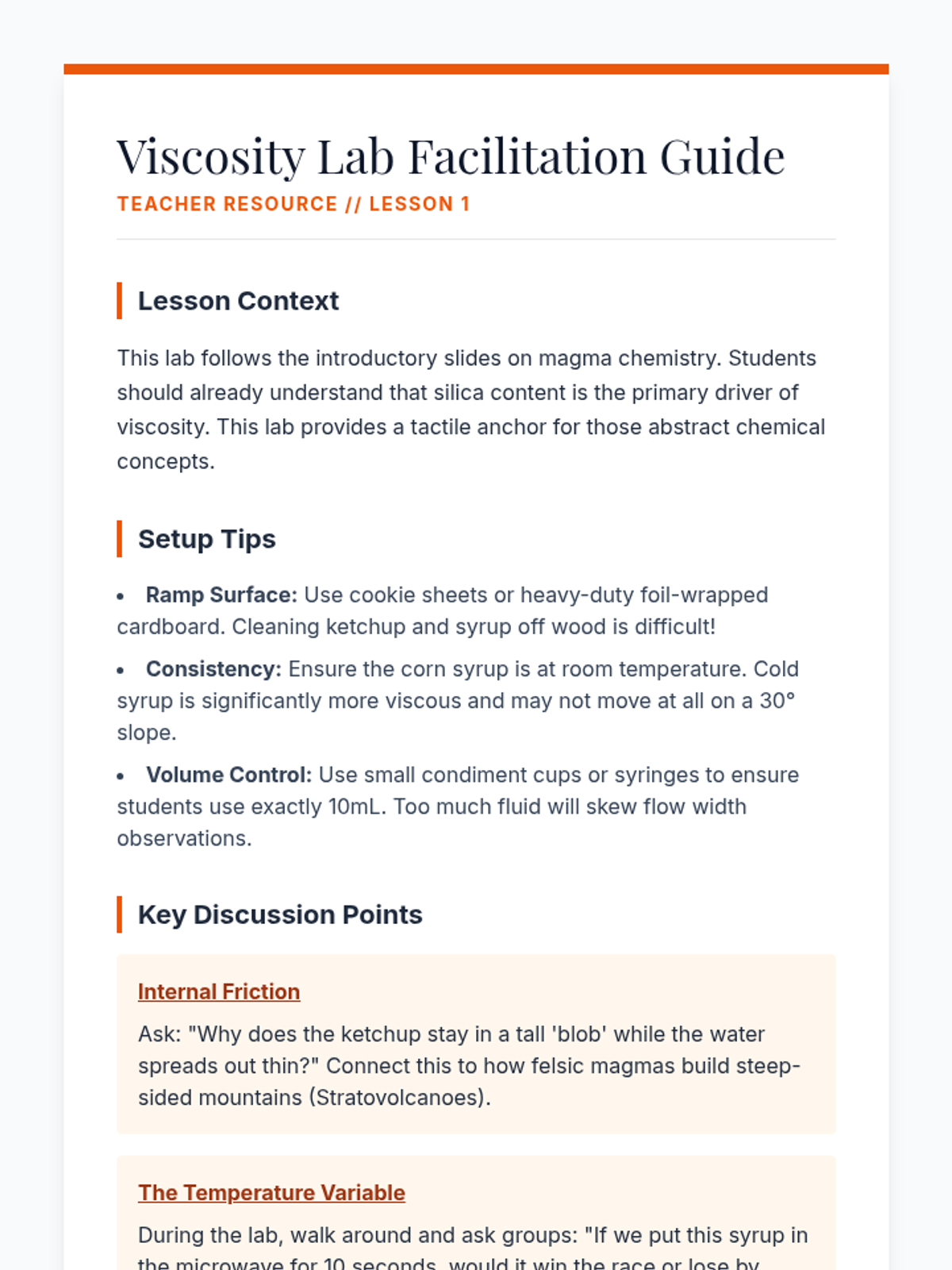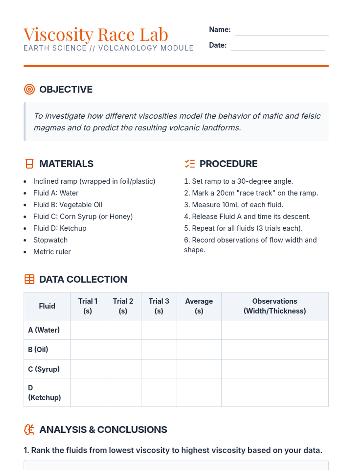 Students investigate how silica content and temperature affect magma viscosity, determining whether an eruption will be explosive or effusive.
