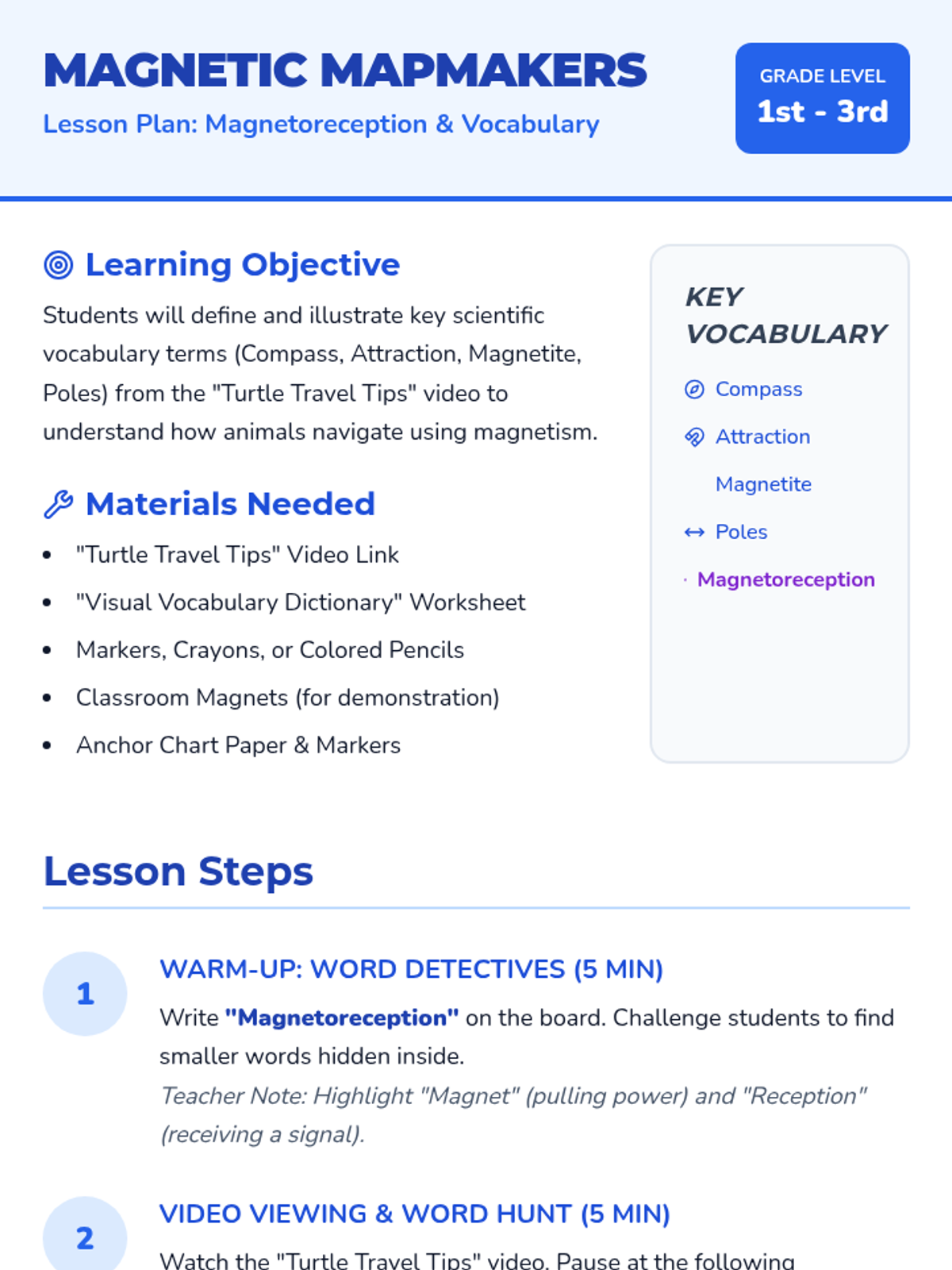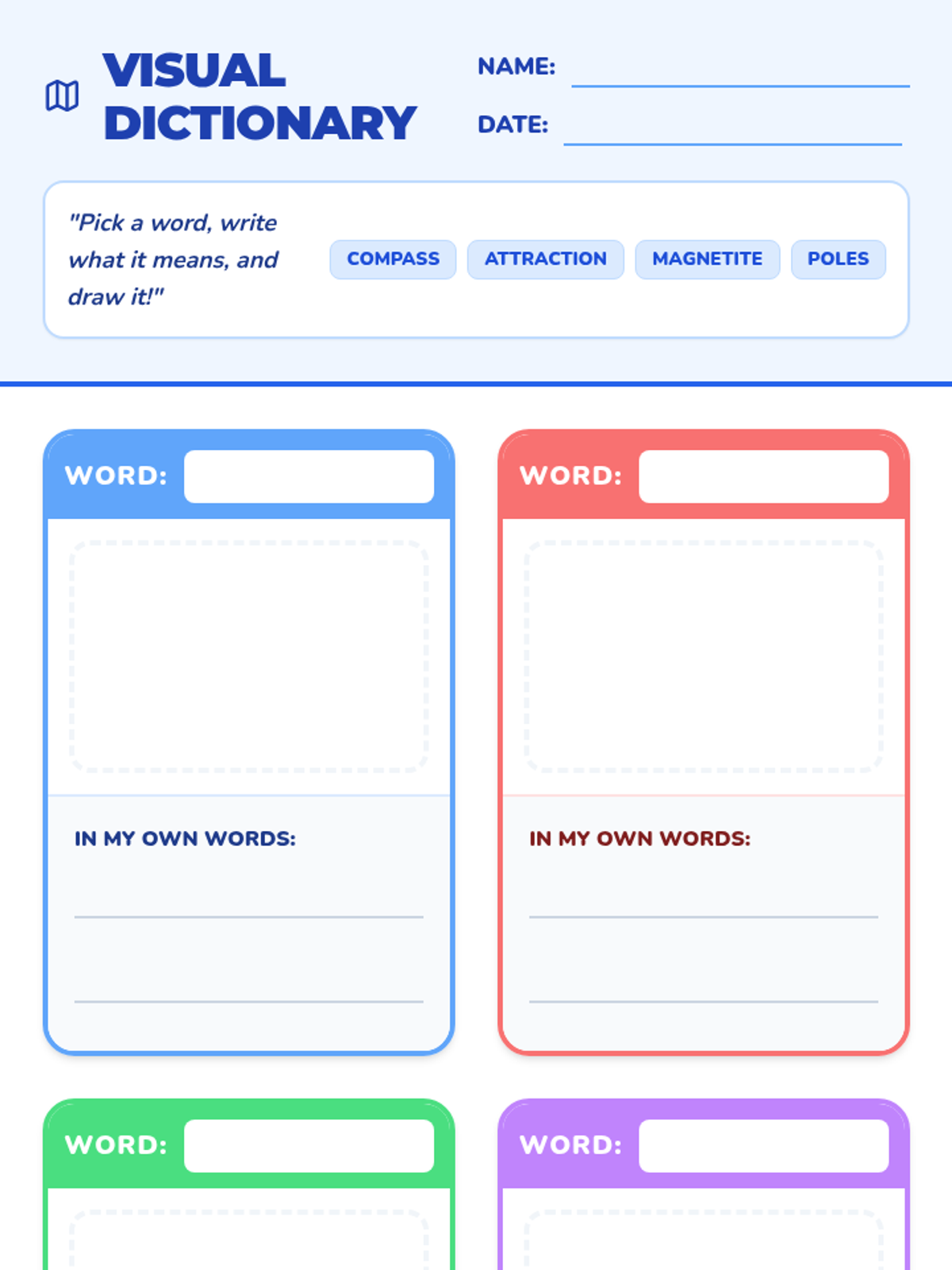 Students explore the concept of magnetoreception and magnetism through a video about sea turtles, defining and illustrating key scientific terms to create a visual vocabulary dictionary.