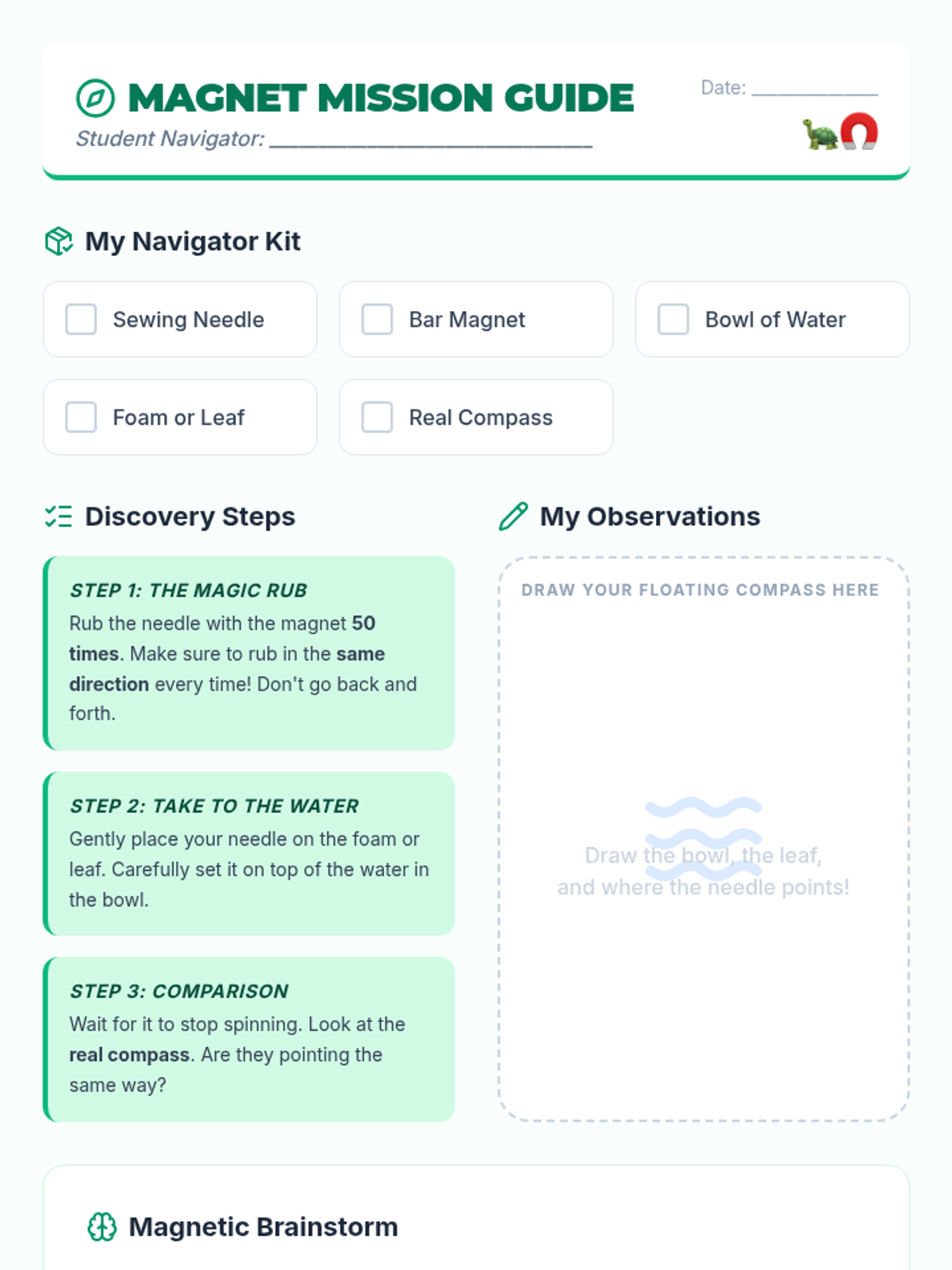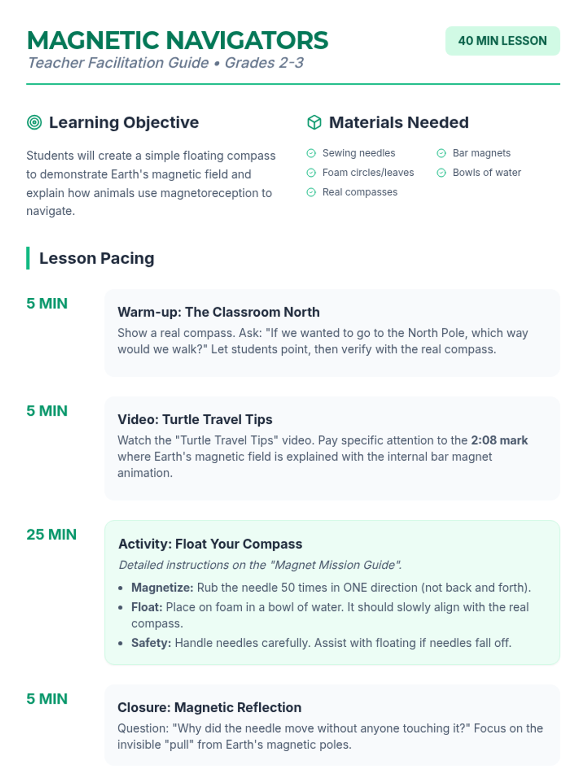 Students explore Earth's magnetic field by creating a DIY floating compass and learning how animals like sea turtles use magnetoreception to navigate.