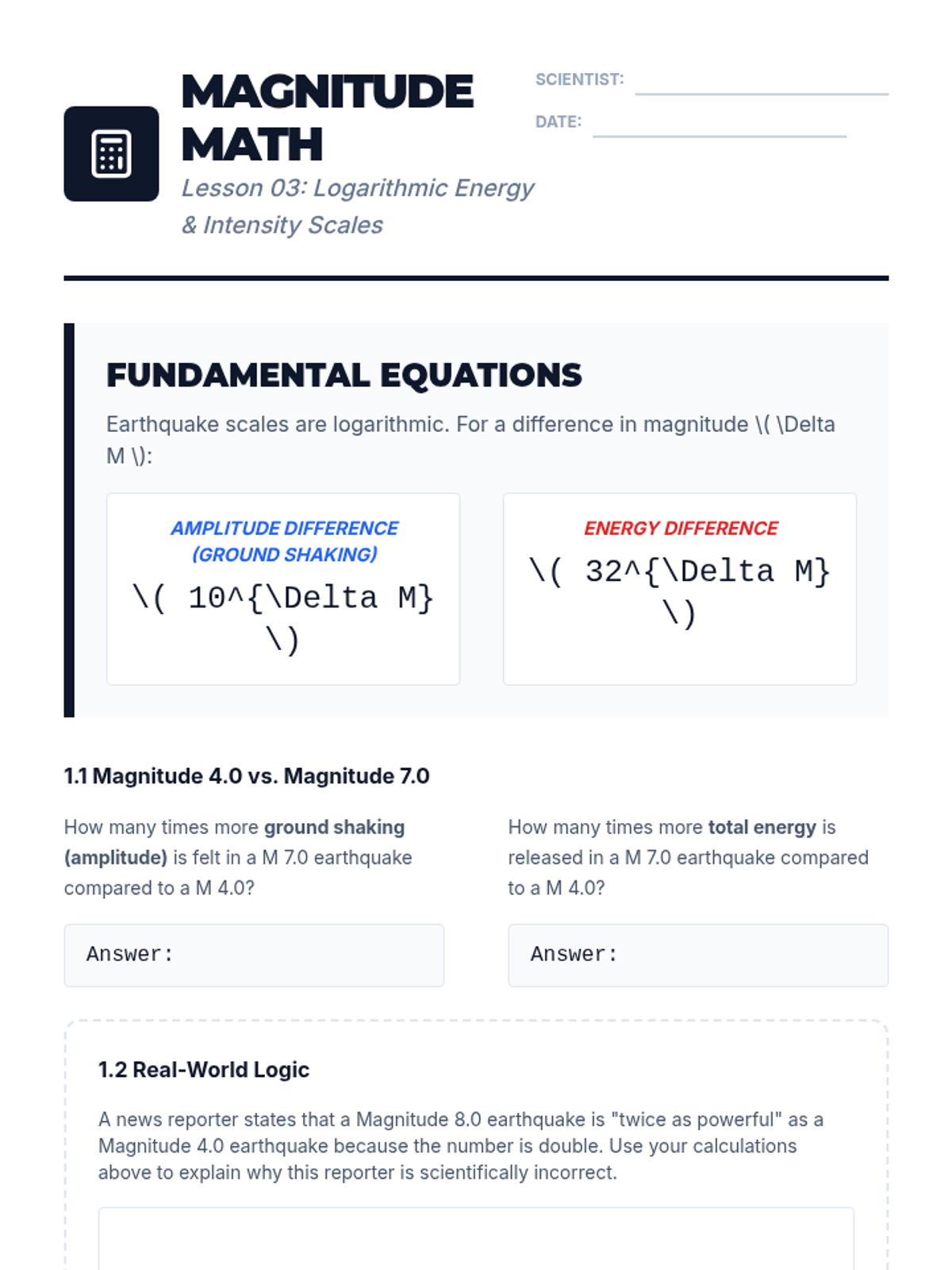 Students contrast the Richter, Moment Magnitude, and Mercalli scales. They calculate energy release differences using logarithmic reasoning and evaluate scale preferences for large events.