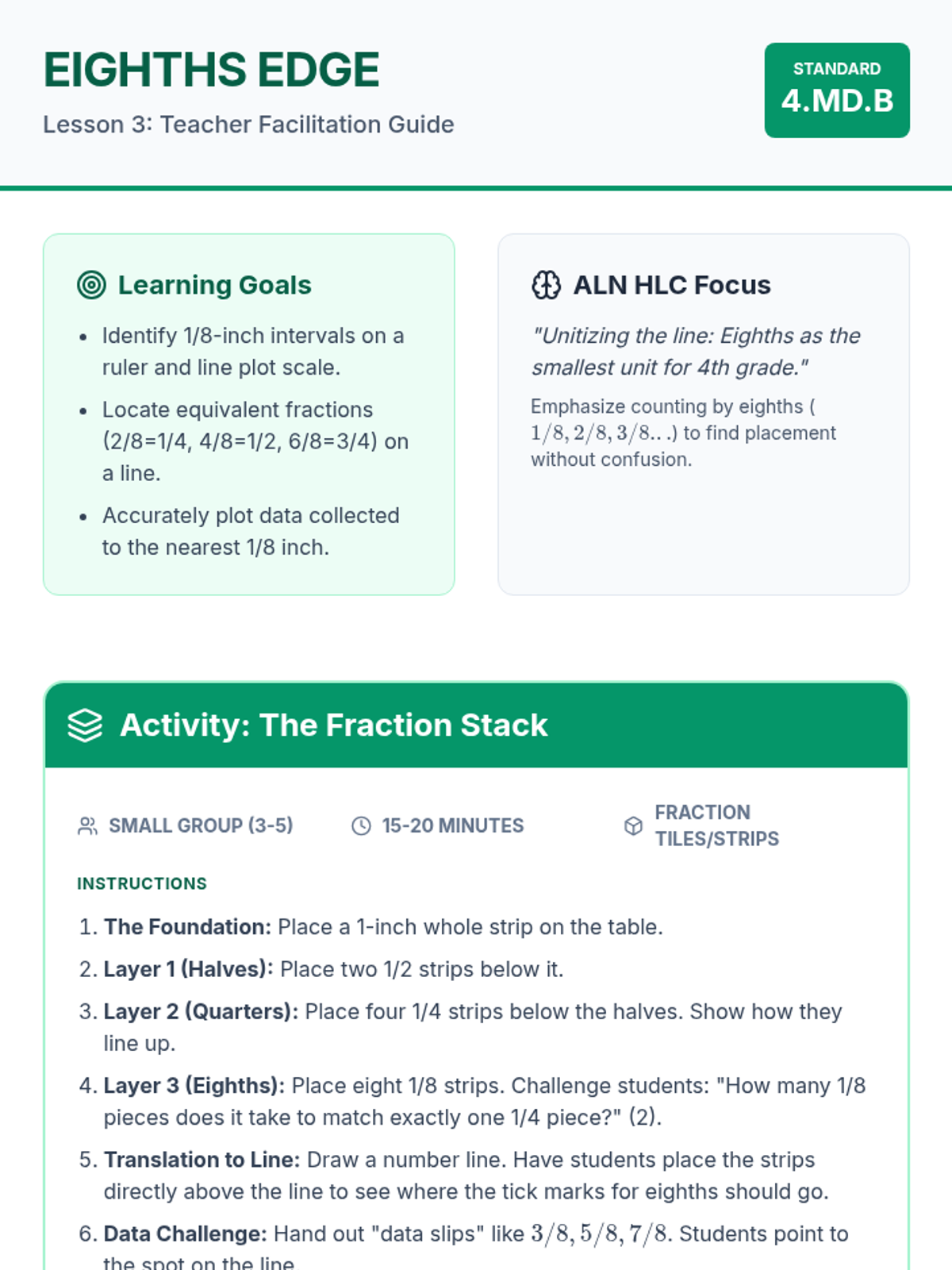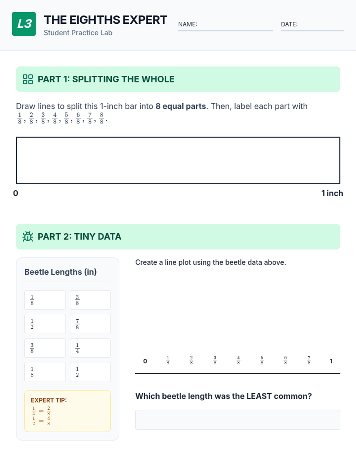 Extends precision to 1/8 inch, focusing on equivalent fractions (2/8 = 1/4) and accurately placing data points.