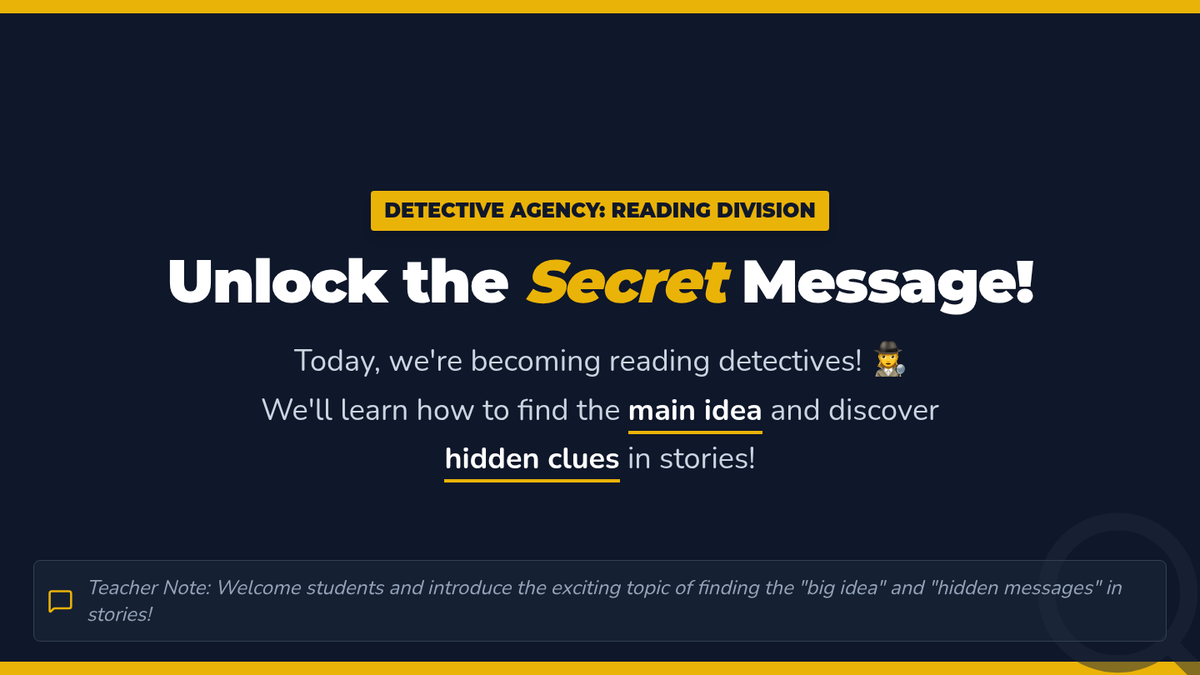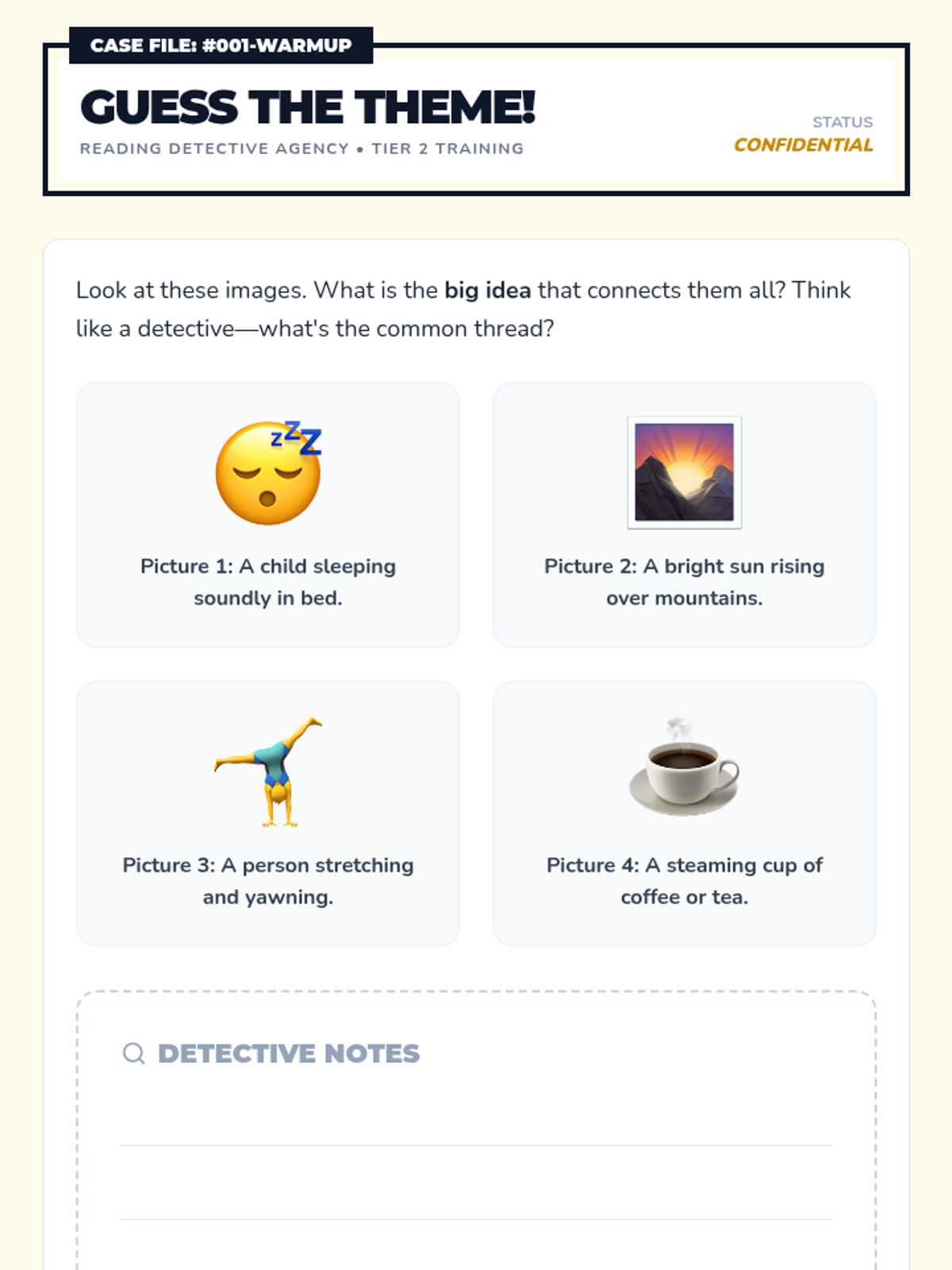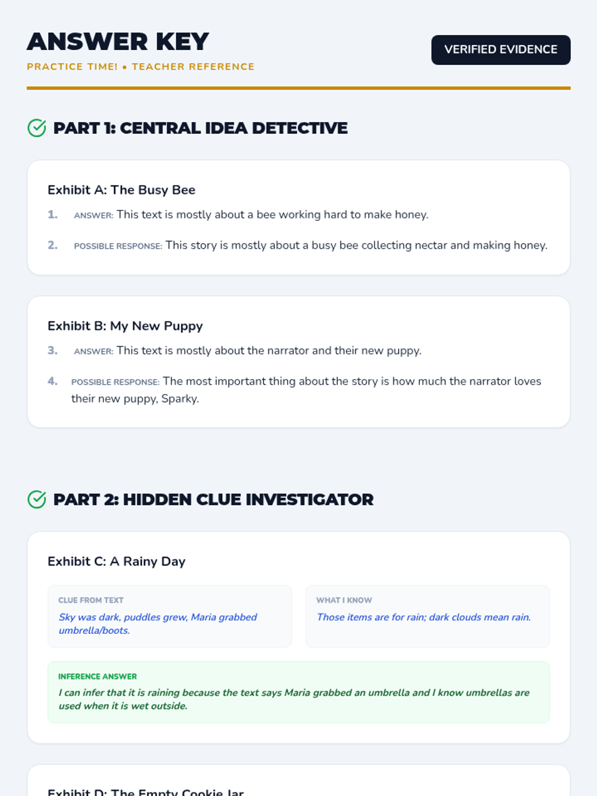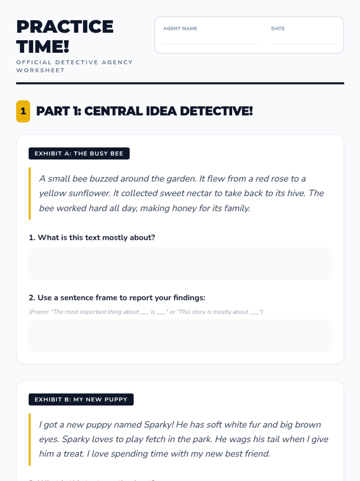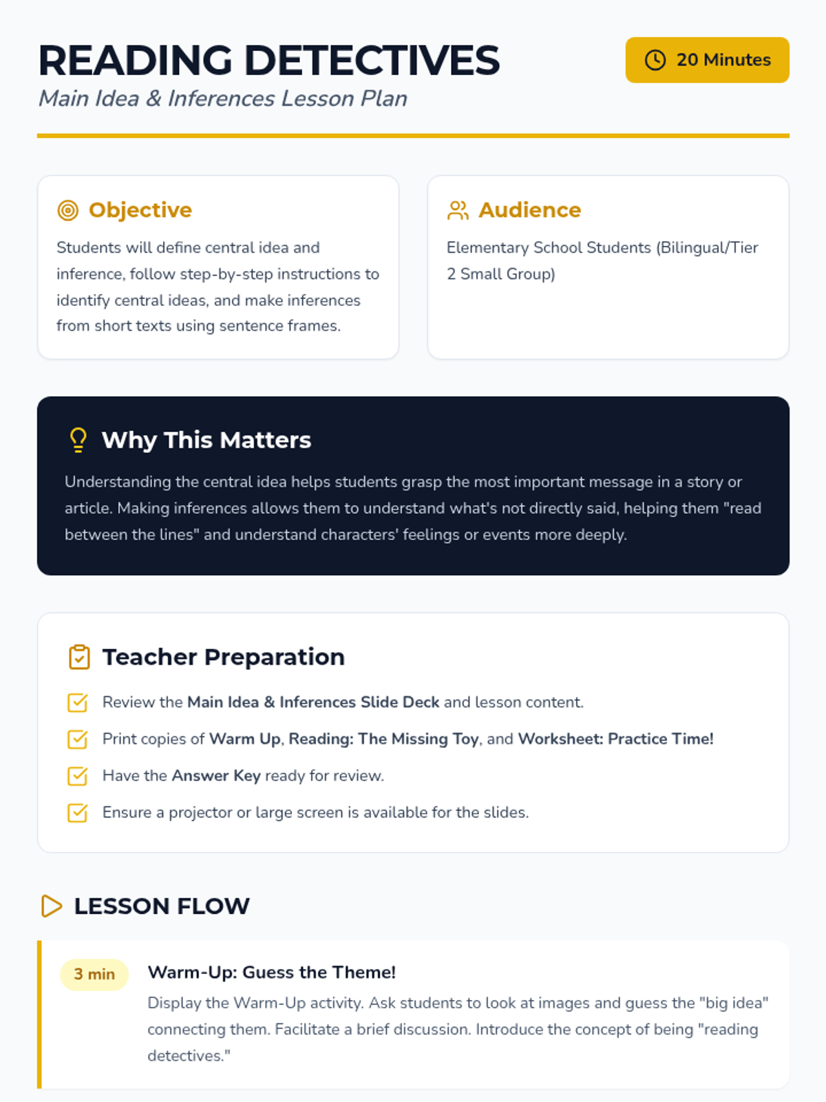 A 20-minute Tier 2 small group lesson for bilingual elementary students focusing on identifying the central idea and making inferences using detective-themed strategies and sentence frames.