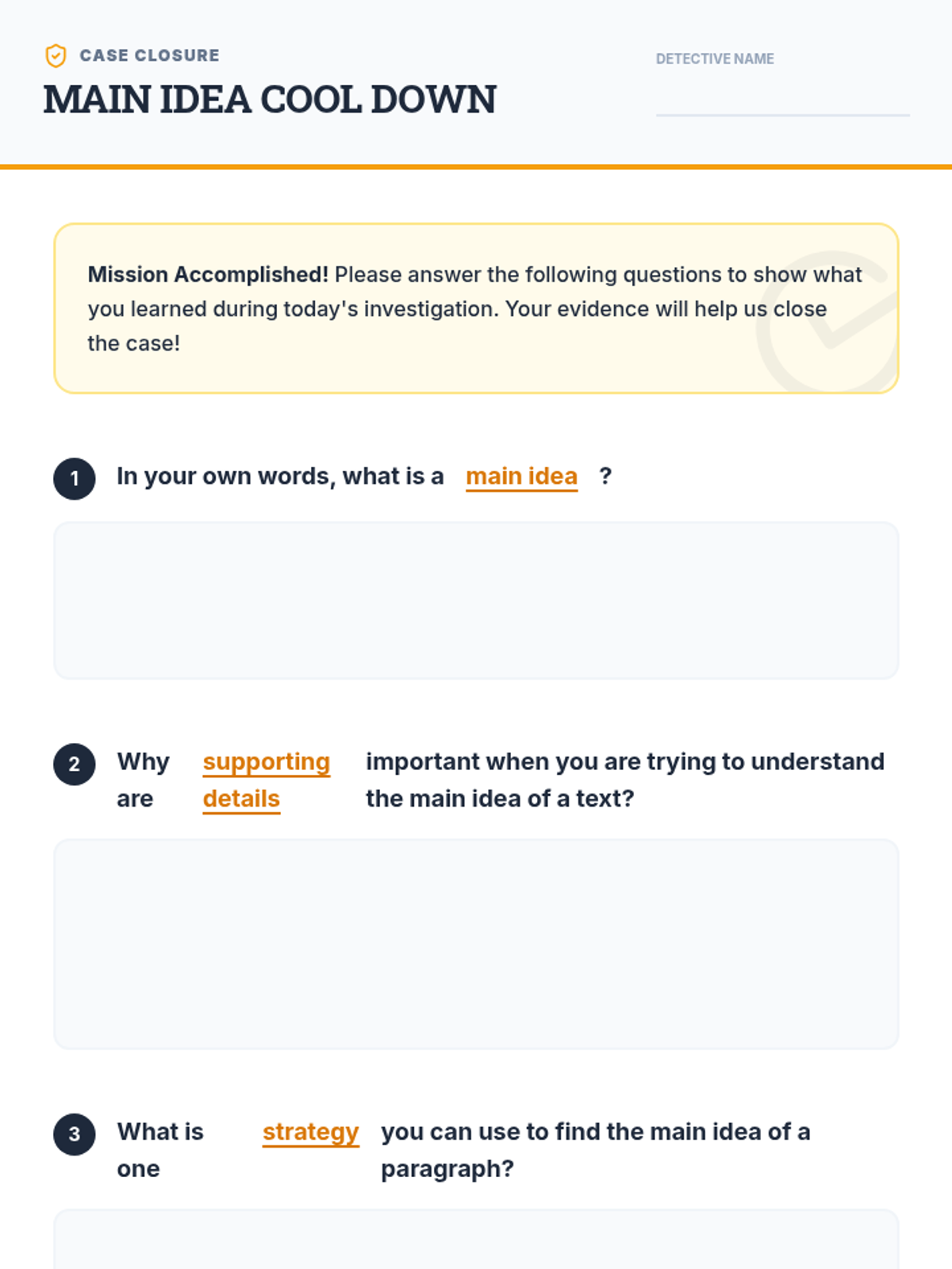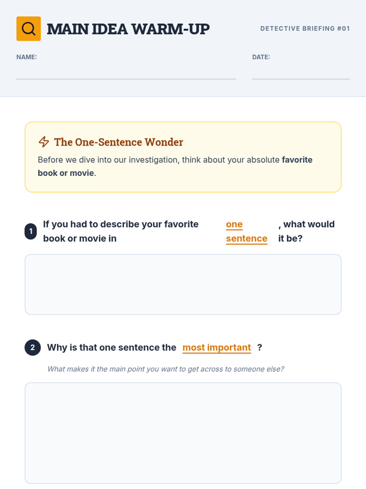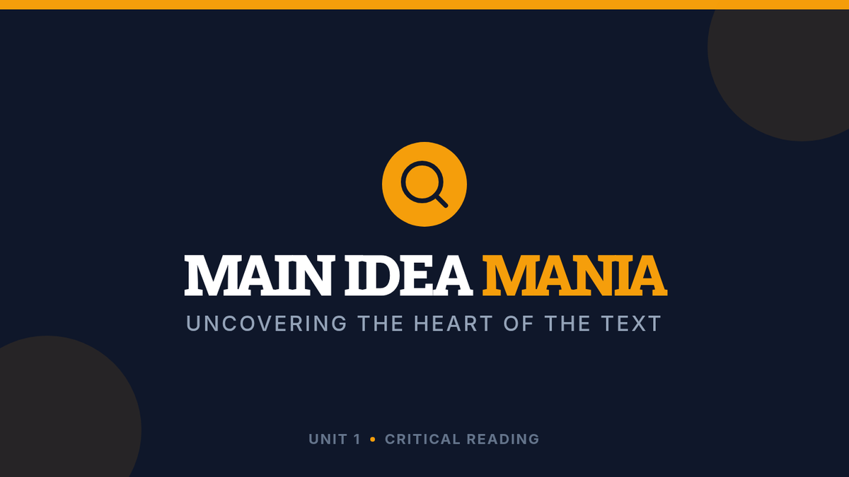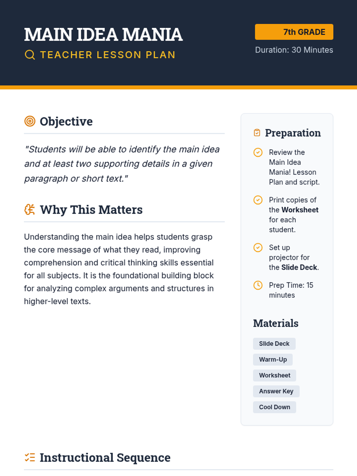 A fast-paced, engaging lesson for 7th graders to master identifying main ideas and supporting details using a 'detective' theme. Students move from a conceptual warm-up to direct instruction and guided practice, culminating in an independent assessment.
