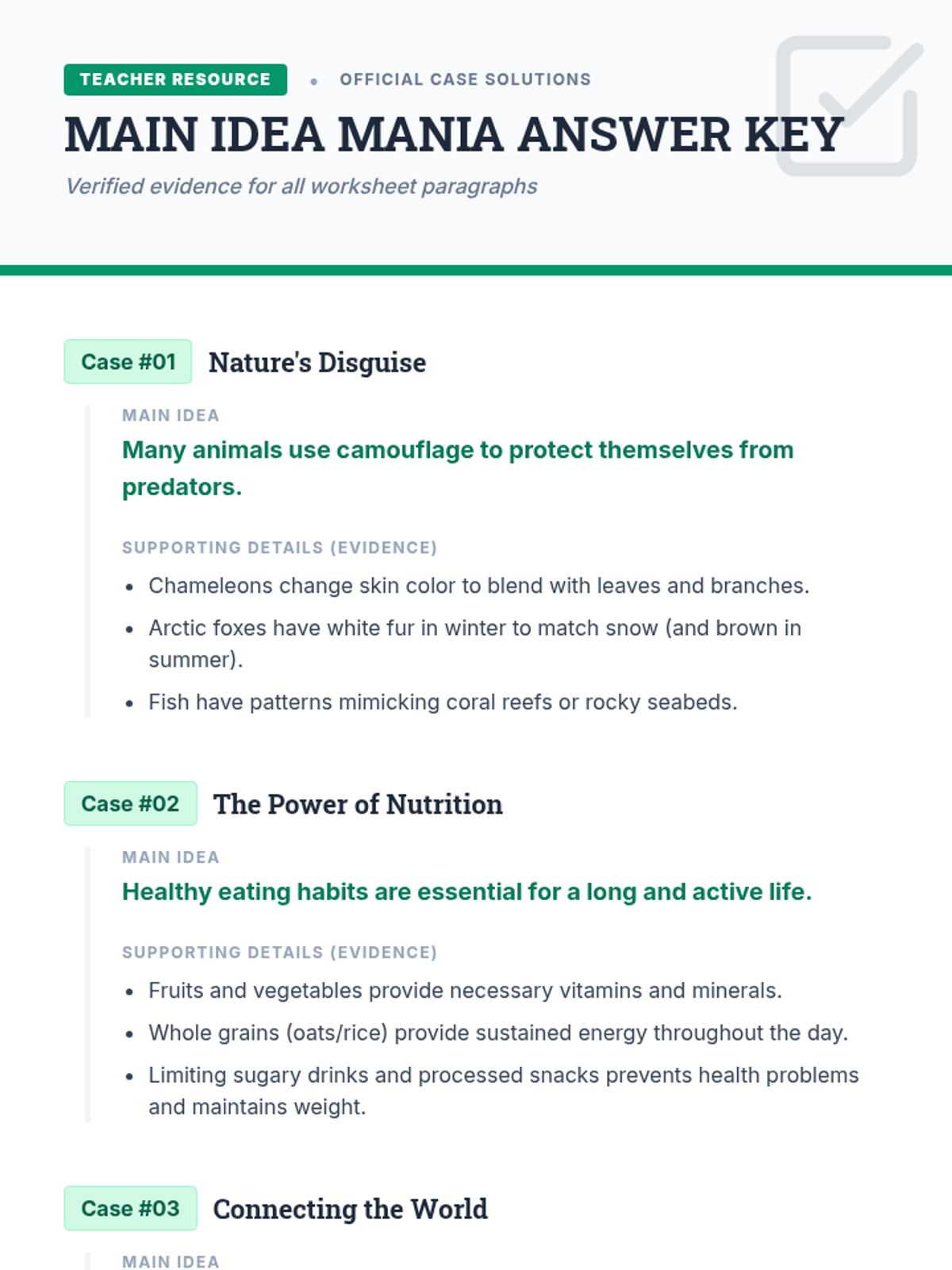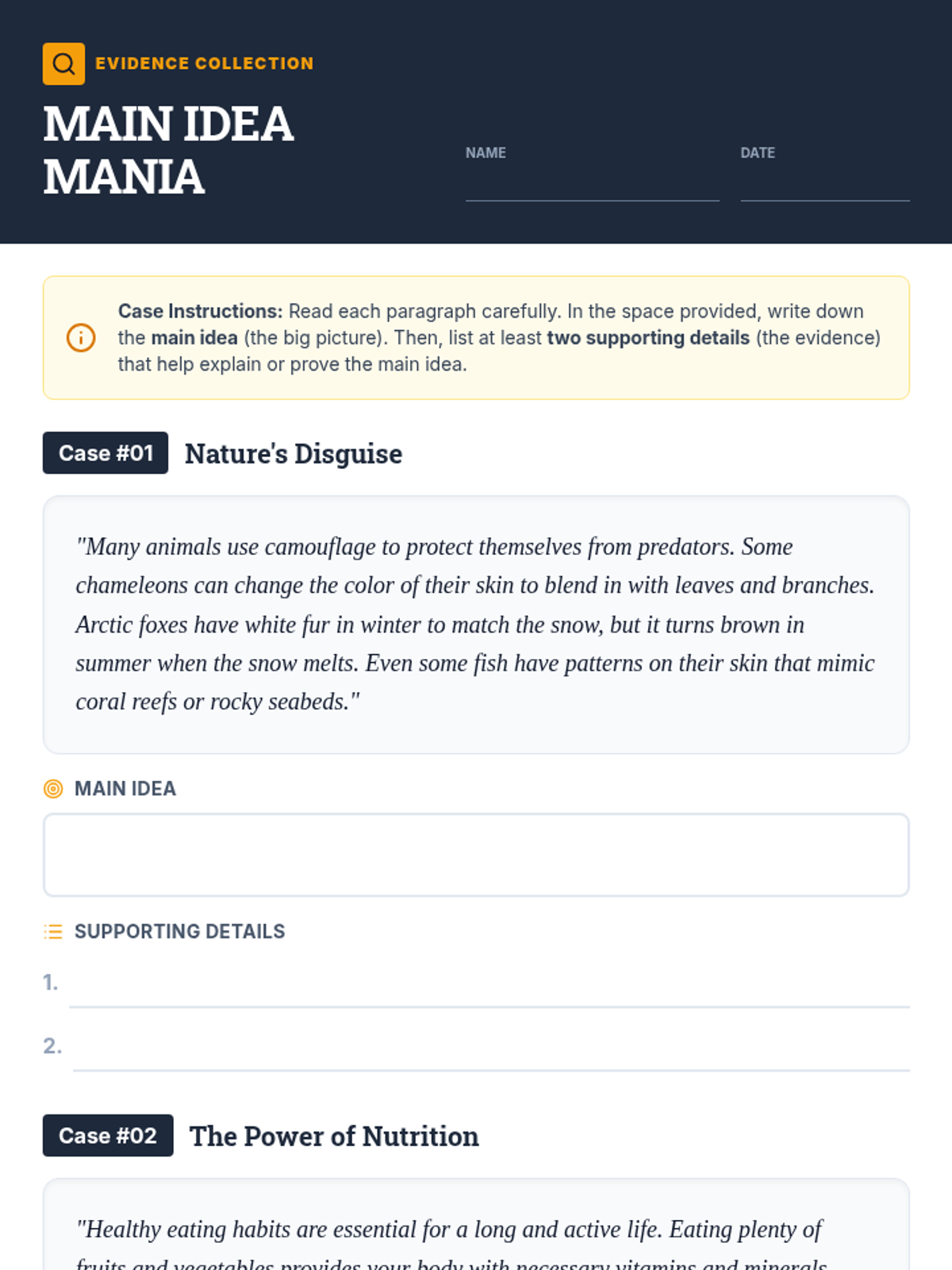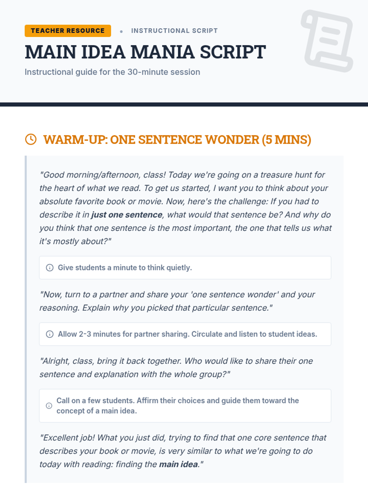A fast-paced, engaging lesson for 7th graders to master identifying main ideas and supporting details using a 'detective' theme. Students move from a conceptual warm-up to direct instruction and guided practice, culminating in an independent assessment.