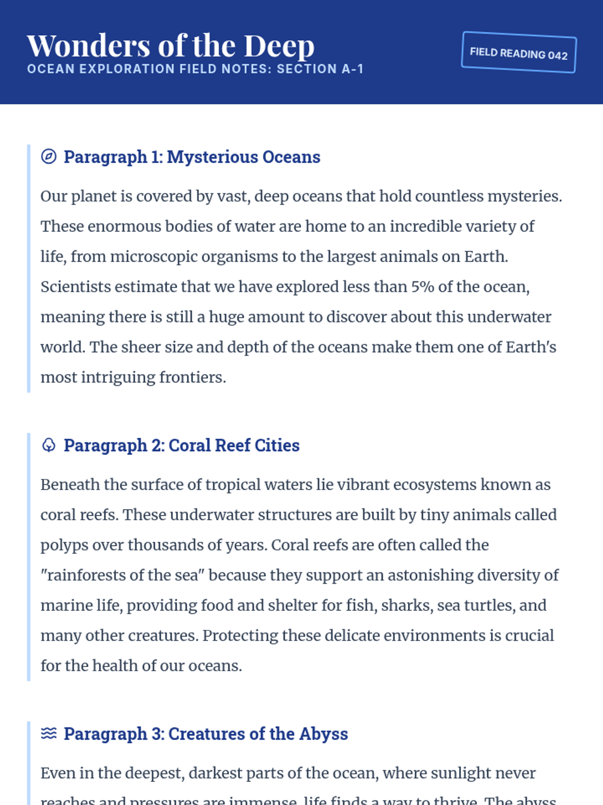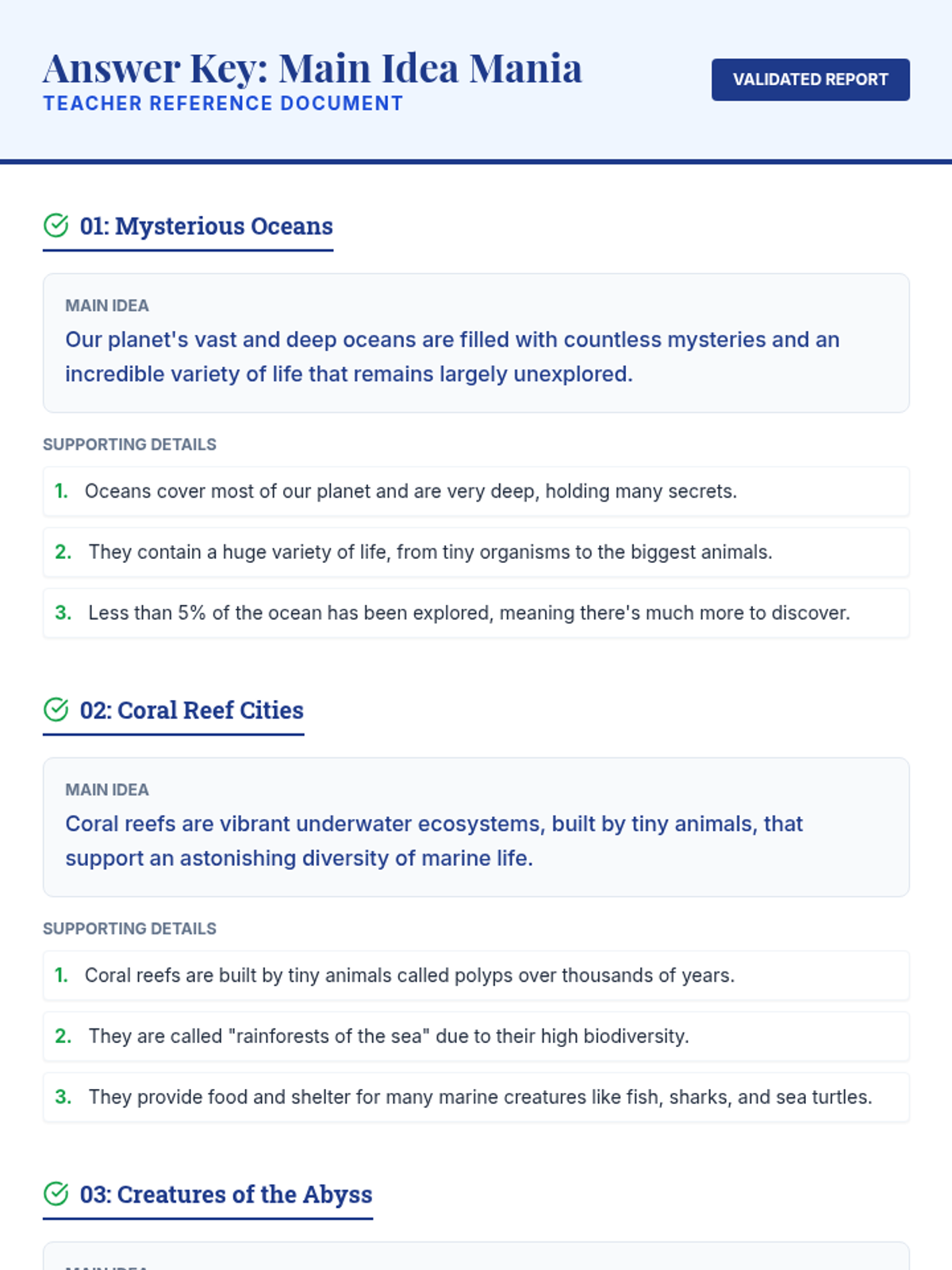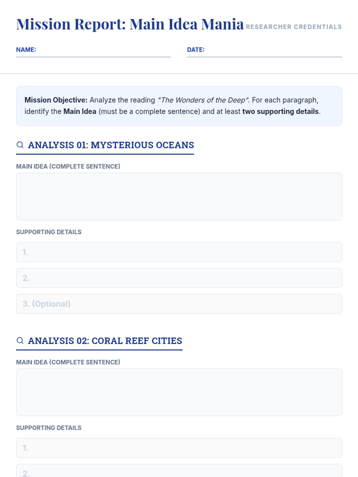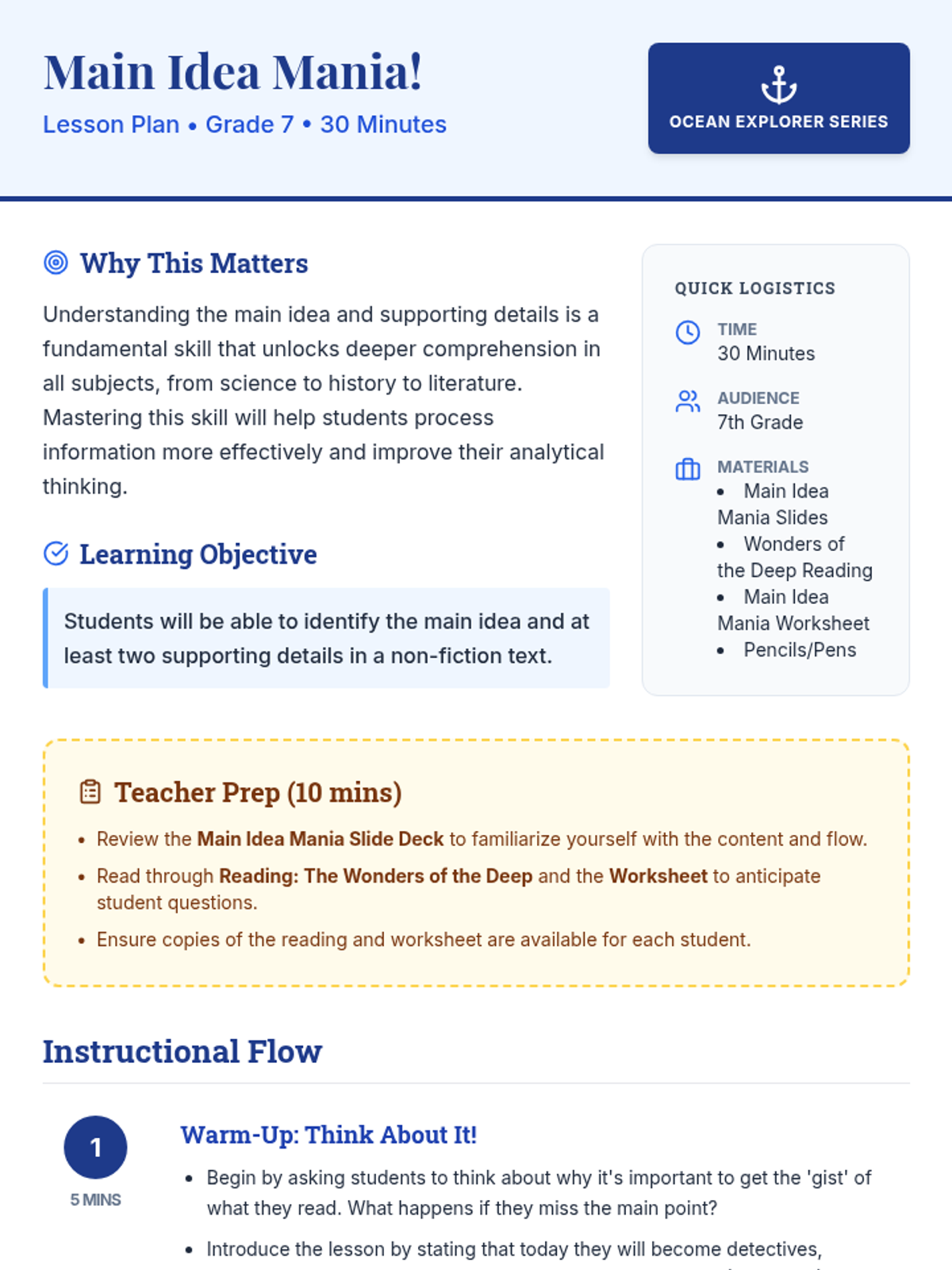 A 30-minute lesson for 7th-grade students focused on mastering the identification of main ideas and supporting details in non-fiction texts through an ocean-themed reading.