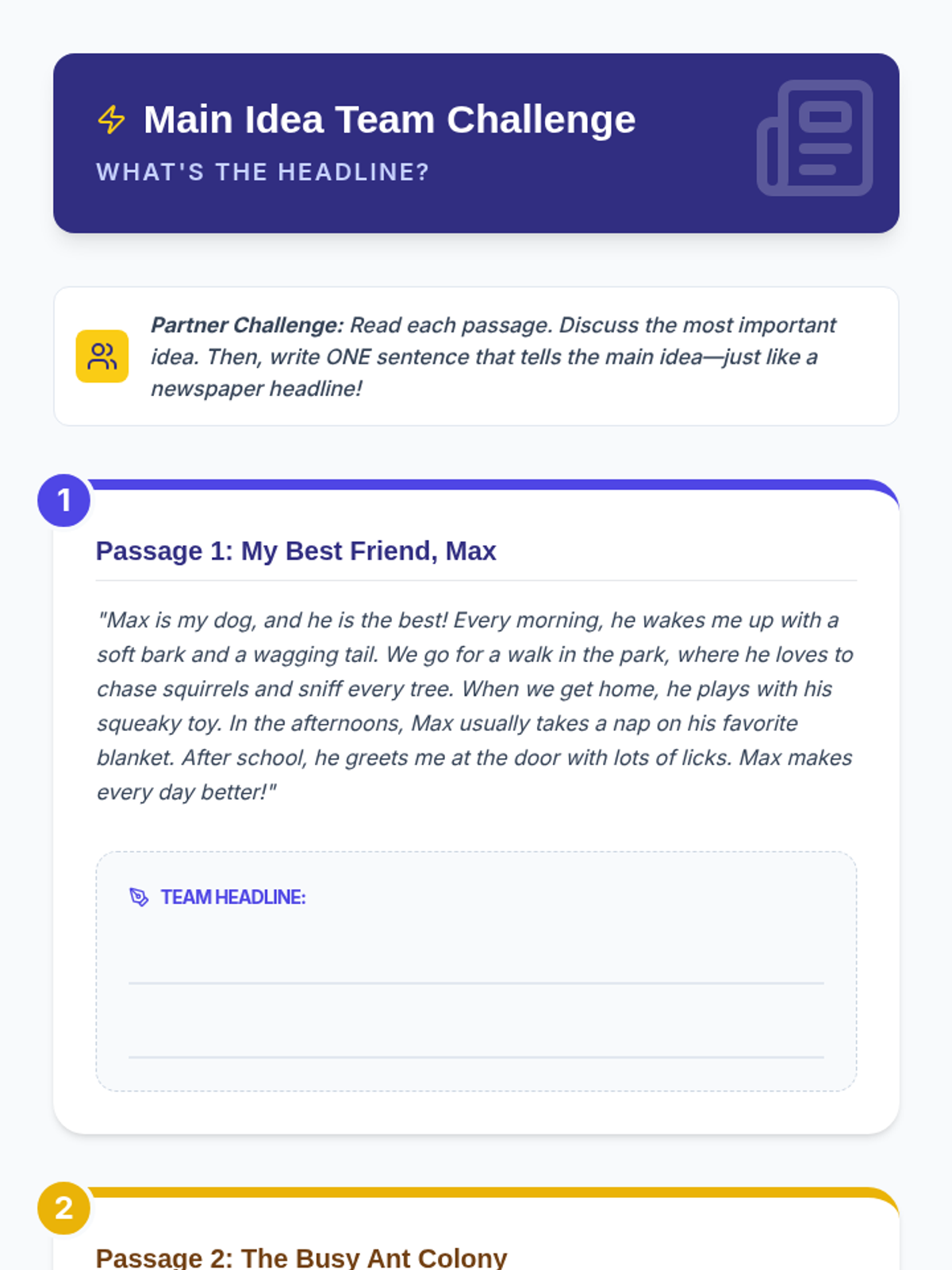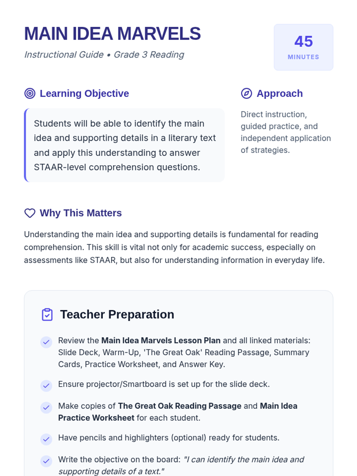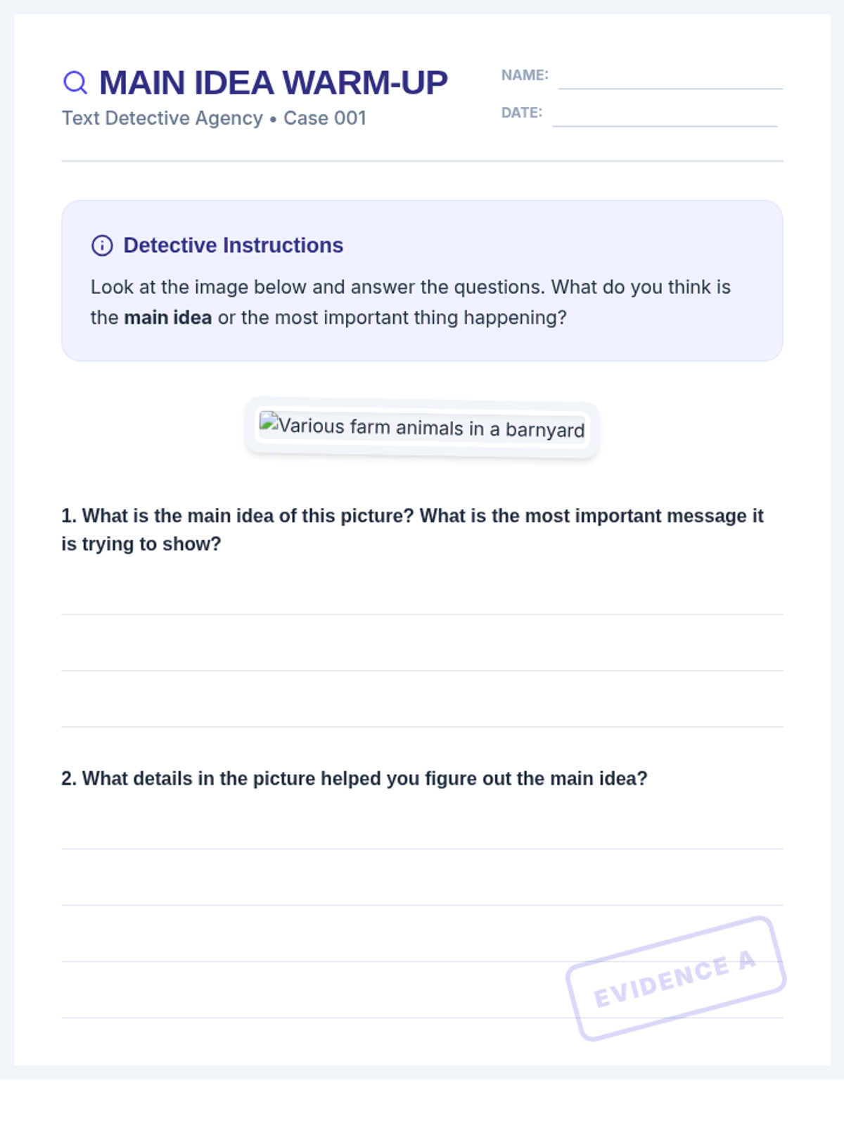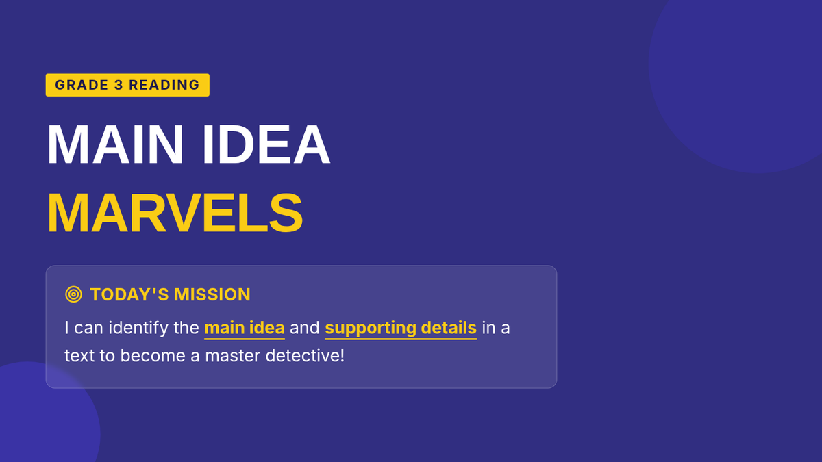 A comprehensive 3rd-grade lesson focusing on identifying main ideas and supporting details. Students act as text detectives to uncover the 'big idea' through direct instruction, a high-quality reading passage, and interactive practice.