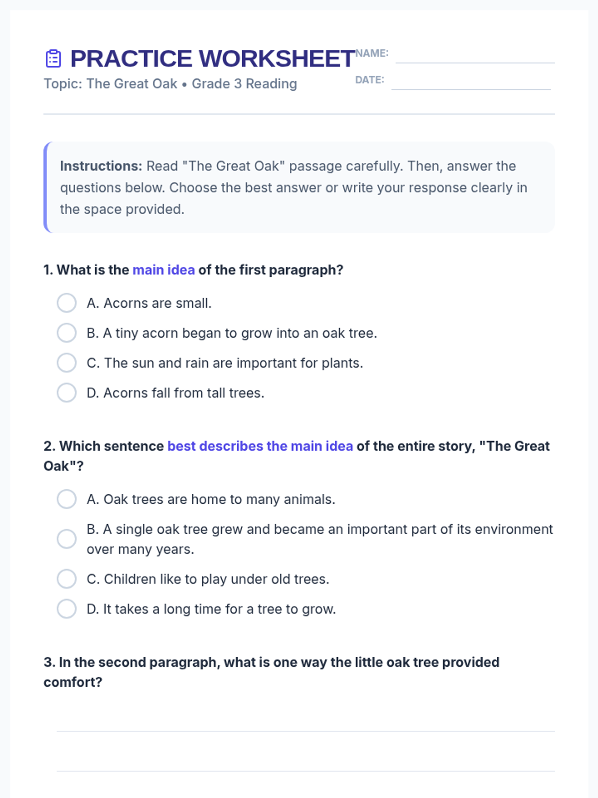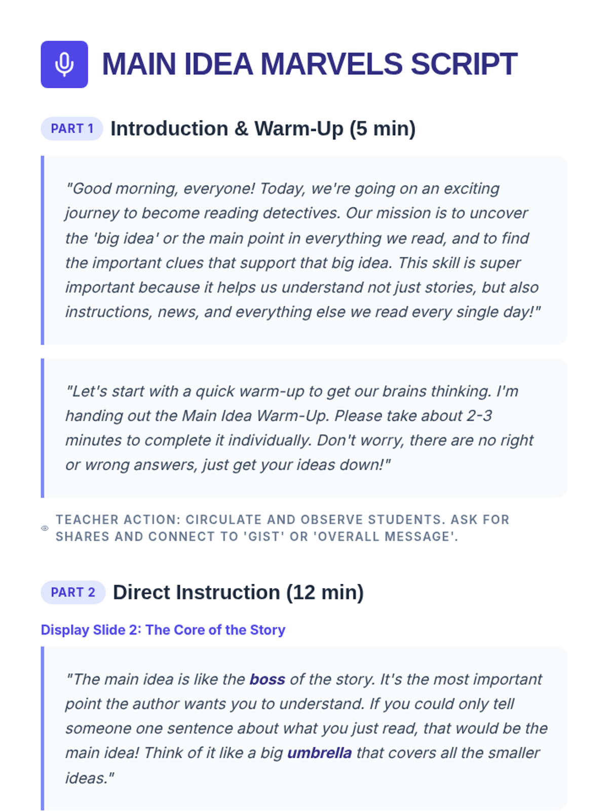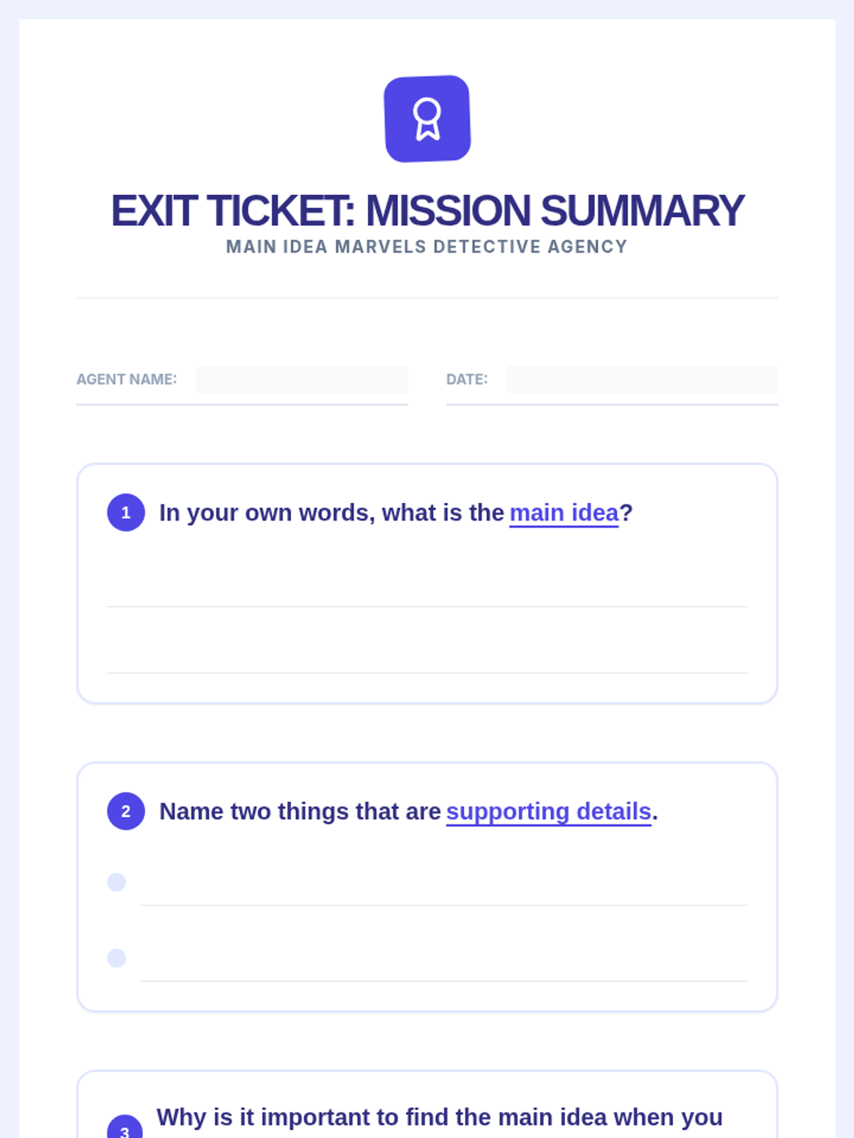 A comprehensive 3rd-grade lesson focusing on identifying main ideas and supporting details. Students act as text detectives to uncover the 'big idea' through direct instruction, a high-quality reading passage, and interactive practice.