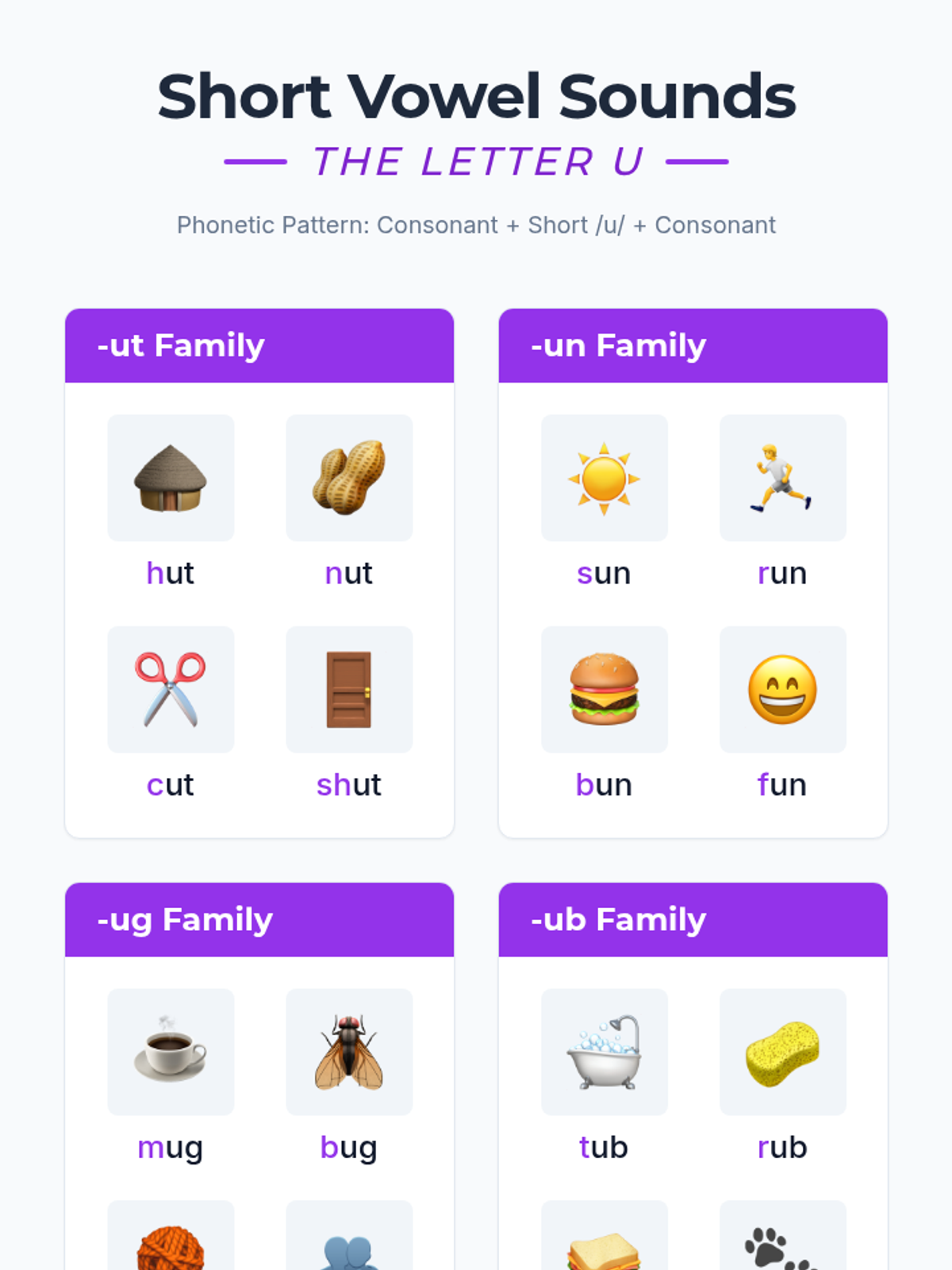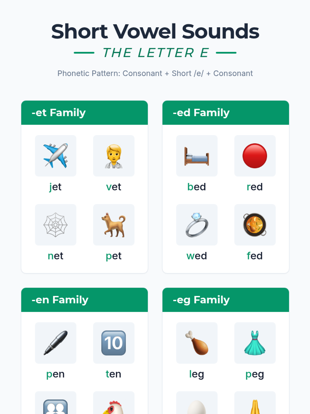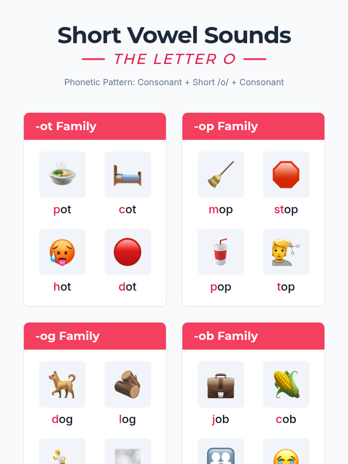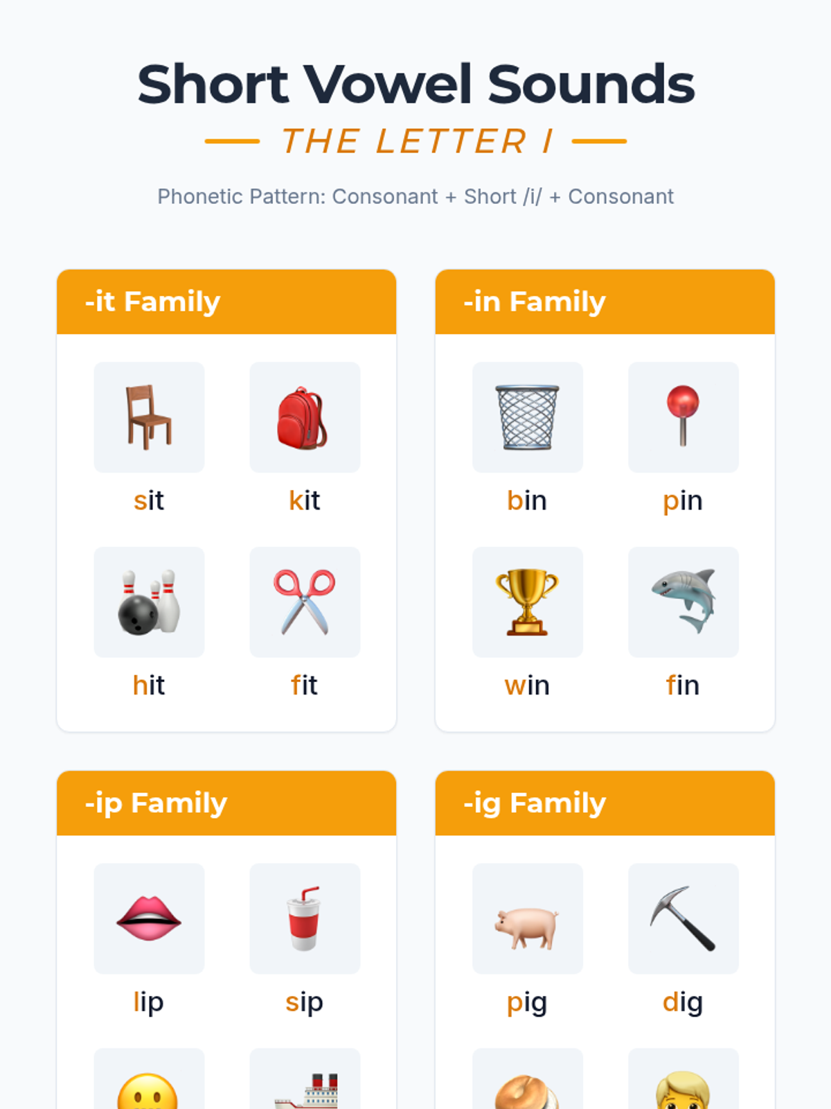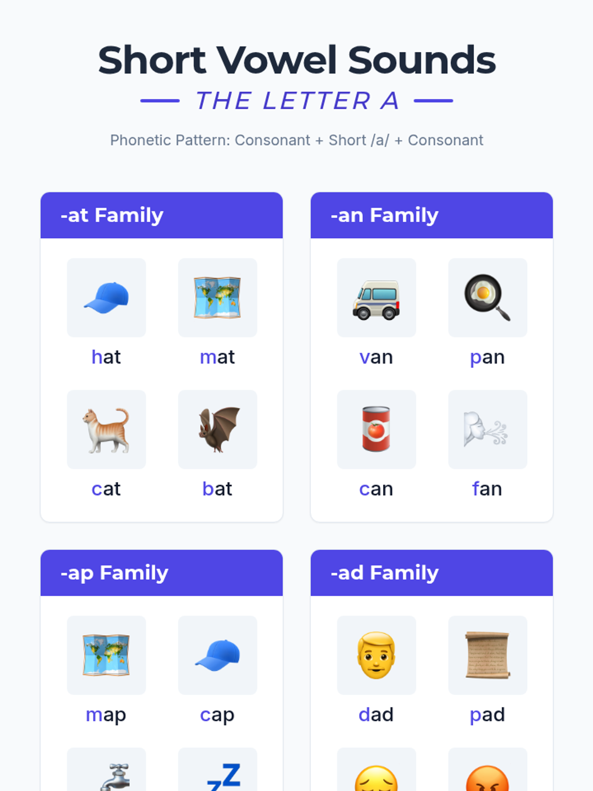 A comprehensive set of visual posters and practice materials for mastering short vowel CVC word families, tailored for adult learners.