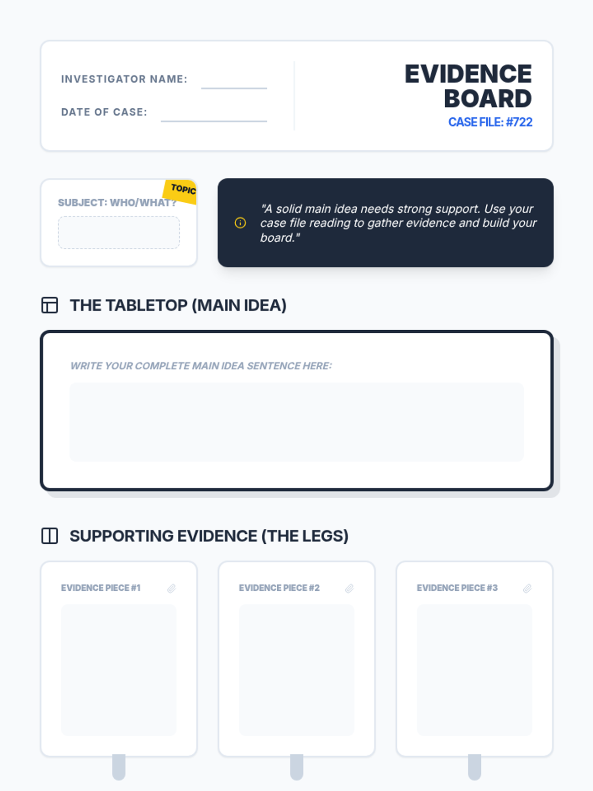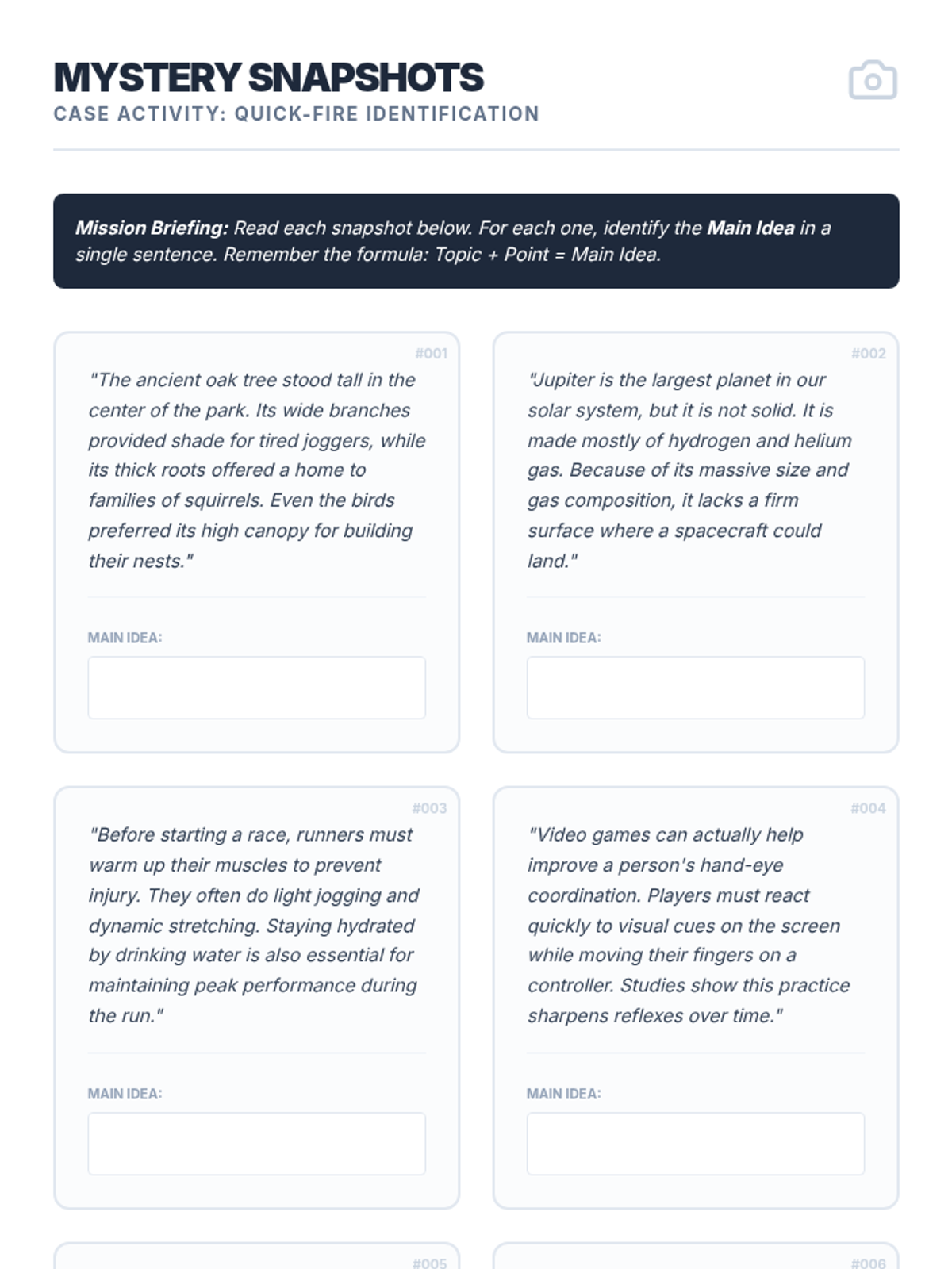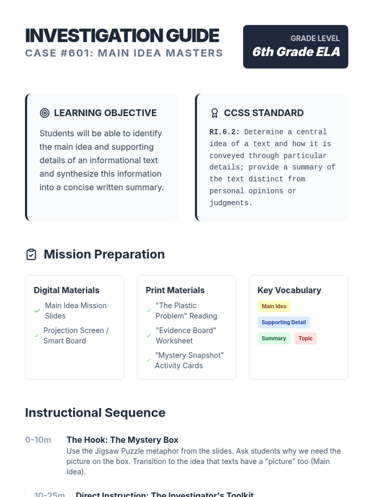 A scaffolded 6th-grade ELA lesson focused on identifying main ideas and supporting details in informational and literary texts using graphic organizers and peer collaboration.