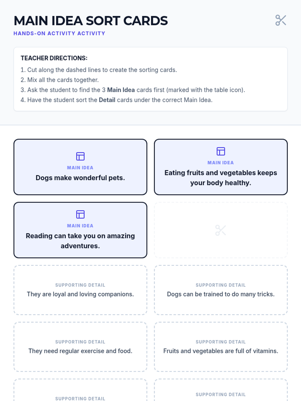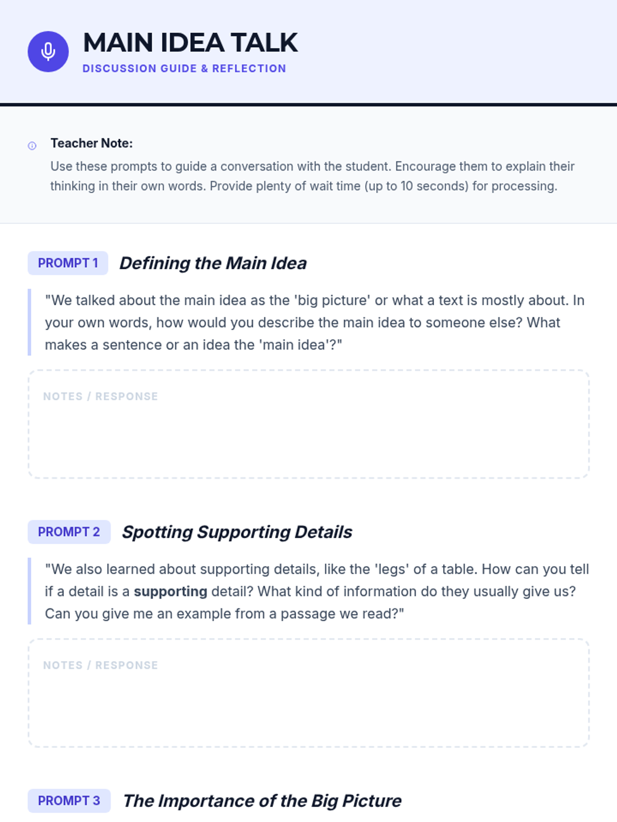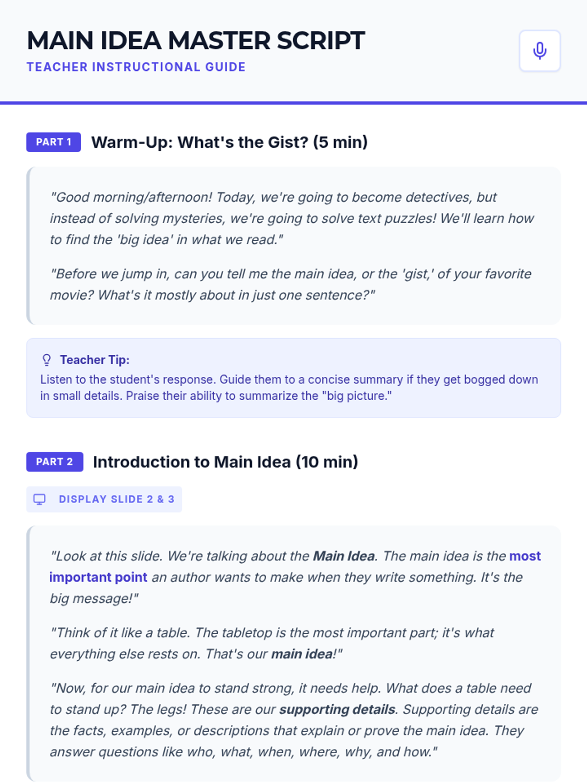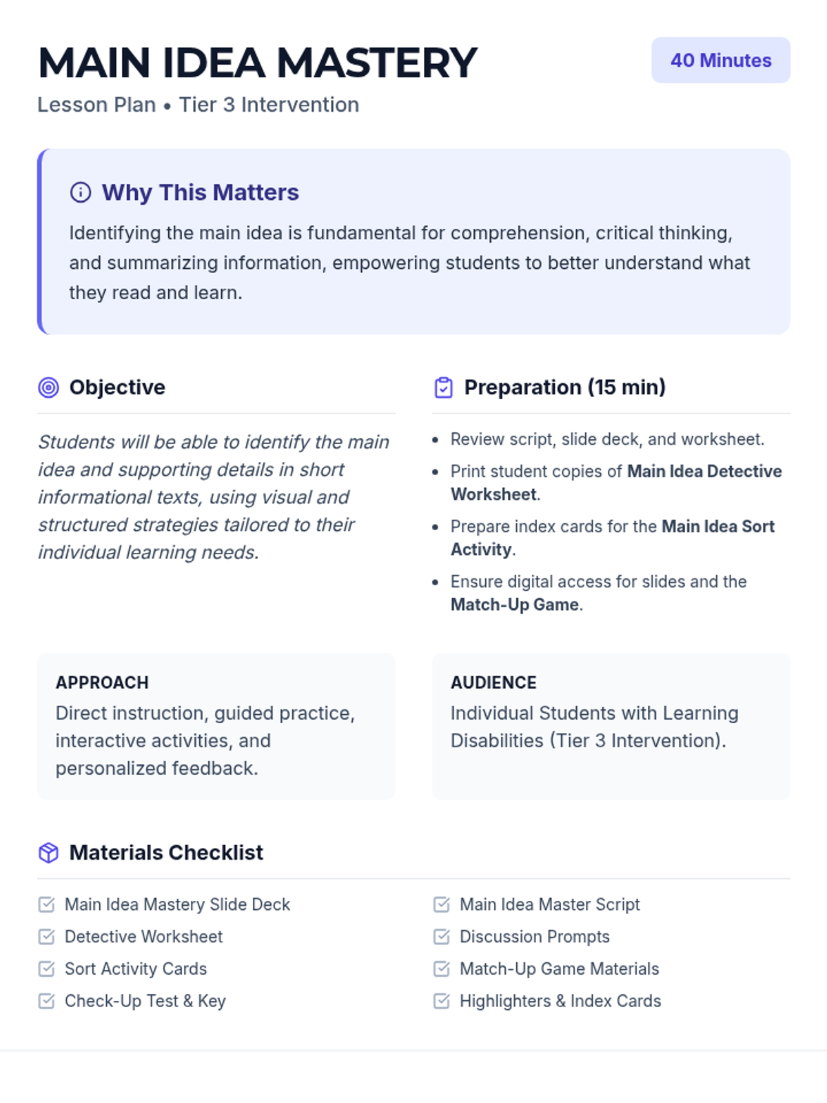 A intensive Tier 3 lesson designed for individual students to master identifying the main idea and supporting details using visual strategies and explicit instruction.