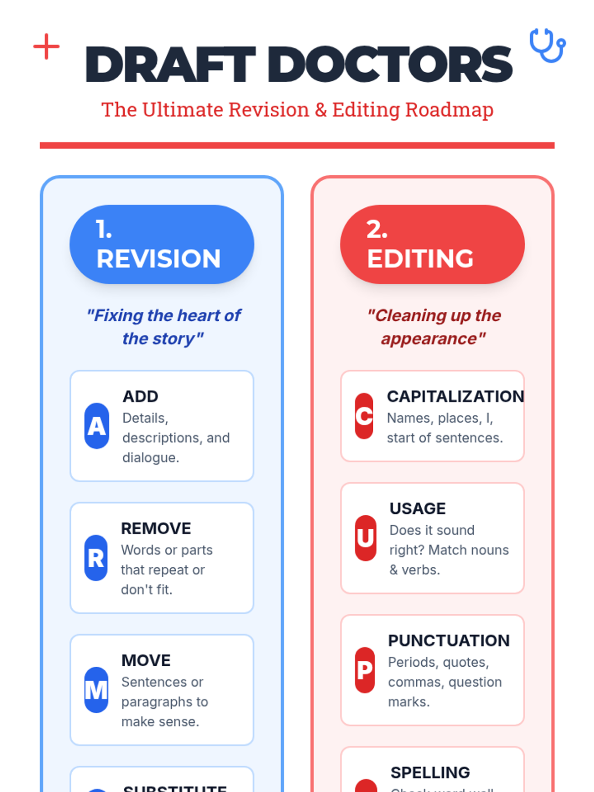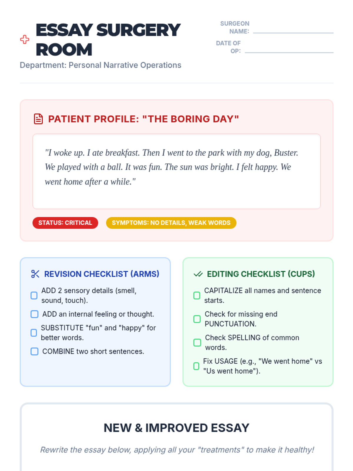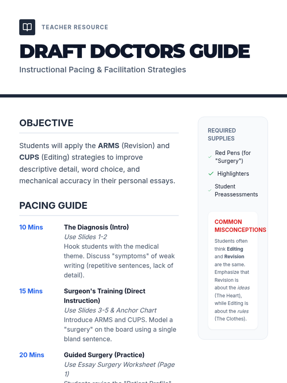 A lesson where students learn to 'diagnose' and 'treat' common writing issues in their personal essays using the ARMS and CUPS strategies. Students practice on a sample 'sick' essay before operating on their own preassessment drafts.