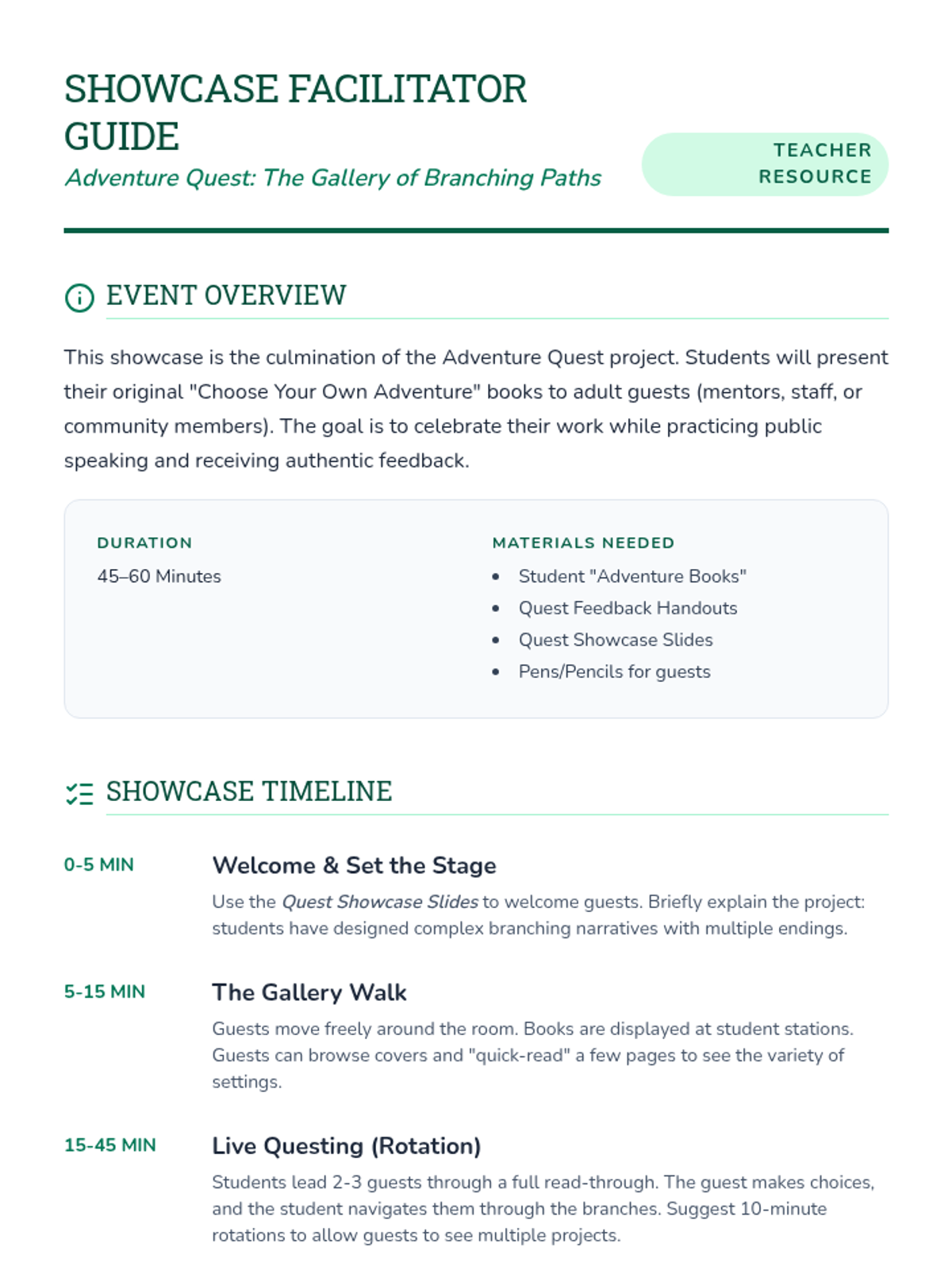 A lesson focused on presenting original Choose Your Own Adventure books to an audience, incorporating adult feedback and student reflection.