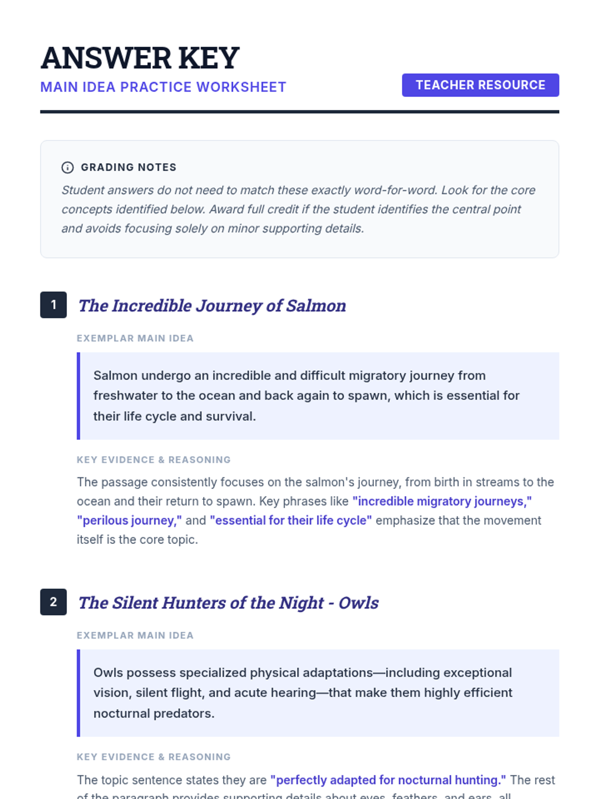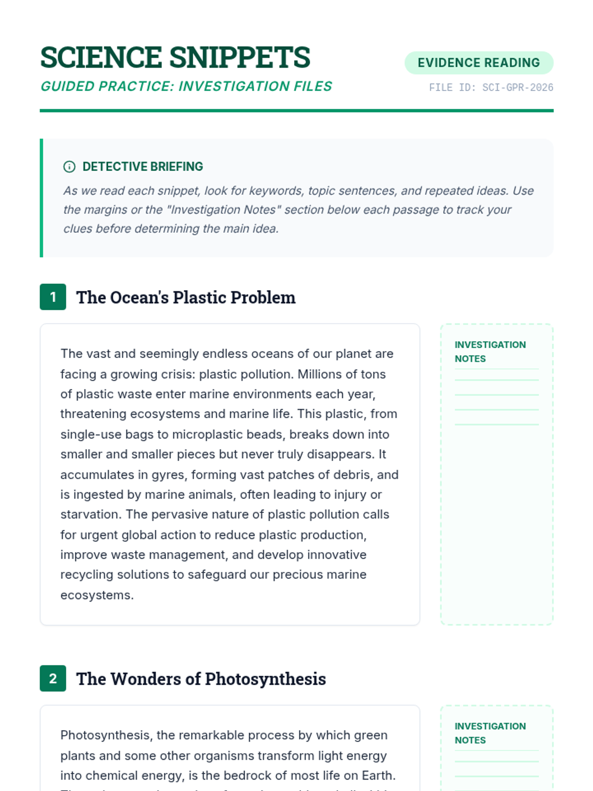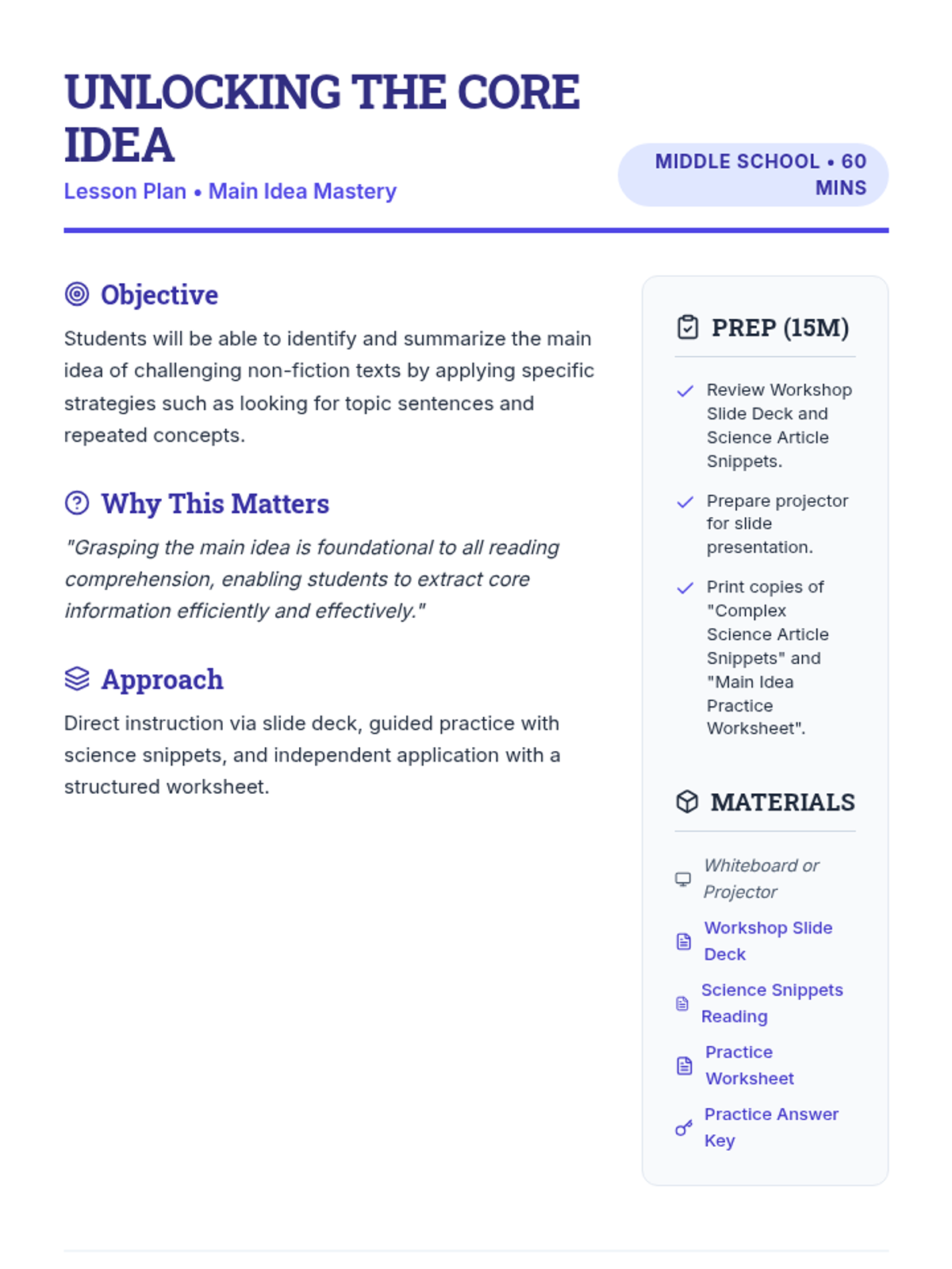A 60-minute reading comprehension lesson for middle schoolers focused on identifying and summarizing main ideas in non-fiction texts. Students move from direct instruction to guided practice with science articles and finally to independent application.