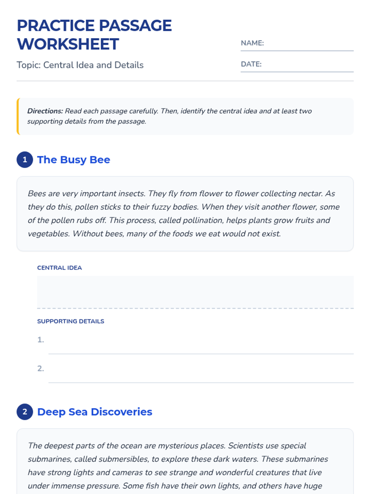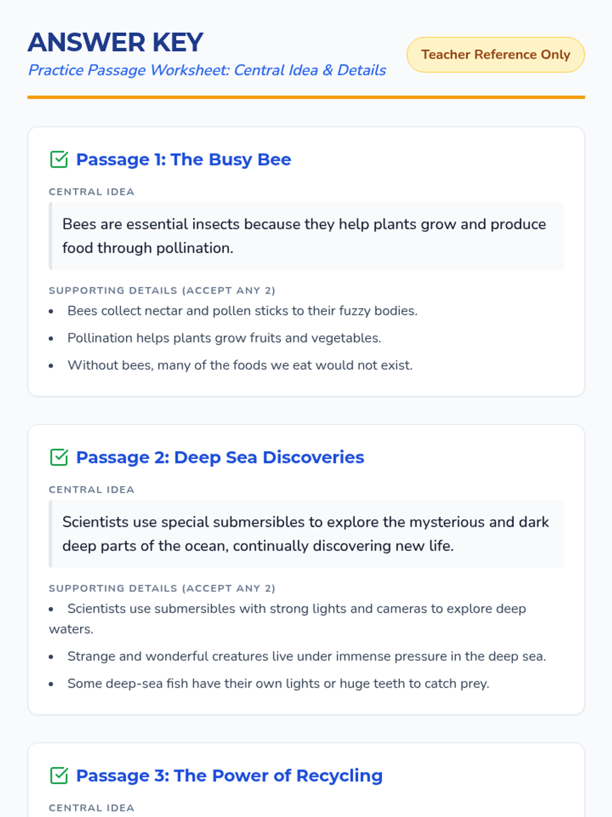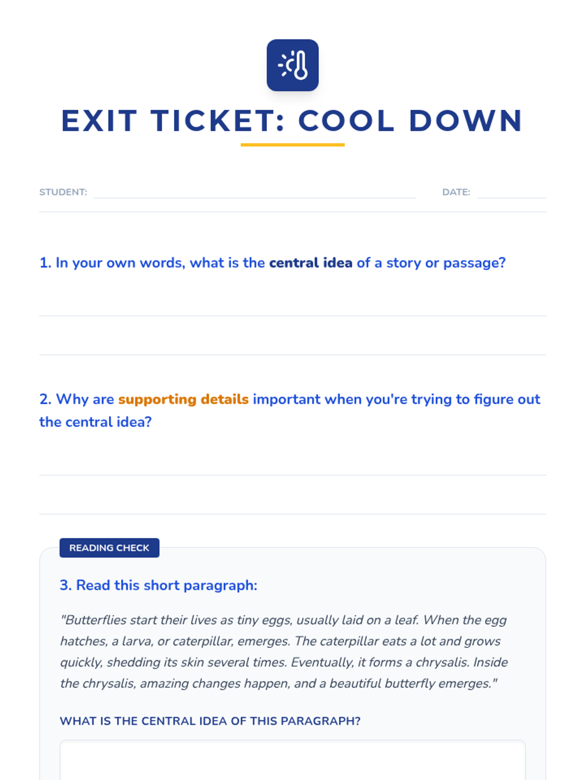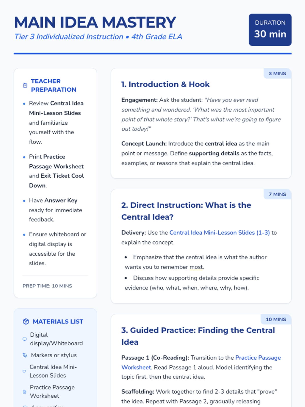 A 30-minute Tier 3 individualized lesson for 4th graders focused on identifying the central idea and supporting details in informational texts through direct instruction and guided practice.