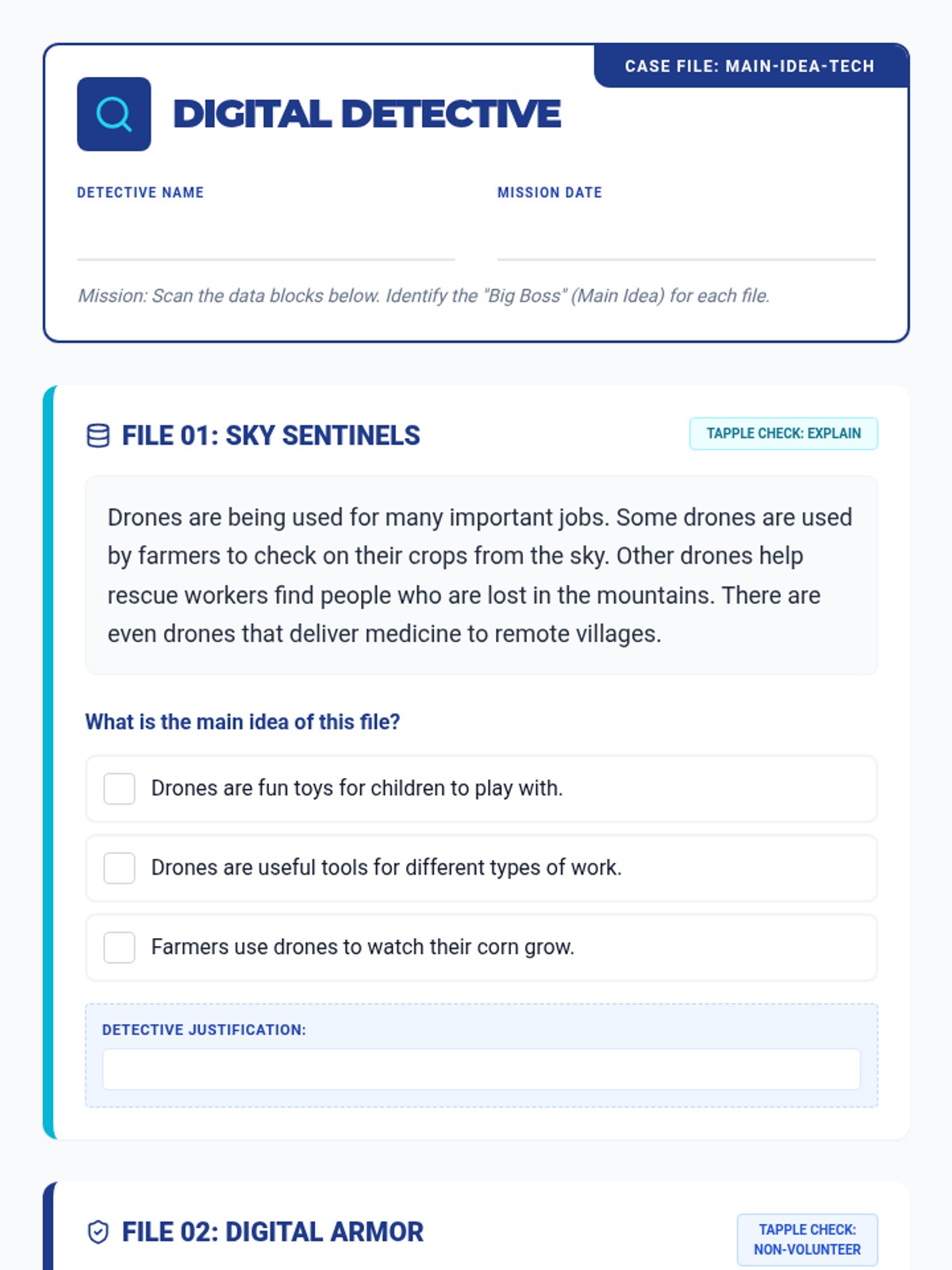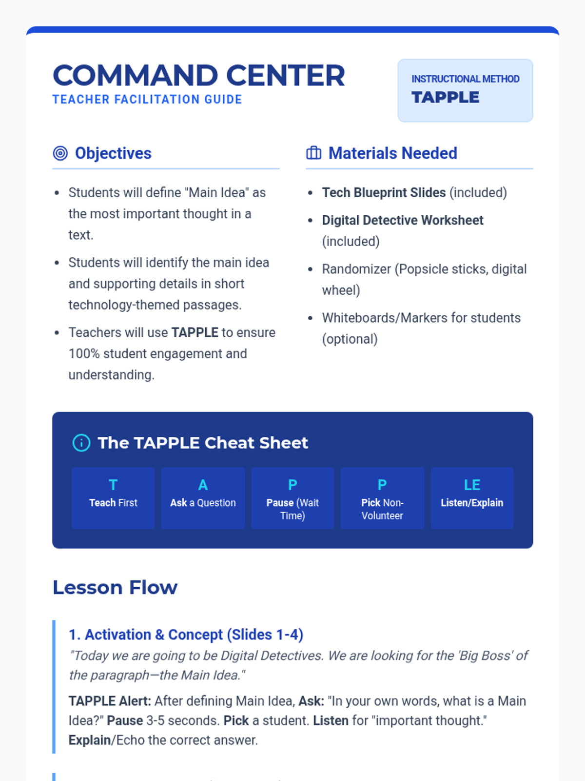 A comprehensive lesson on identifying the main idea in technology-themed texts using the TAPPLE instructional method for checking for understanding.