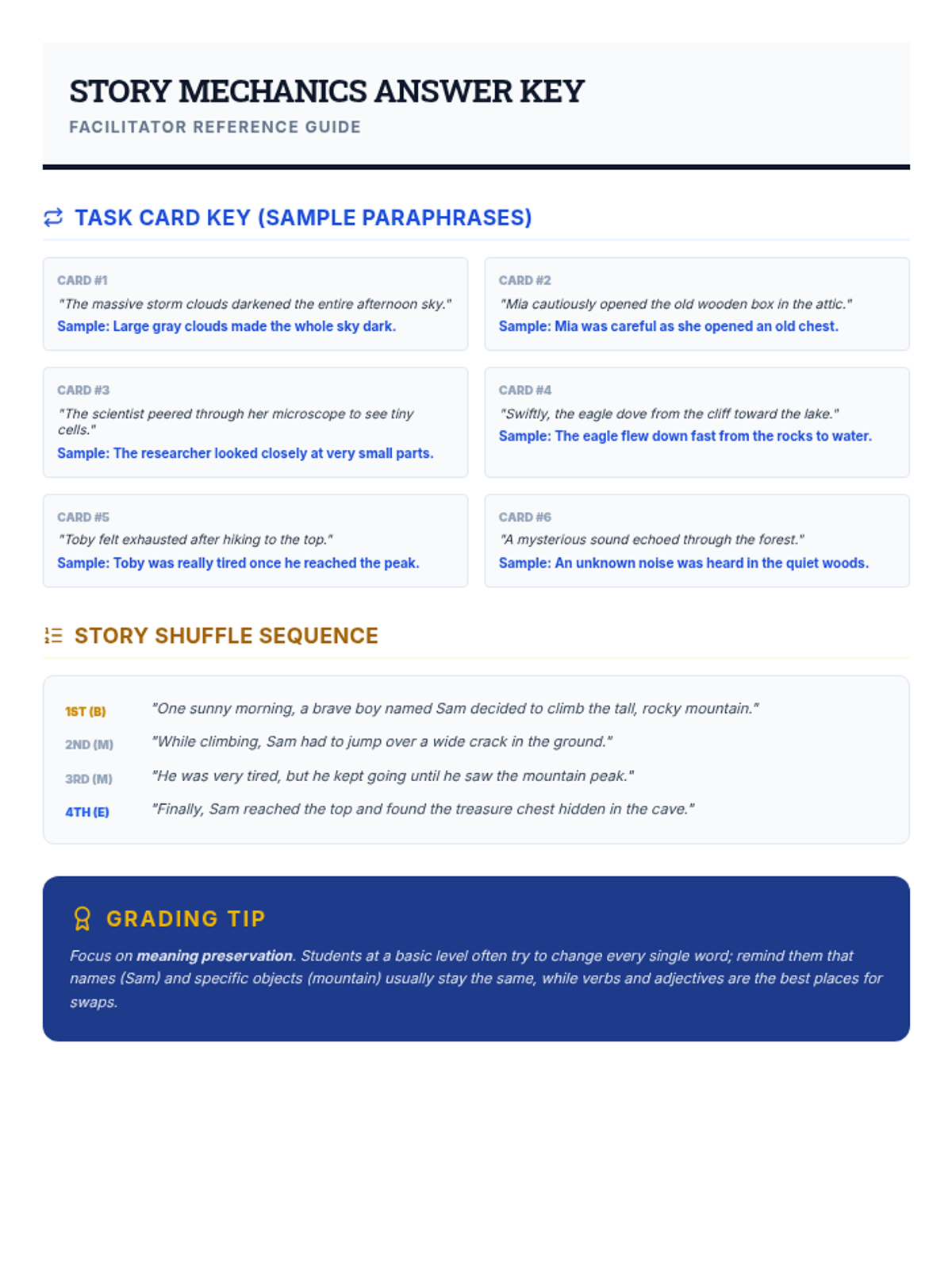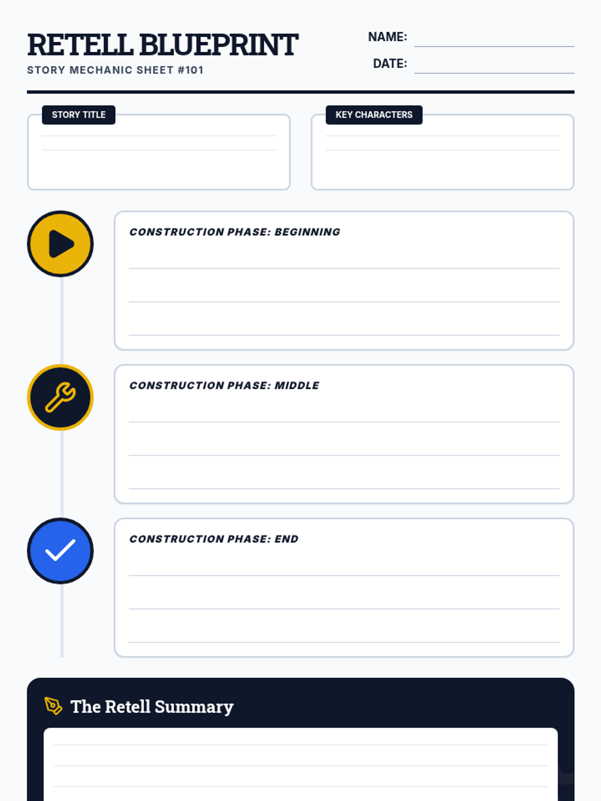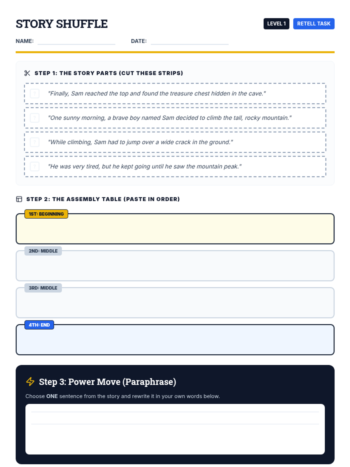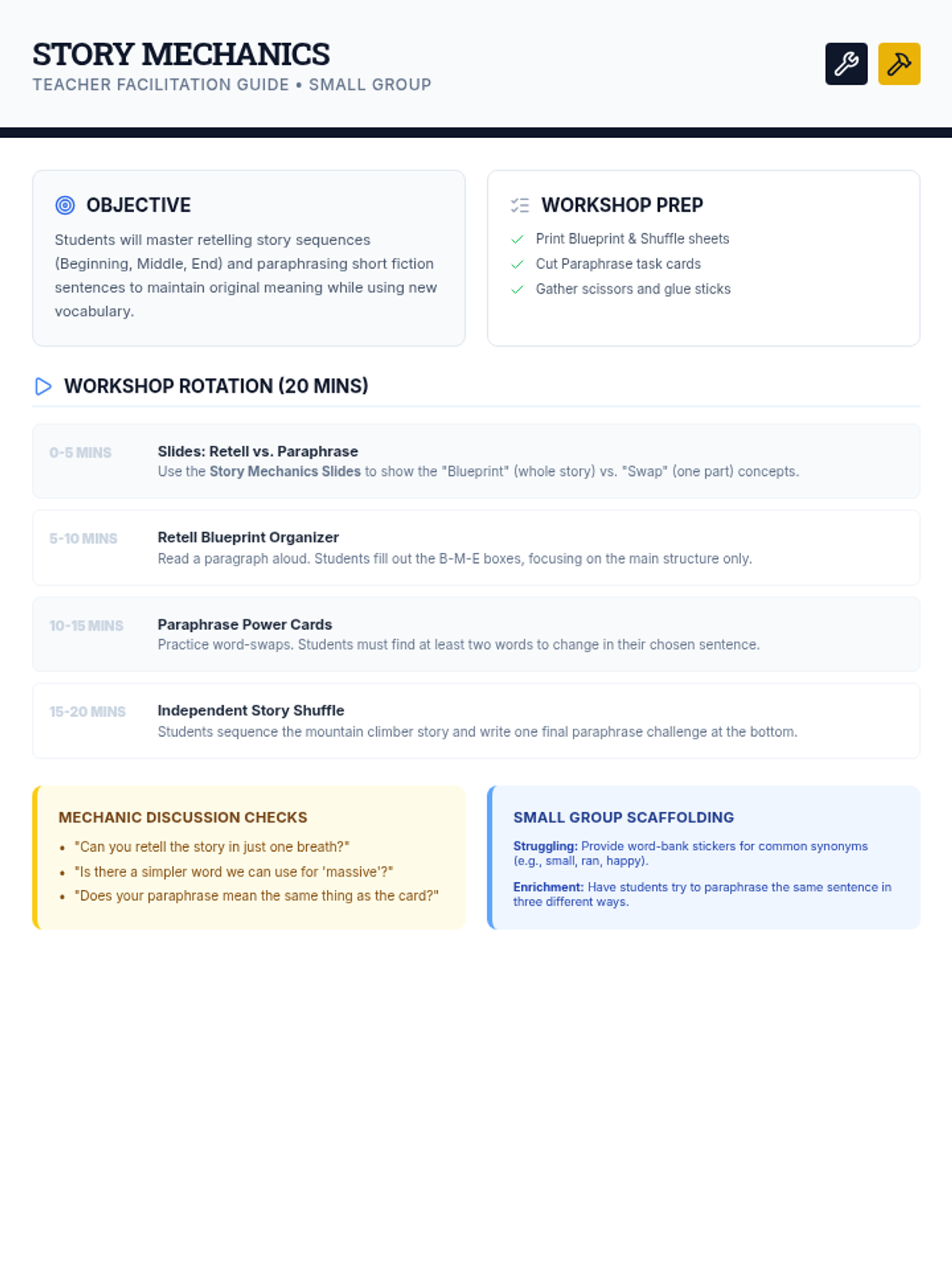 A comprehensive small-group lesson focused on the foundational skills of retelling and paraphrasing using short fiction. Students use blueprint-themed tools to identify story structure and practice restating ideas in their own words.