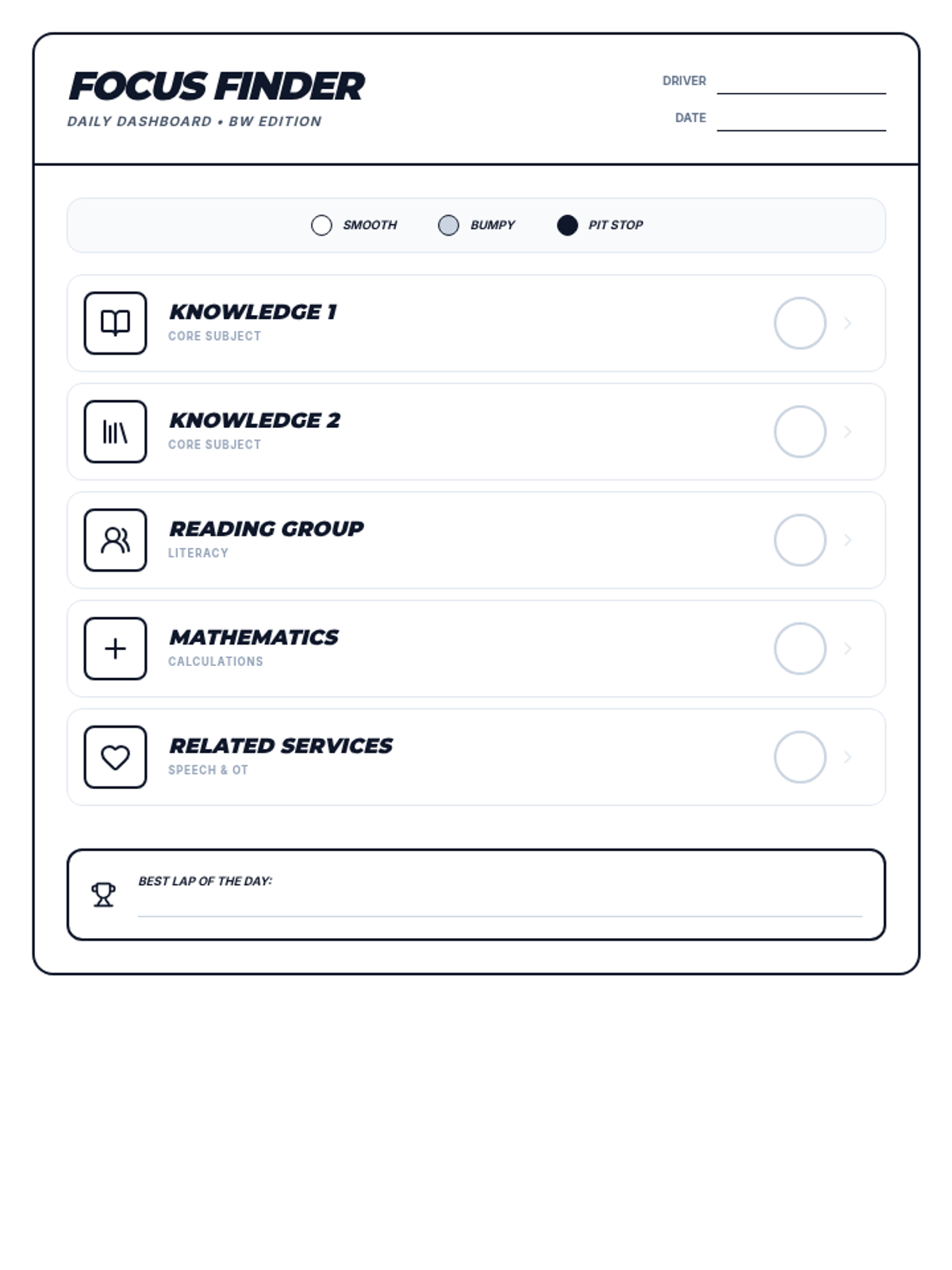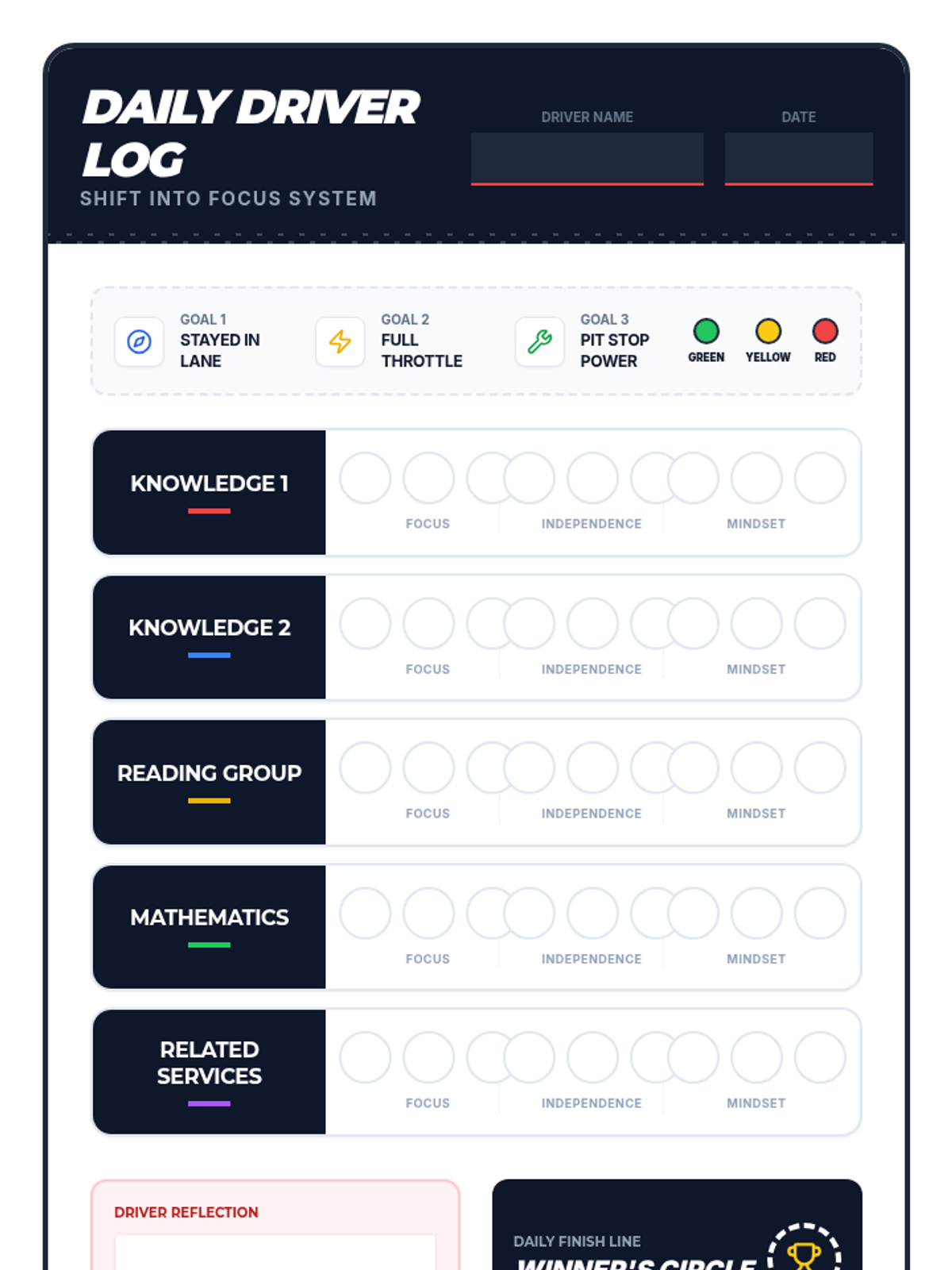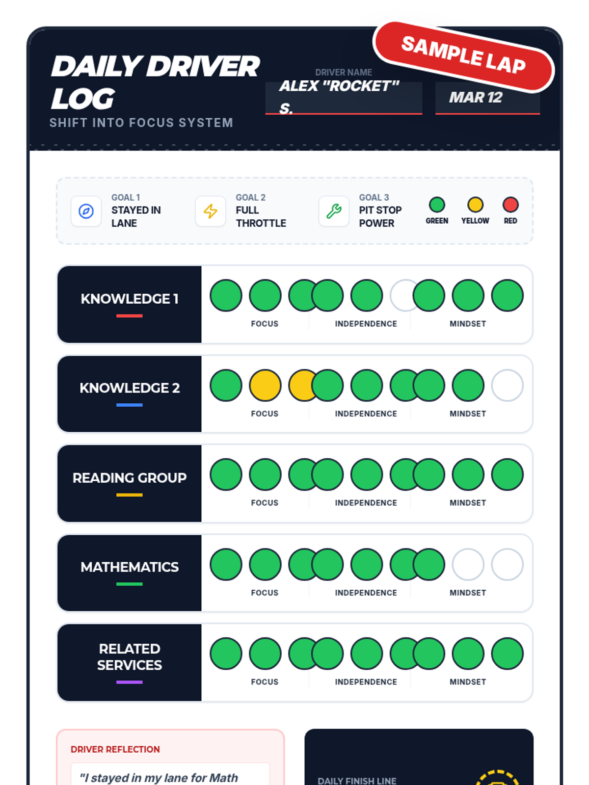 A high-octane behavior tracking system where students 'drive' through their school day, building self-awareness and focus through a racing-themed daily log.