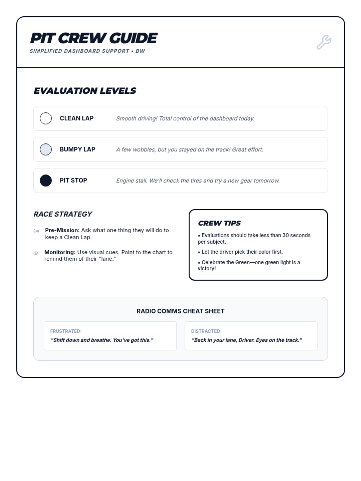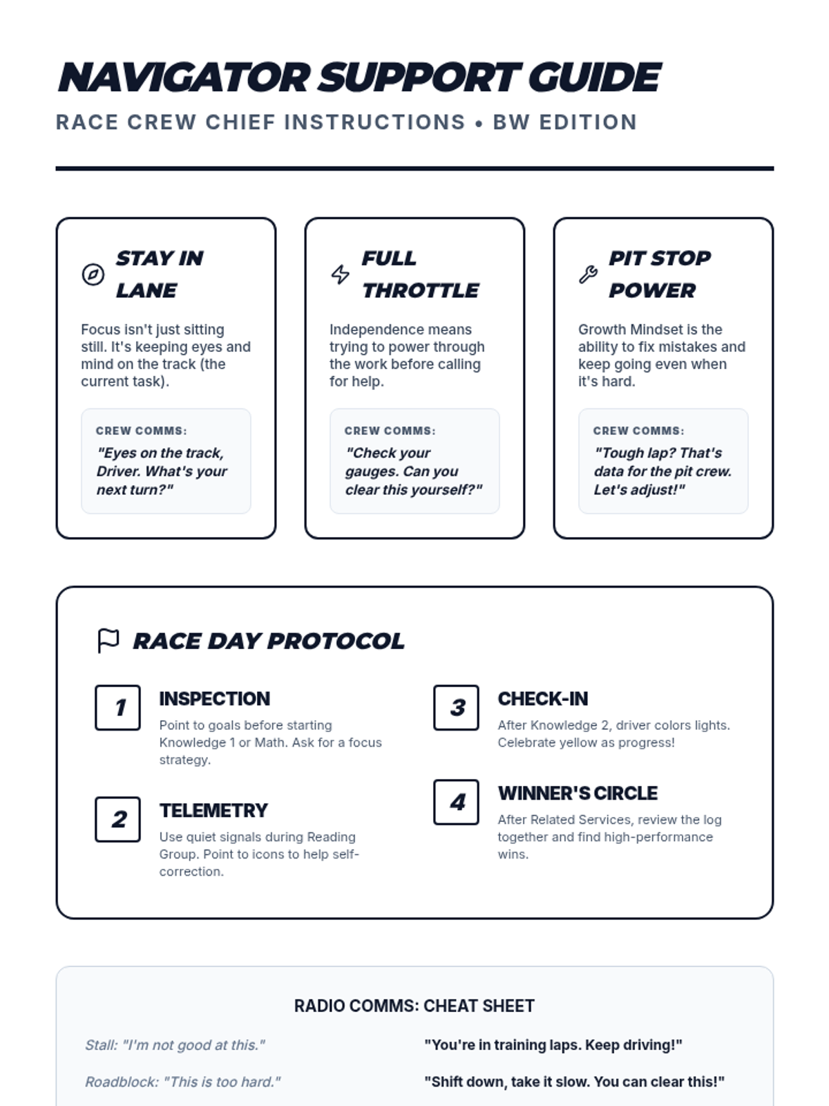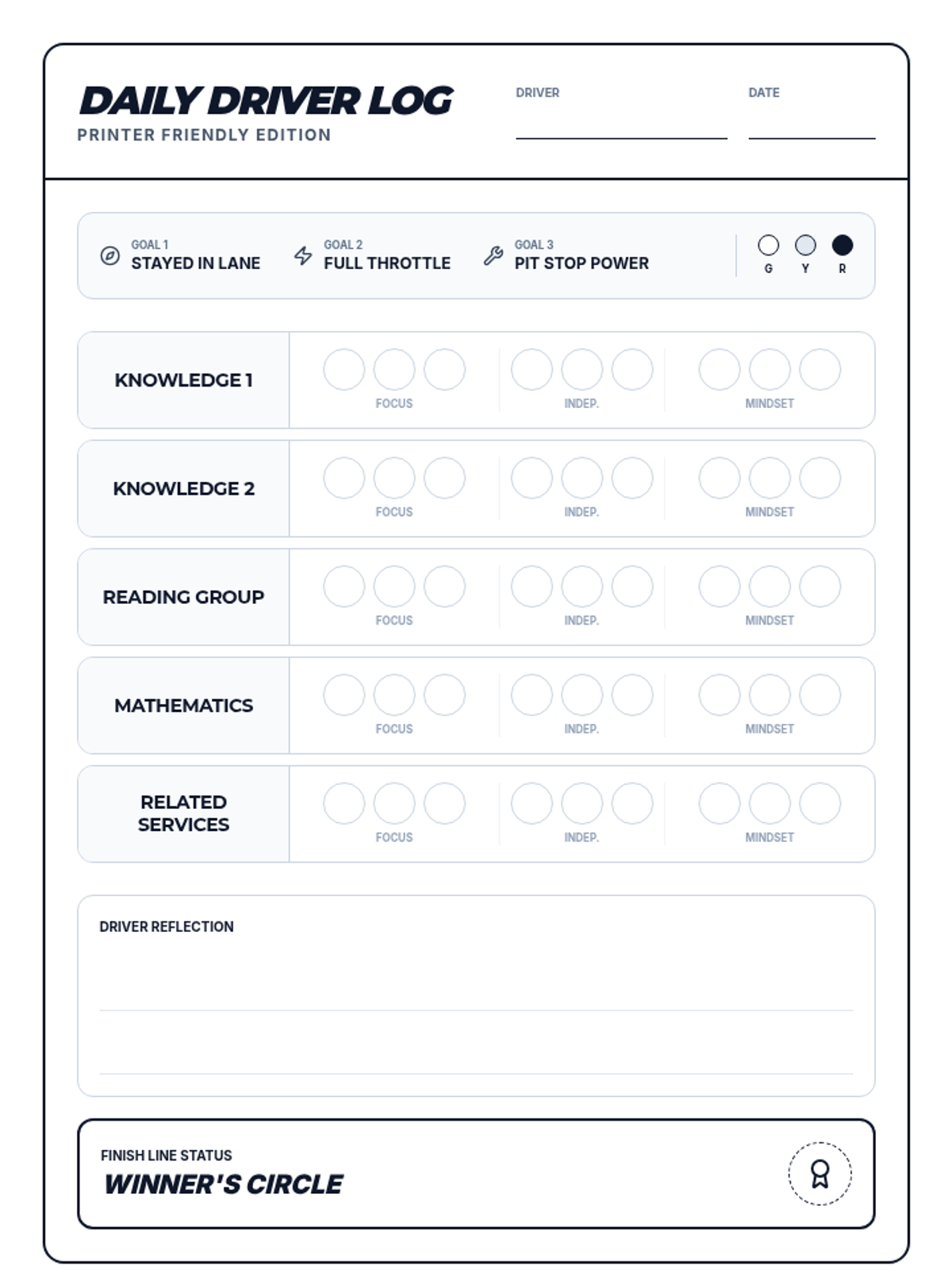 A high-octane behavior tracking system where students 'drive' through their school day, building self-awareness and focus through a racing-themed daily log.