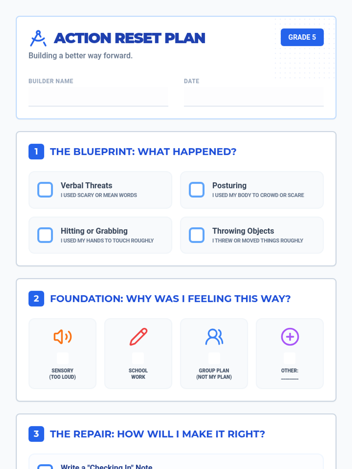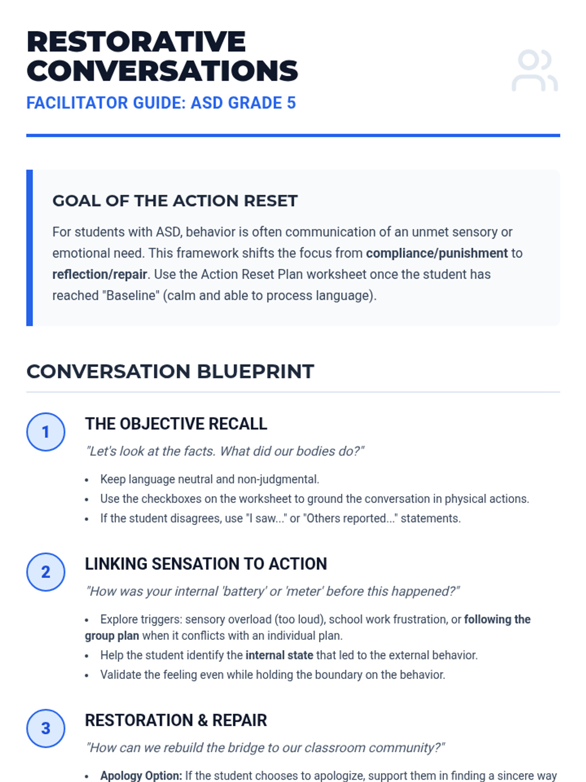 A structured restorative justice framework designed for 5th-grade students, specifically tailored for those with ASD to reflect on and repair behavioral incidents involving physical or verbal aggression.