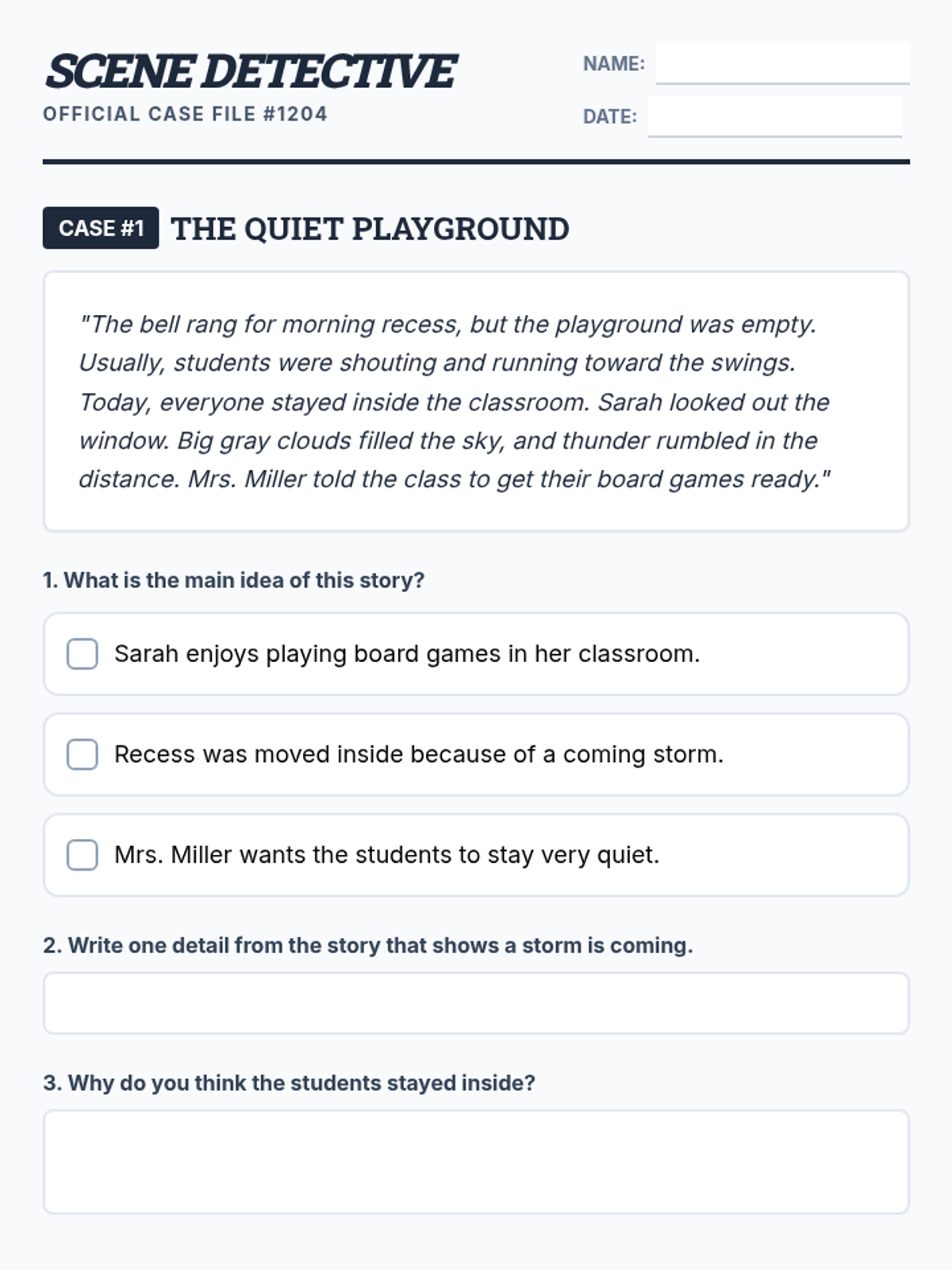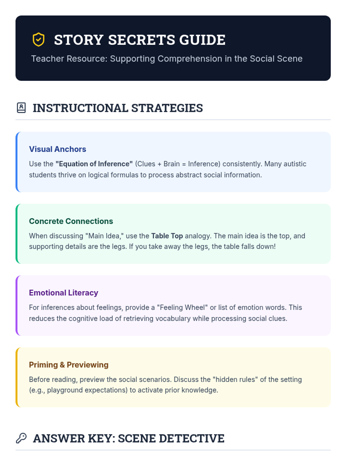 A collection of materials designed to help students with autism improve their comprehension skills through social stories and everyday scenarios. Focuses on identifying main ideas, making inferences, and predicting outcomes.