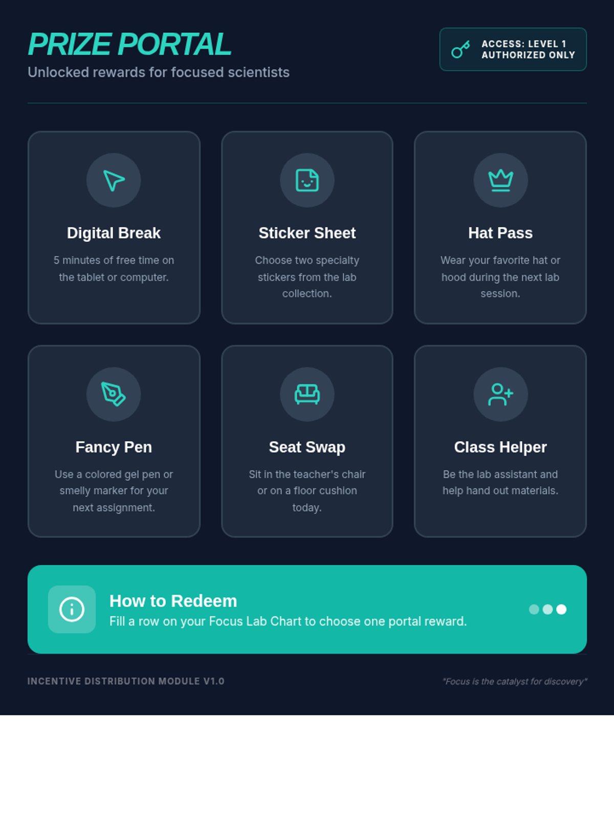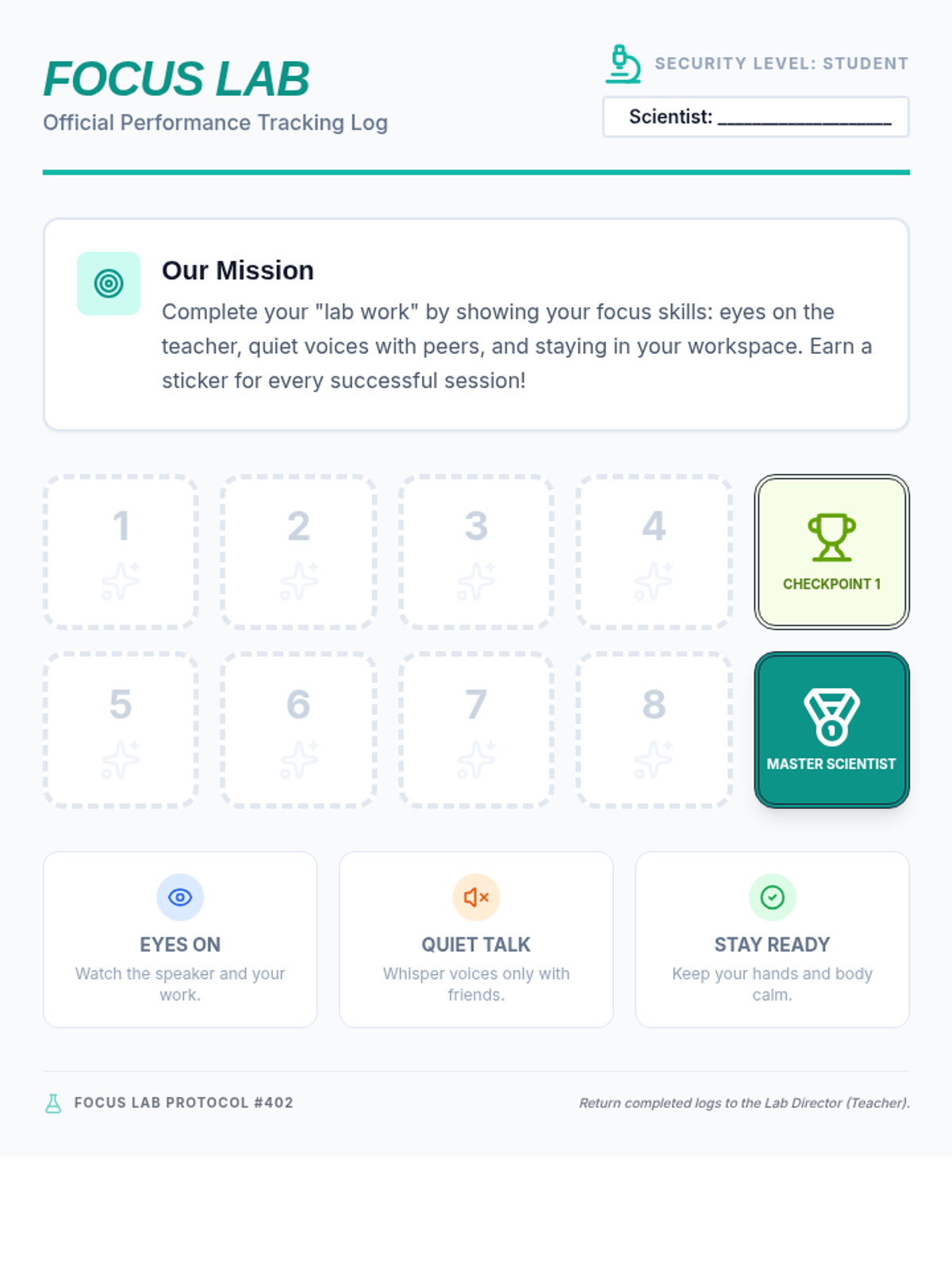 A collection of visual tools and incentive systems designed to improve student focus and behavior during small group instruction using a 'Focus Lab' theme.