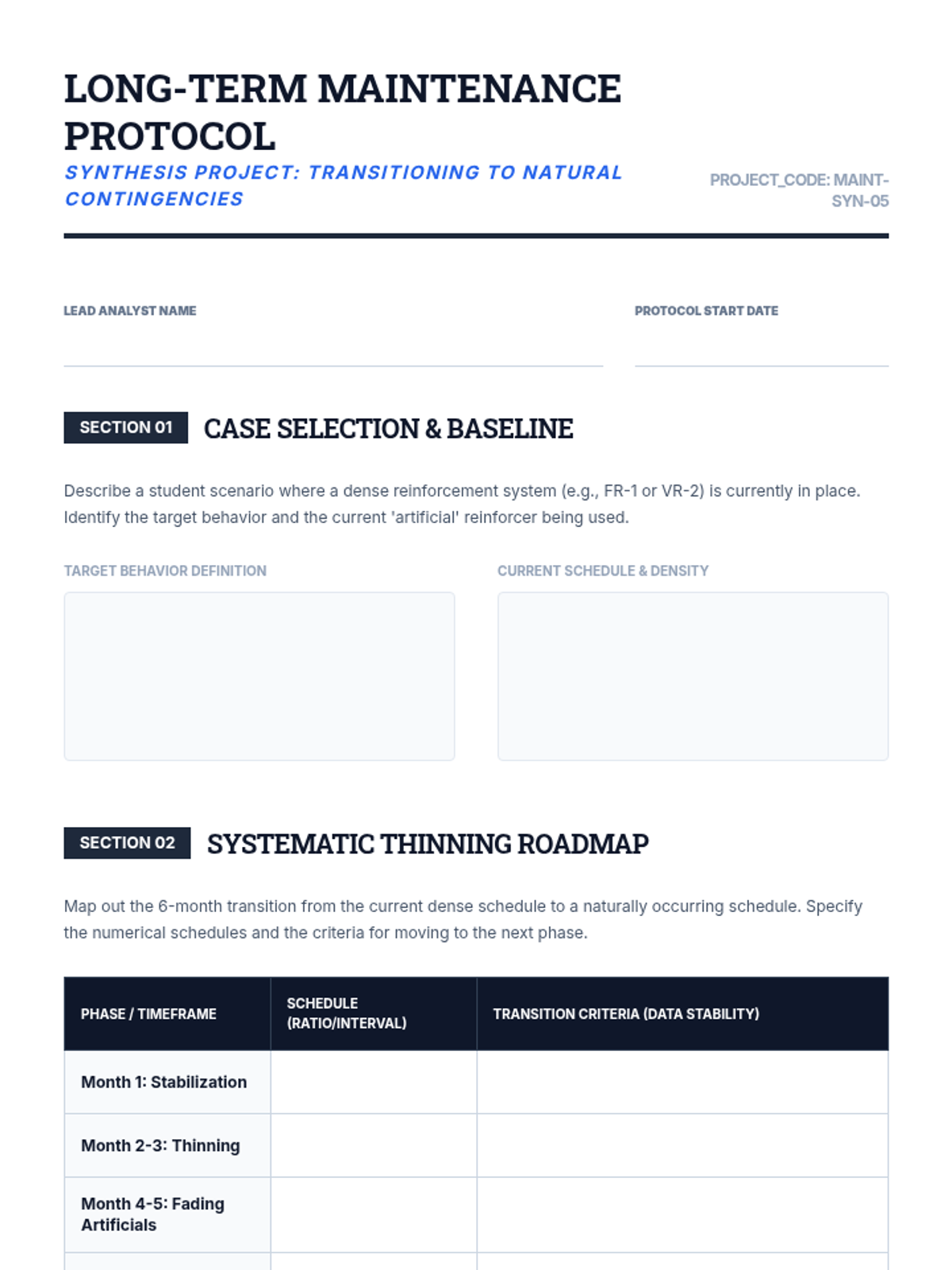 Synthesize learning to design ecologically valid maintenance protocols that move from dense reinforcement to naturally occurring contingencies.