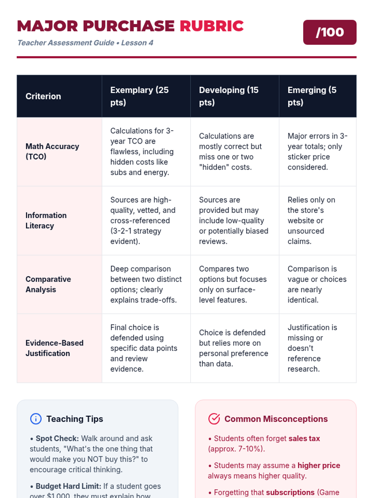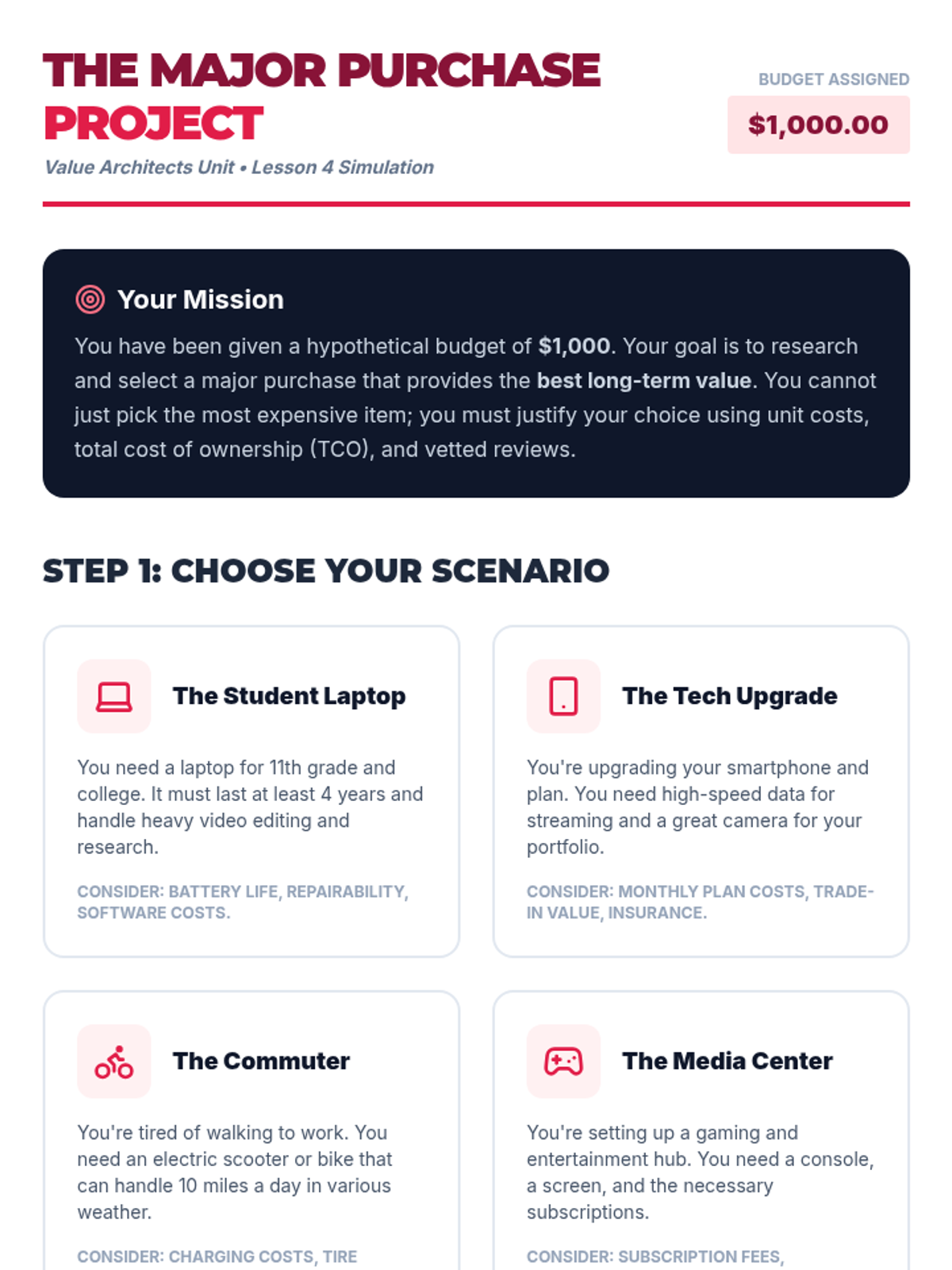Students are assigned a budget and a requirement (e.g., buying a laptop for college). They must research options, compare specs and prices across retailers, and justify their final choice.