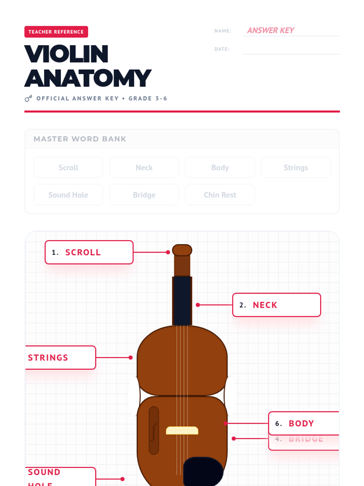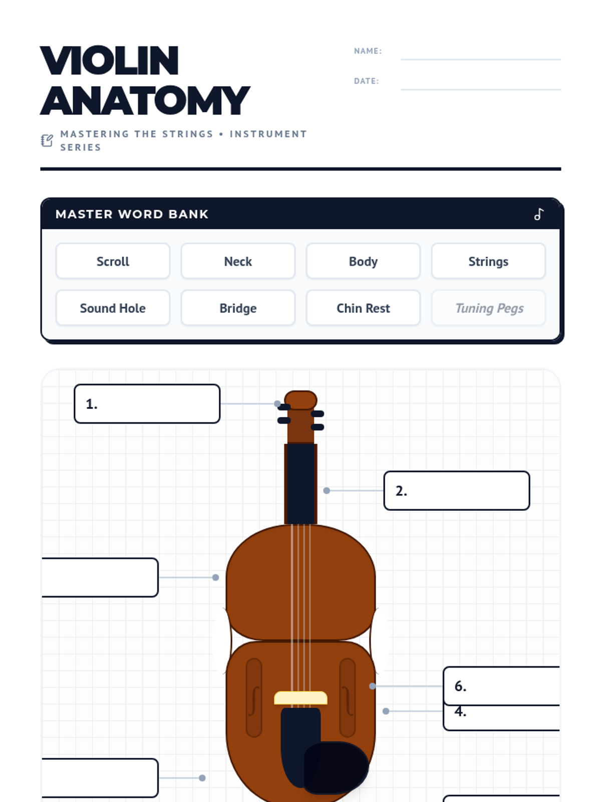 An introductory lesson on the anatomy and mechanics of the violin, including labeling parts and understanding their functions.