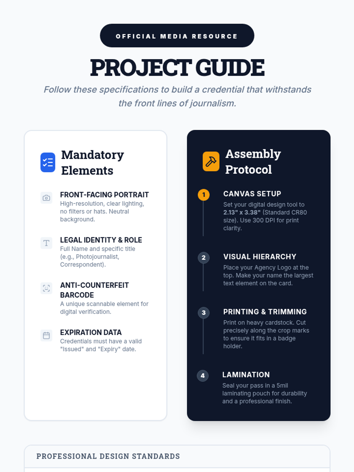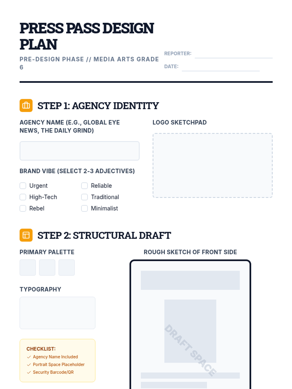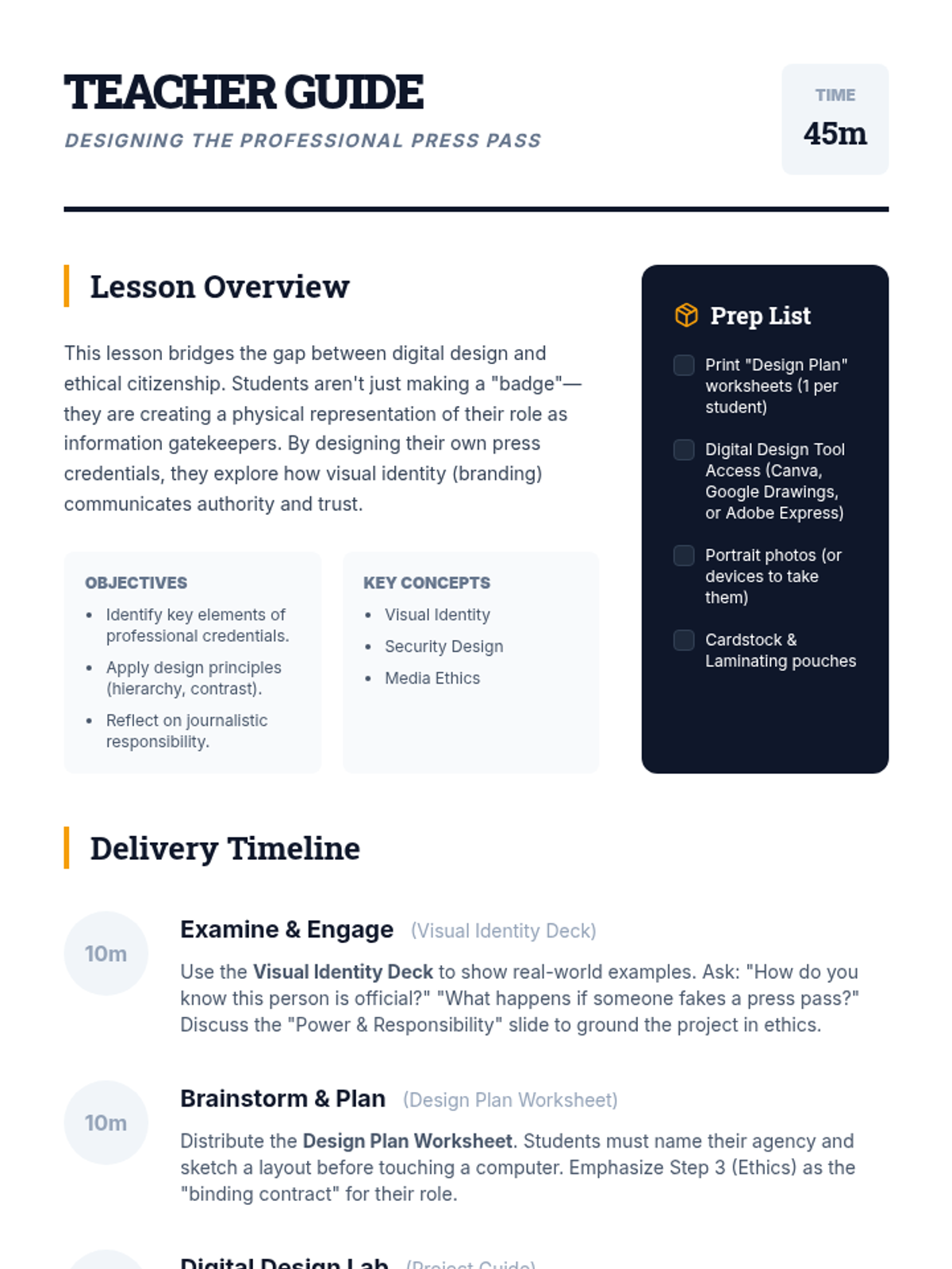 A 45-minute lesson where 6th-grade students explore the responsibility of journalism while designing their own professional press credentials, focusing on branding and identity design.