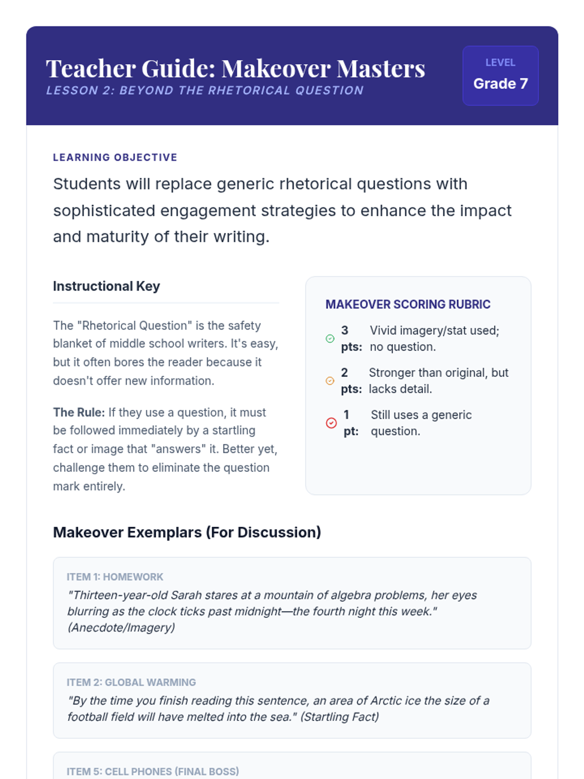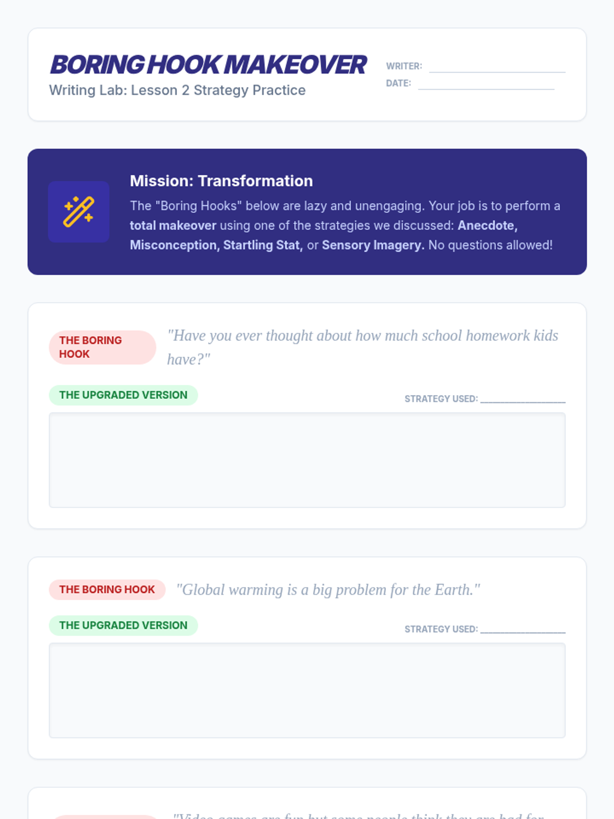 Students move beyond rhetorical questions to explore advanced hook types like anecdotes and startling statistics, practicing through a 'Boring Hook Makeover' challenge.